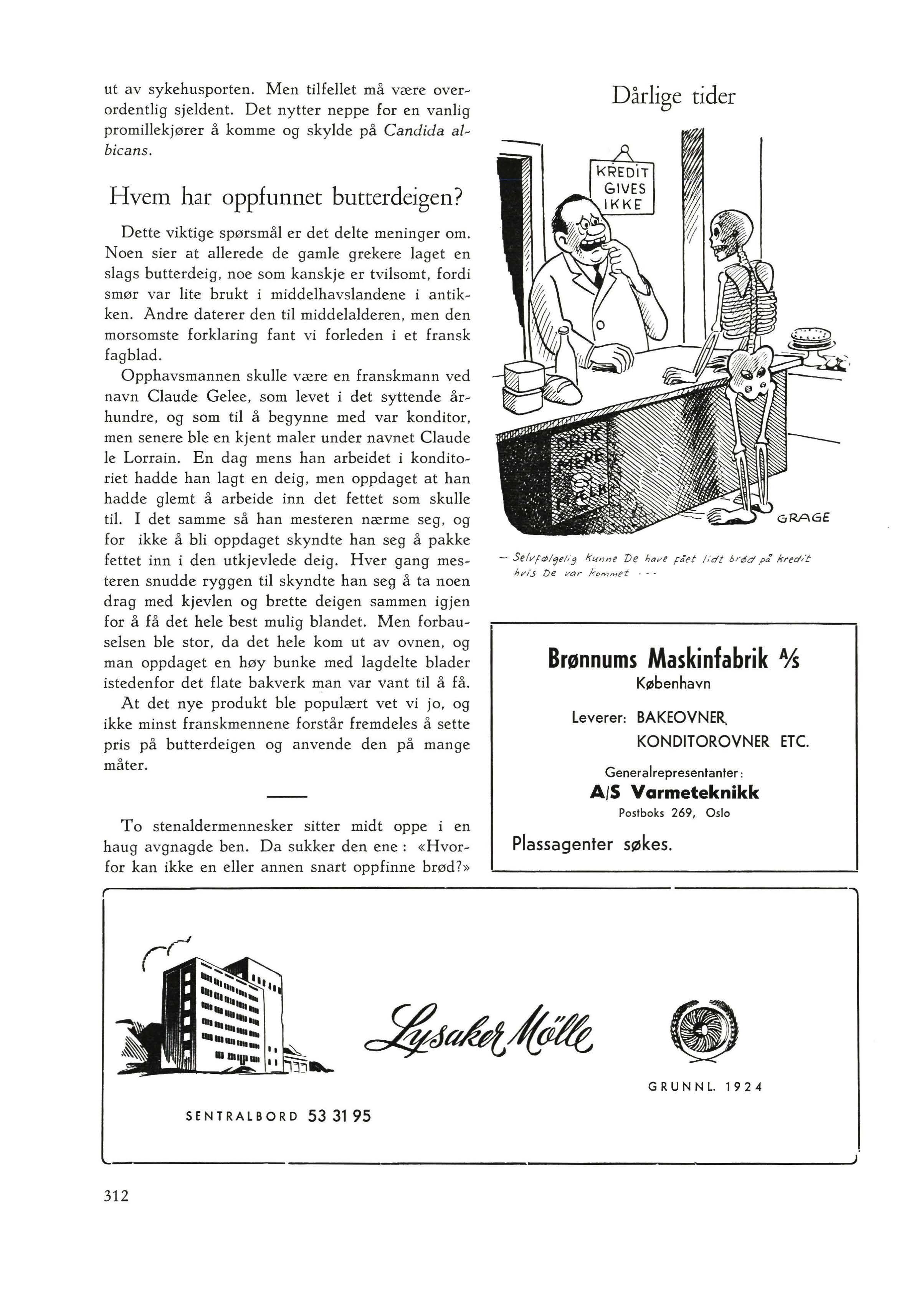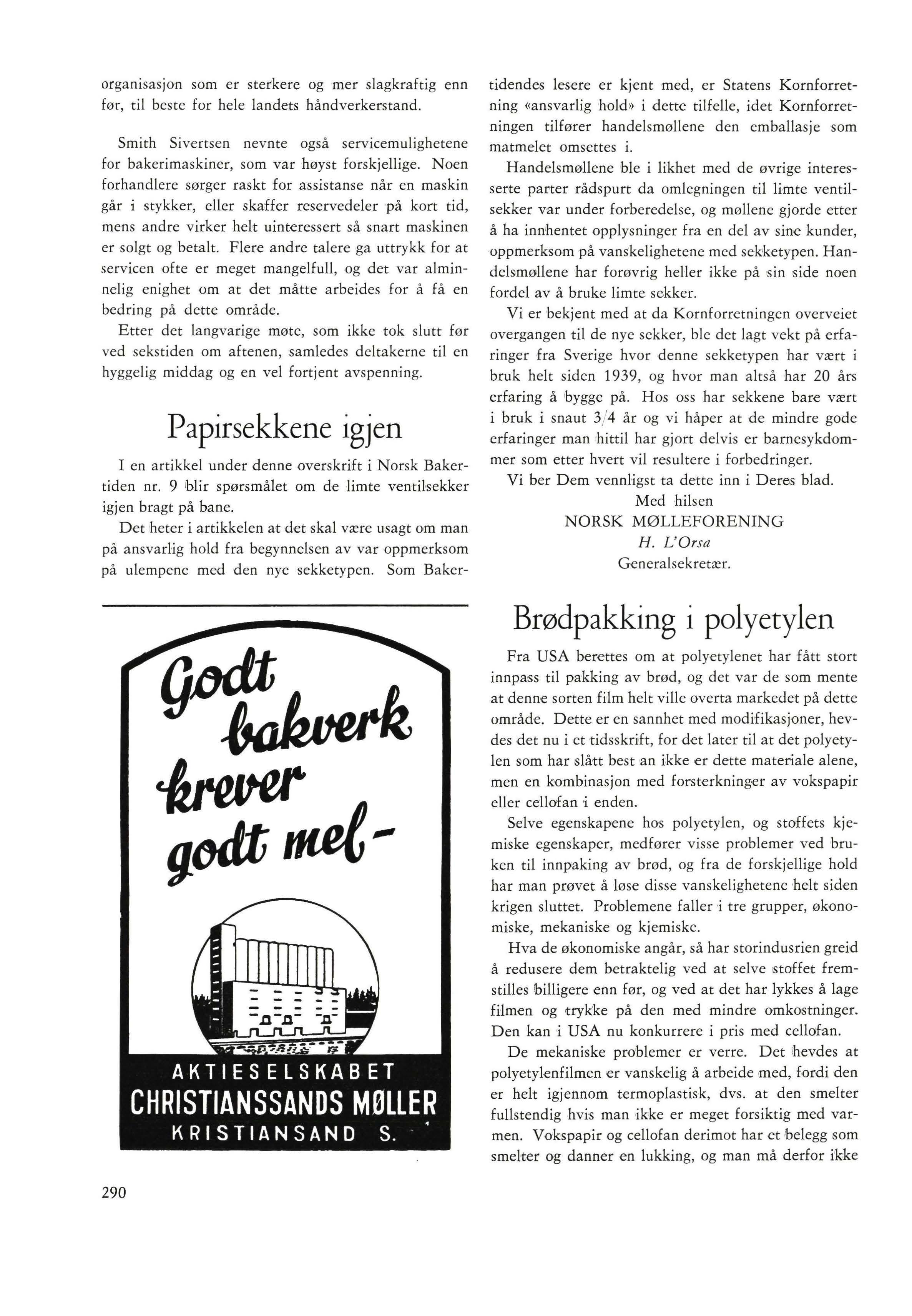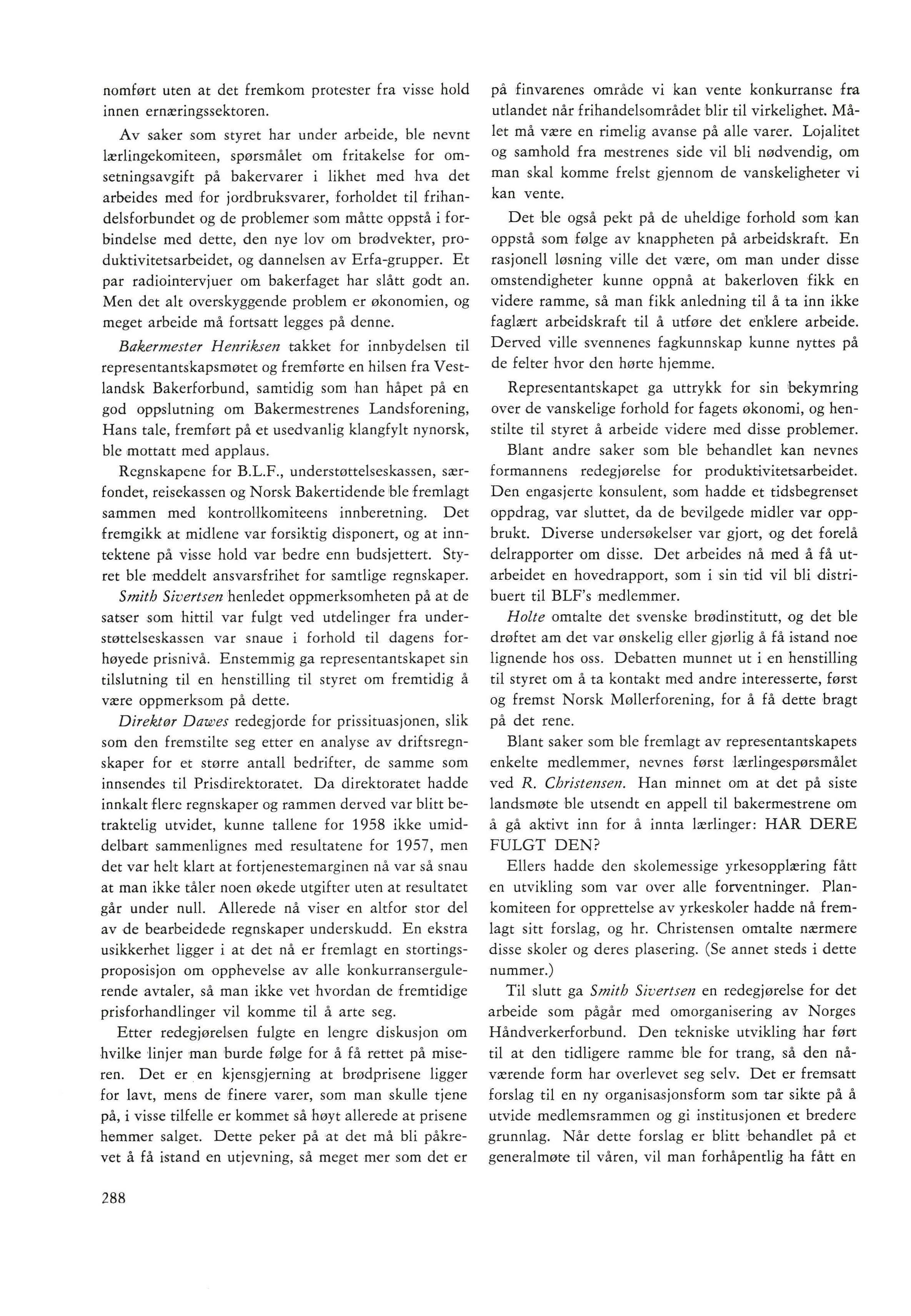 Man har også regelmessig kontakt med Statens kornforretning, og selv om det stadig er uløste problemer - det er nok å nevne papirsekkene og kjøregodtgjøreLsen i ikke møllebyer - så har man i allfall oppnådd 1 % kontantrabatt. Nedsettelsen av utmalingsgraden, som har vist ,seg å gi stabilere melkvaliteter, går også i bakernes favør, selv om ikke forandringen ble gjen-