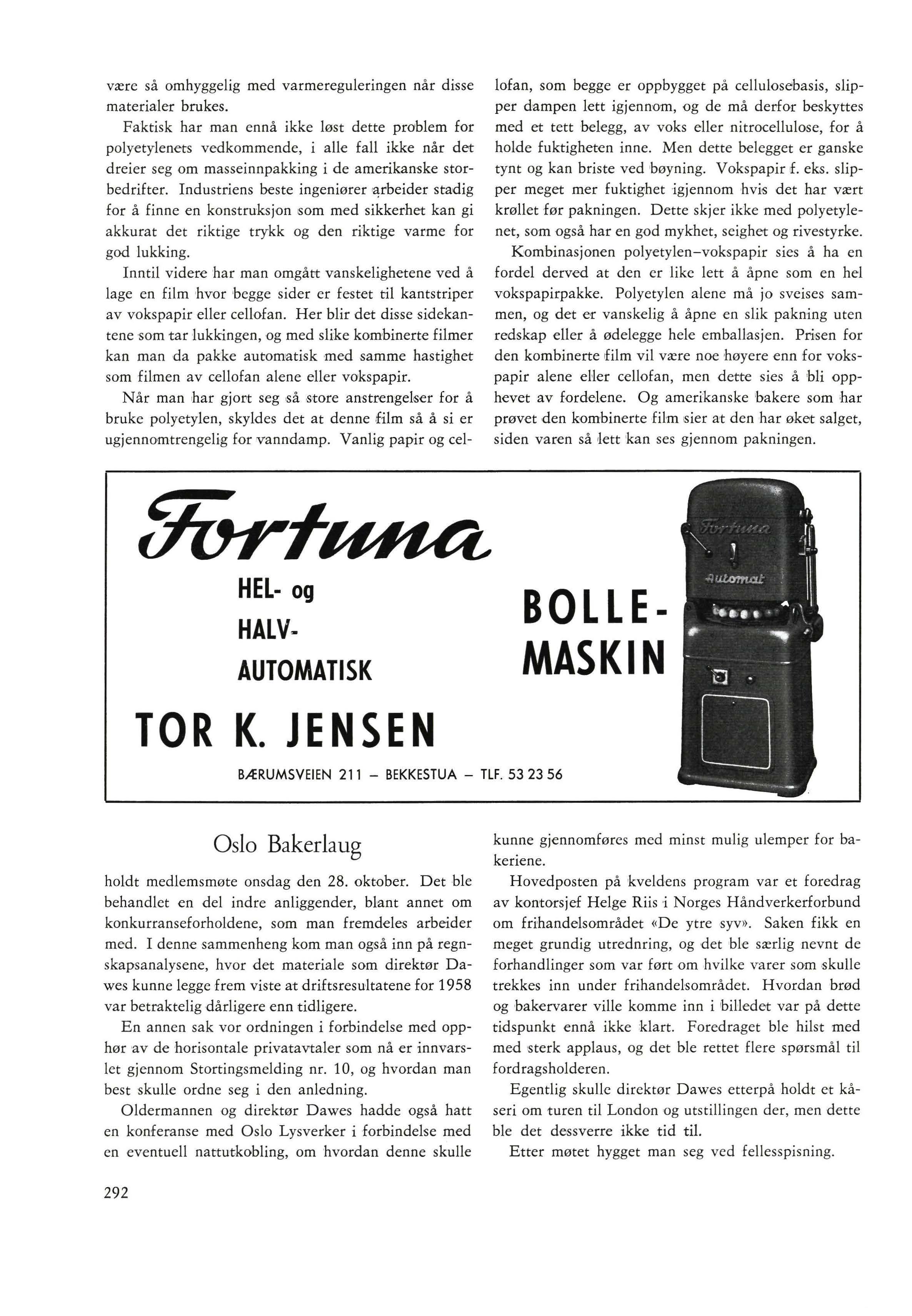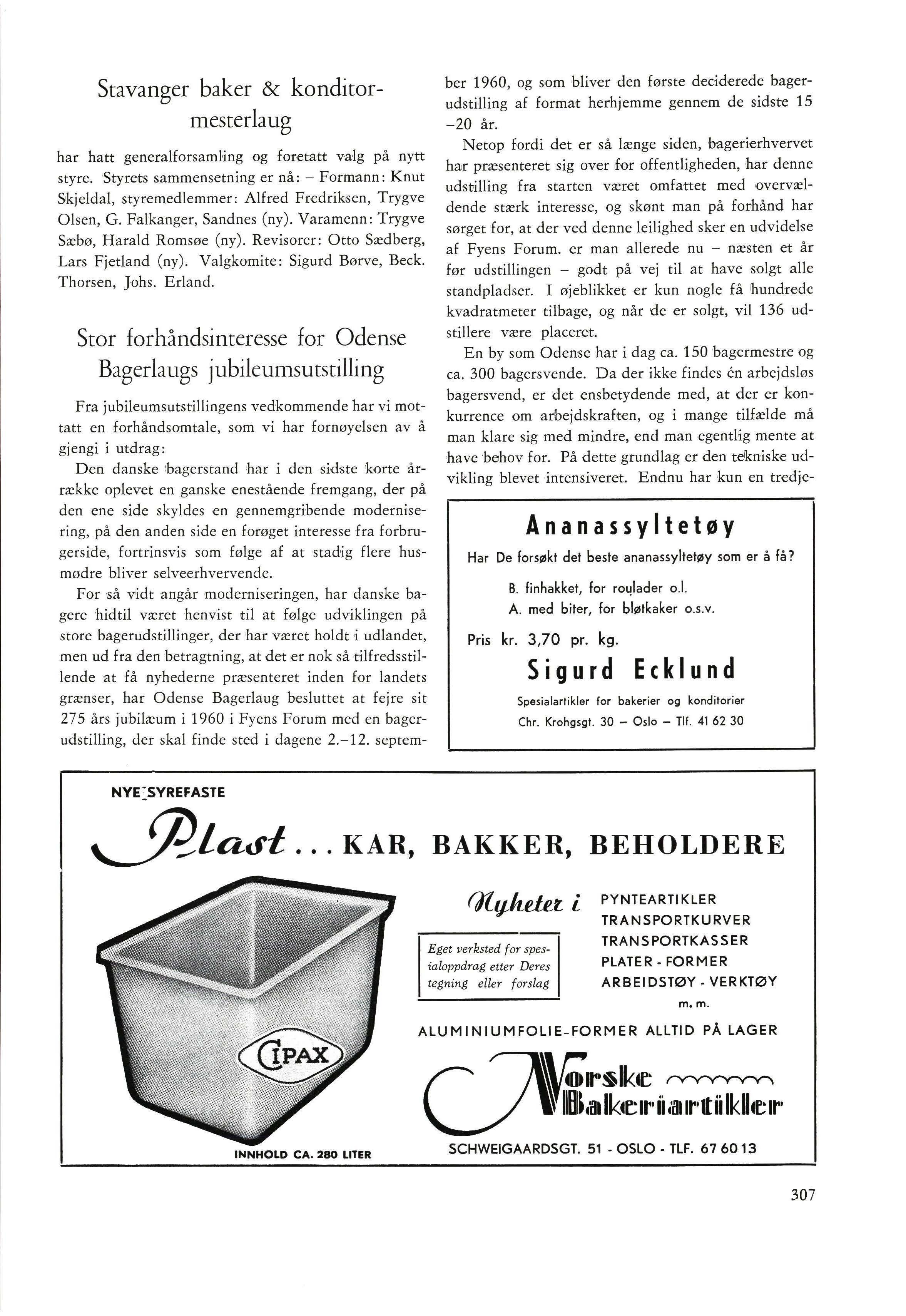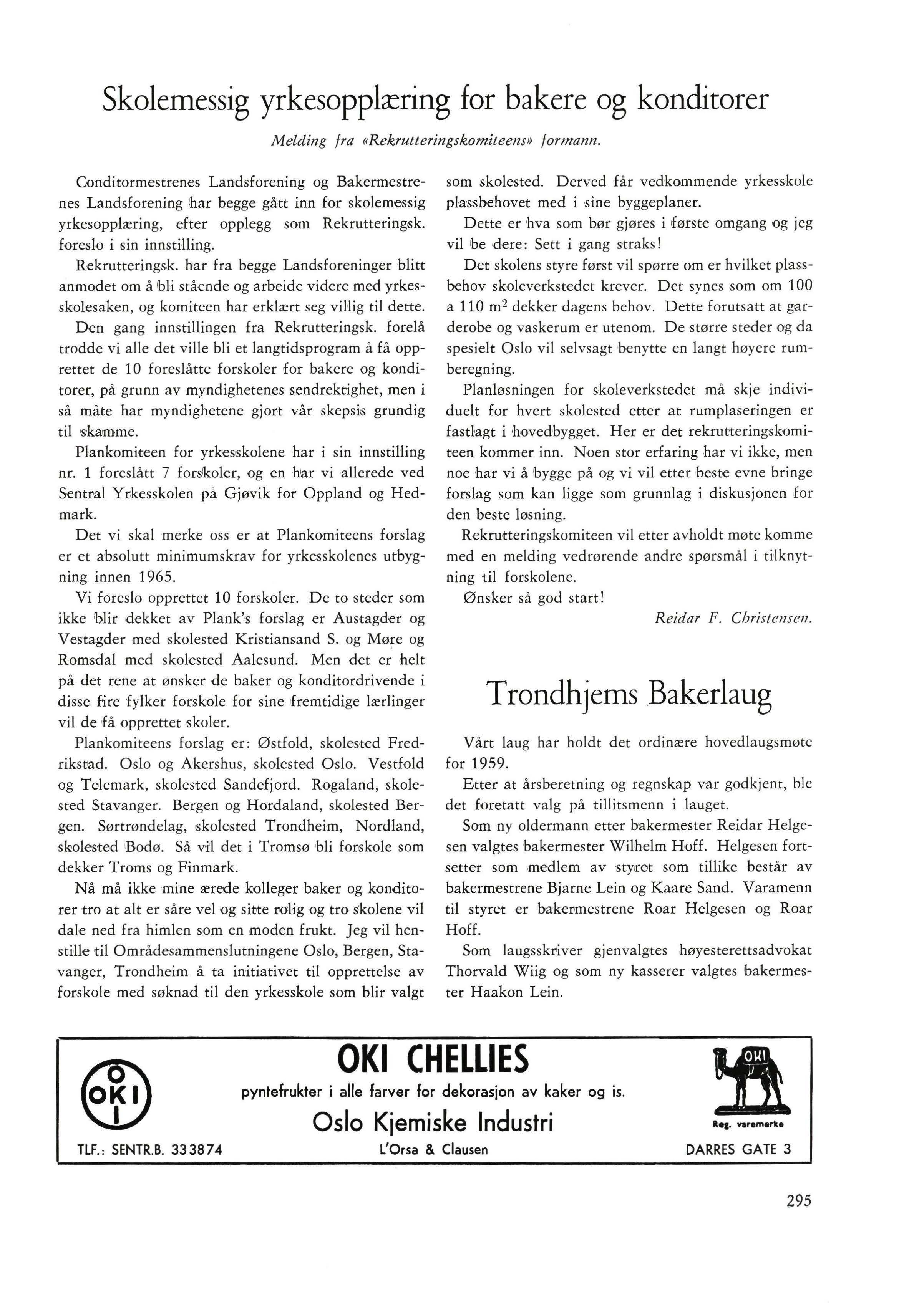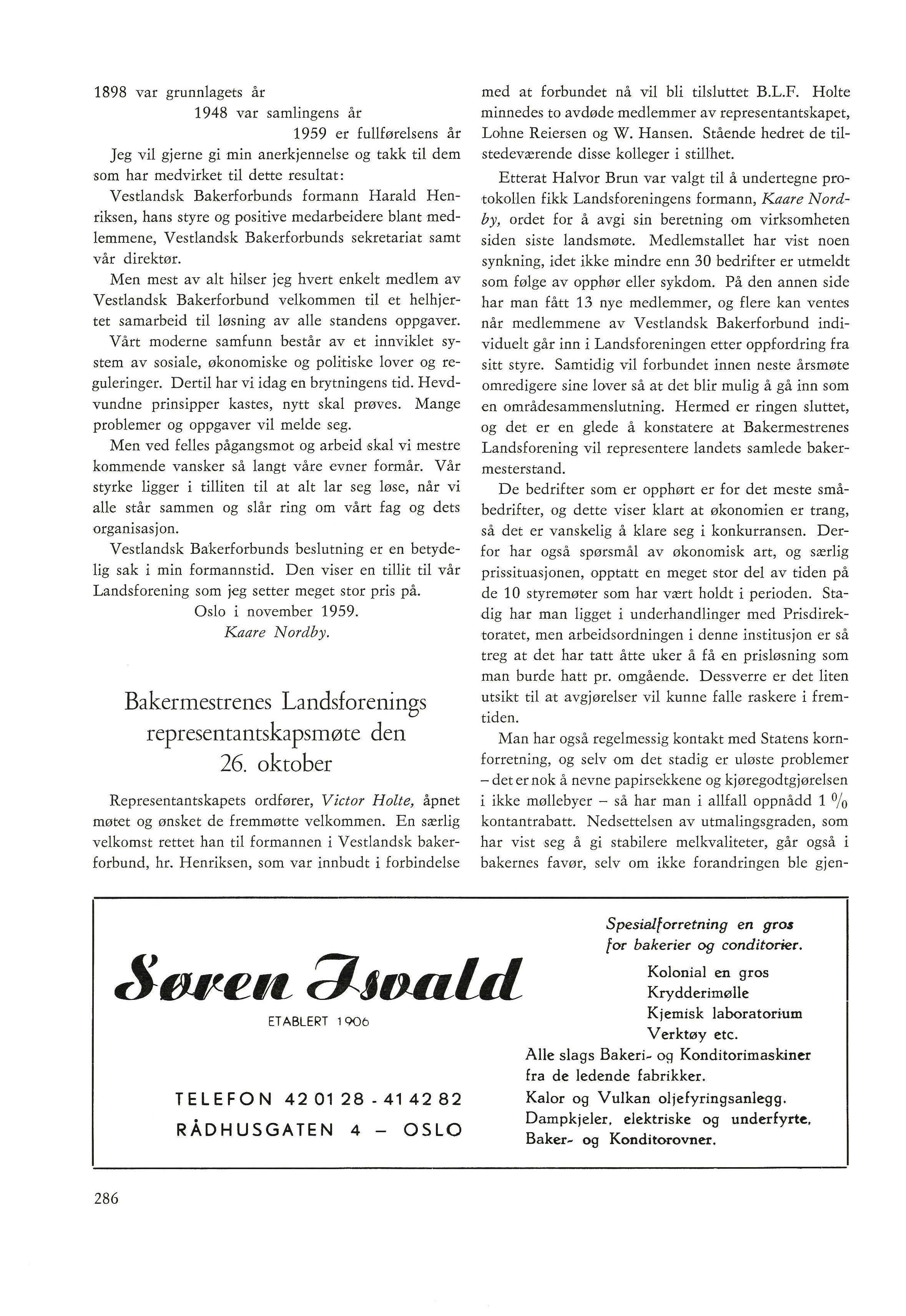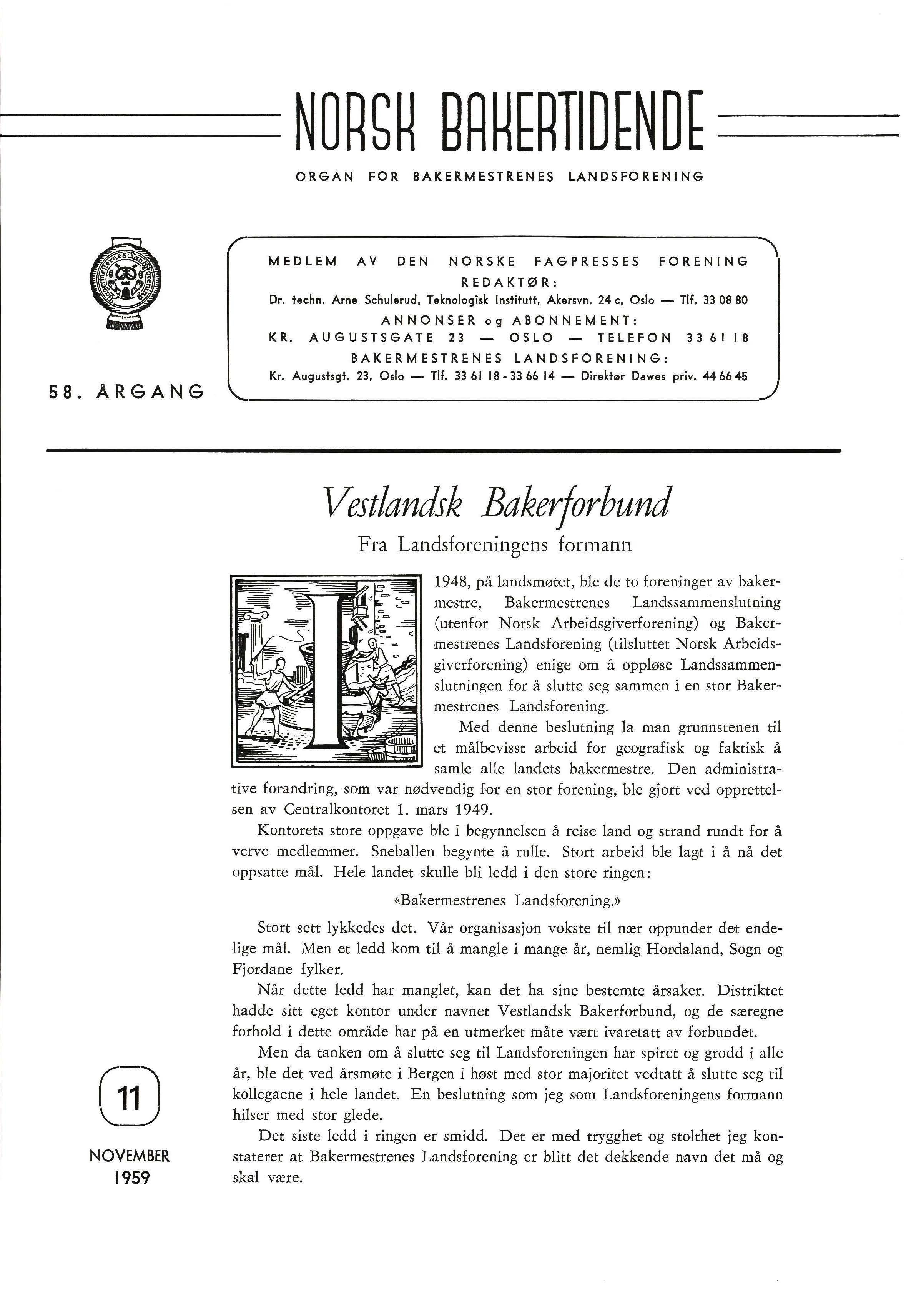 Vestlandsk Bakerforbunds beslutning er en betydelig sak i min formannstid. Den viser en tillit til vår Landsforening som jeg setter meget stor pris på. Oslo i november 1959.