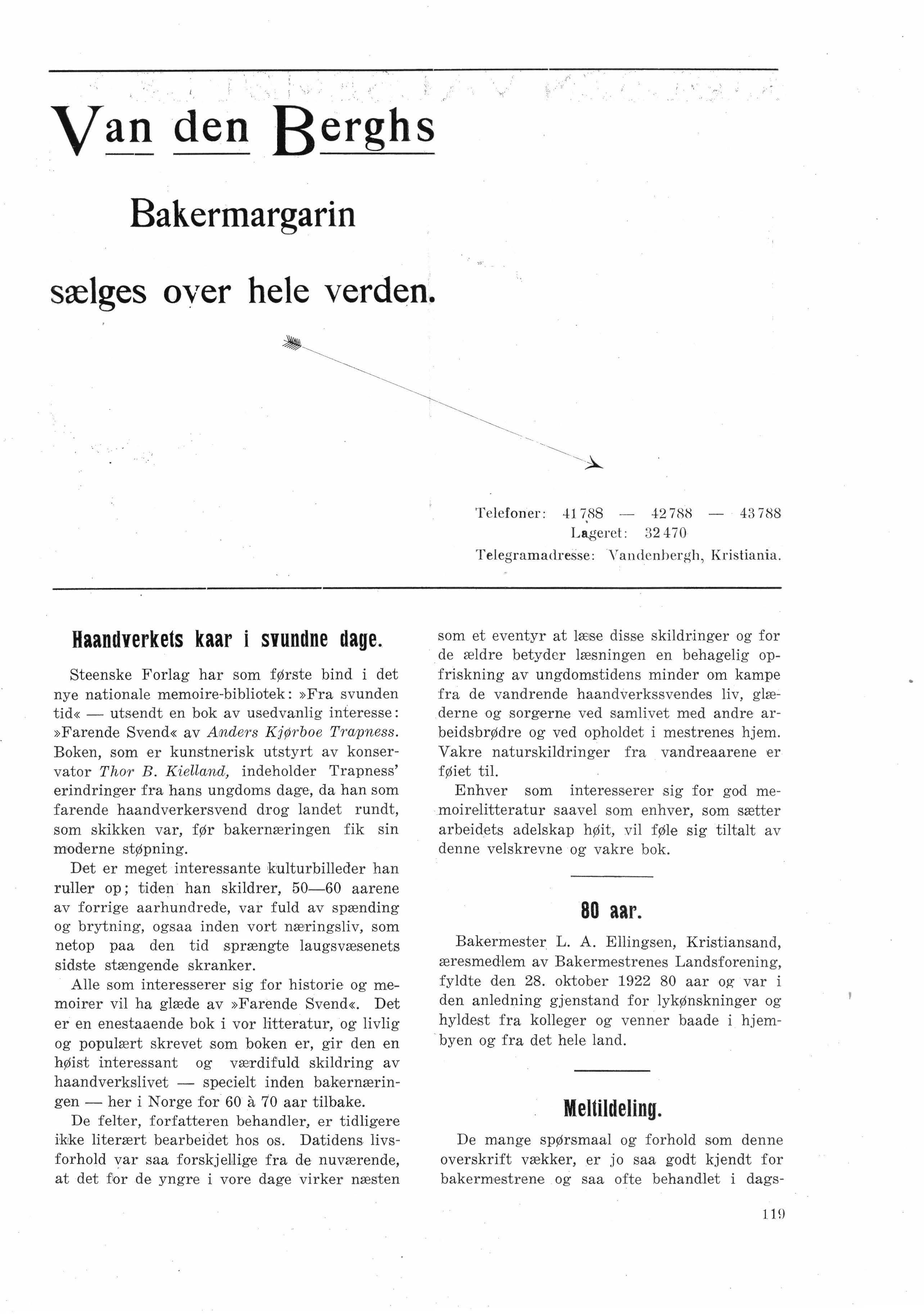 Bakermester L. A. Ellingsen, Kristiansand, æresmedlem av Bakermestrenes Landsforening, fyldte den 28. oktober 1922 80 aar og var i den anledning gjenstand for lykØnskninger og hyldest fra kolleger og venner baade i hjembyen og fra det hele land.