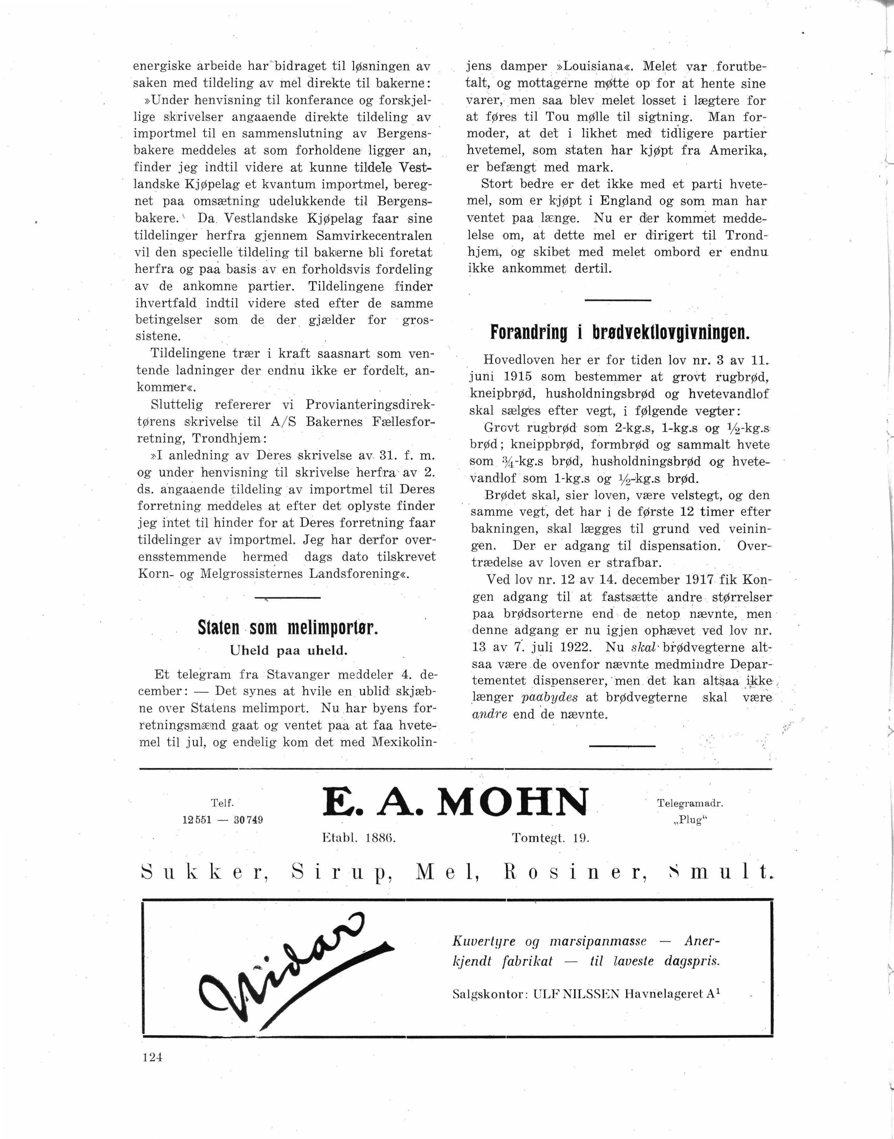 pressen, at vi ikke skal gjennemgaa den hele sak i nærværende blads spalter. Naar vi nu næi\Tner d ette spørsmaal med nogen ord, er det, fordi saken nylig er traadt ind i en ny face, som forhaabentlig vil betegne en hel kursændring i de sidste aars mange vanskeligheter paa dette felt. Vi sigter til, at der mellem Statens provianteringsdirektorat og repræsentanter for Bakermestrenes Landsforening i længere tid er korrespondert og underhandlet med det resultat, at der er opnævnt en række repræ1sentanter i de byer, hvor Landsforeningen for tiden har hovedstyremedlemmer,, for at disse repræsentanter kan funger ,e som en slags konsulenter for Provianteringsdirektoratet, og desuten har bakermestrene eller et par sammenslutninger av disse, den ene nylig dannet i Bergen og den anden i Trondhjem, faat anledning til direkte at motta importert mel pa,a grossistbeting,elser og uten at man altsaa er avhængig av grossisternes dispositioner.