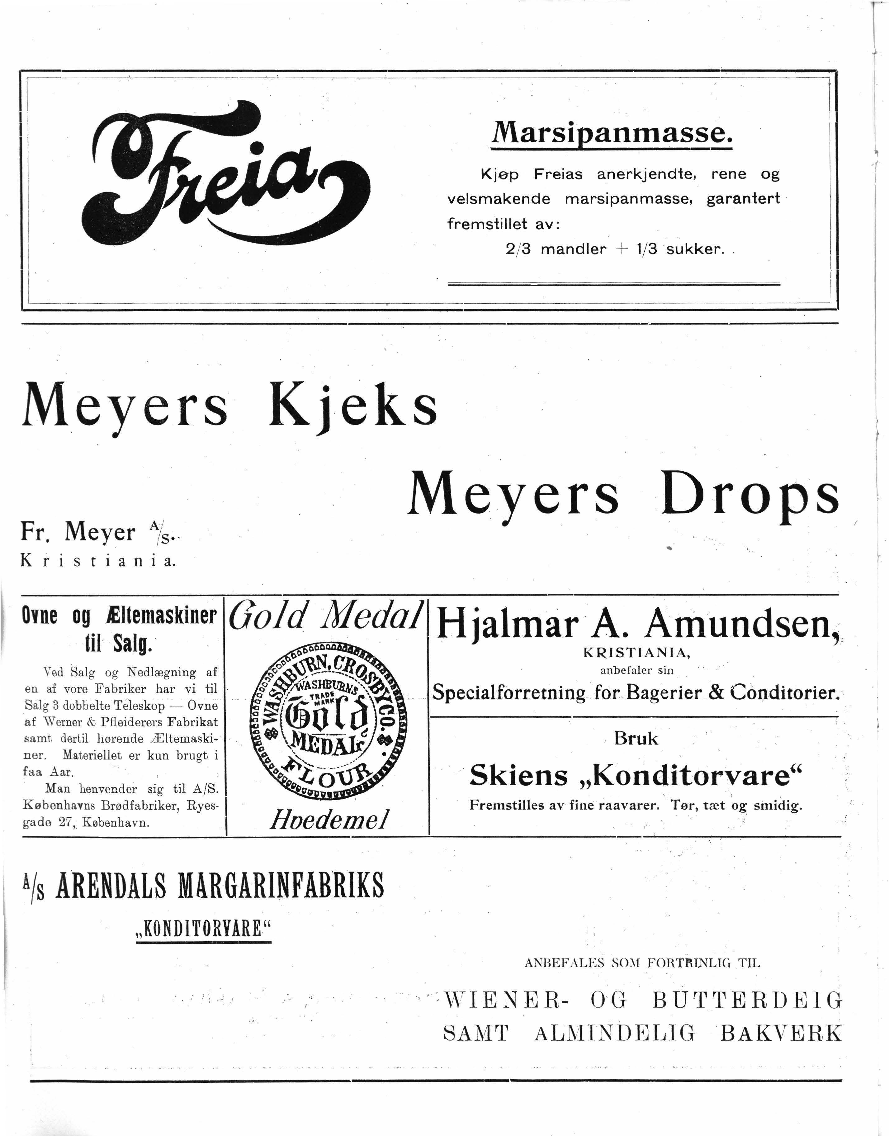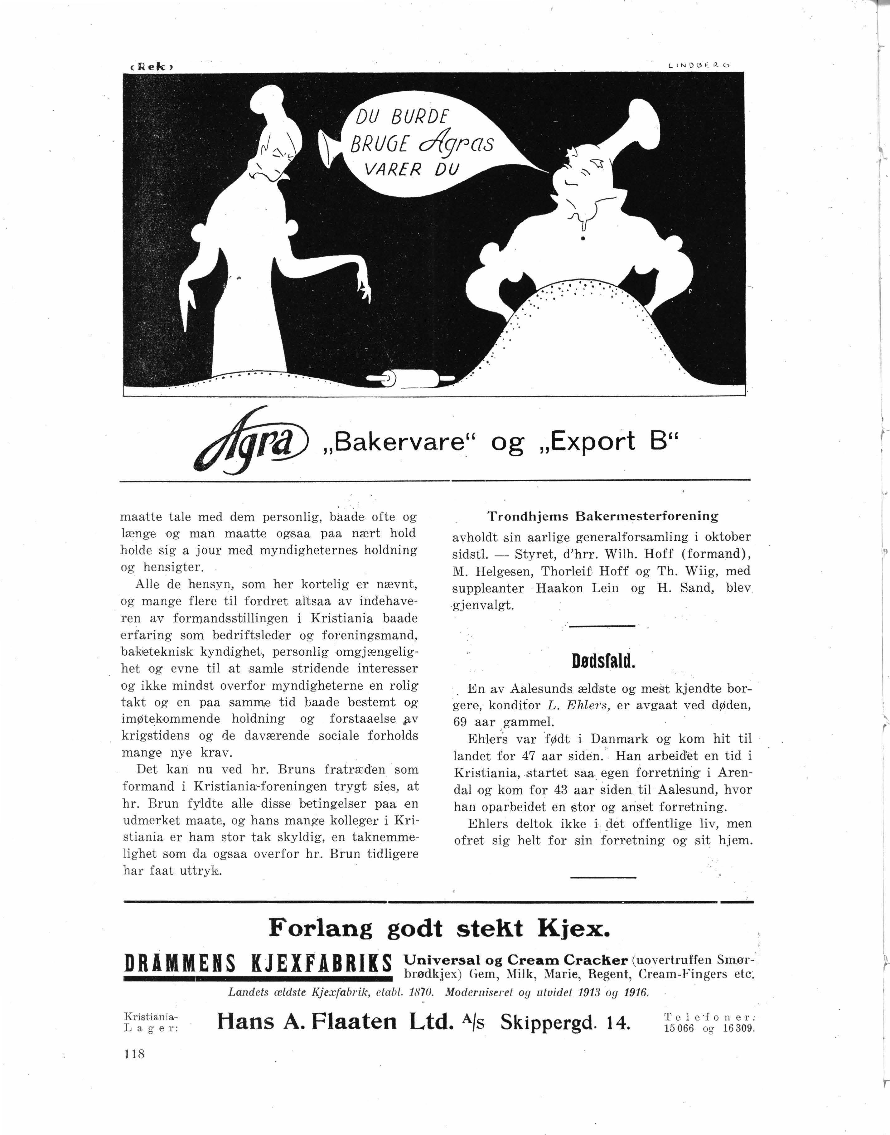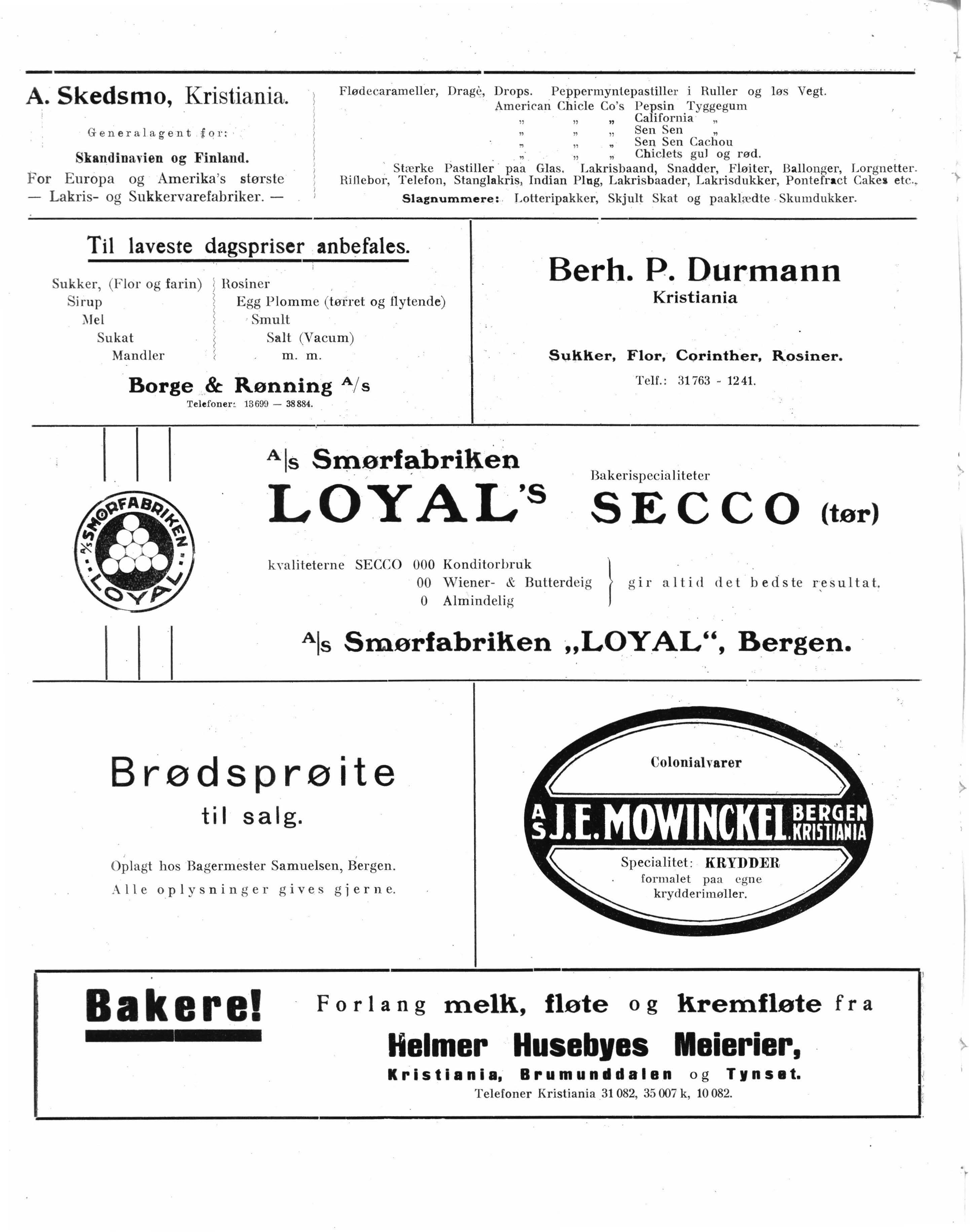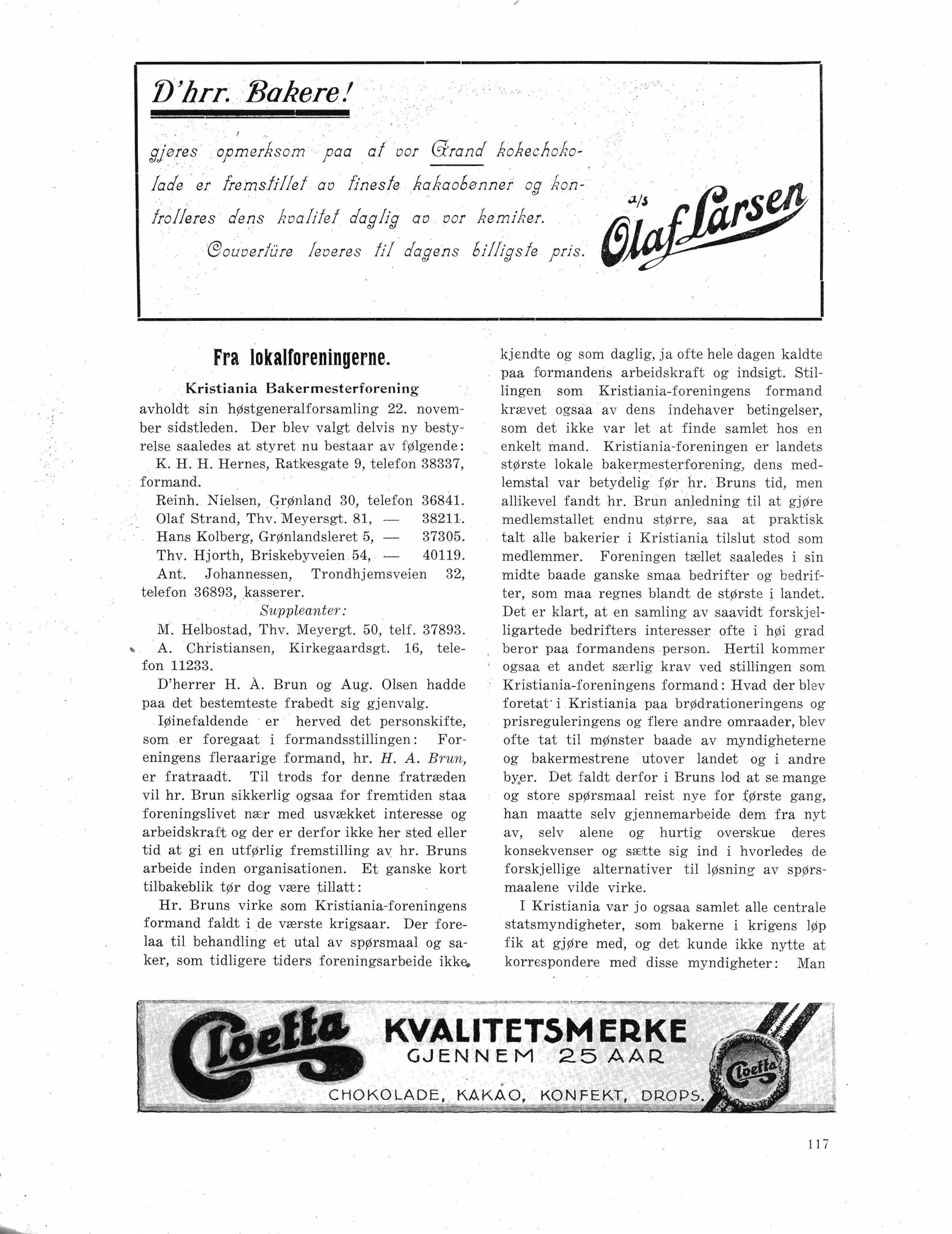 Trondhjems Bakermesterforening av holdt sin aarlige generalforsam lin g i oktober sidstl. - Styret, d'hrr. Wilh. Hoff (formand), M. Helge,sen, Thorleif: Hoff og Th Wiig, med s uppl eante r Haakon Lein og H. Sand, blev gjenvalgt.