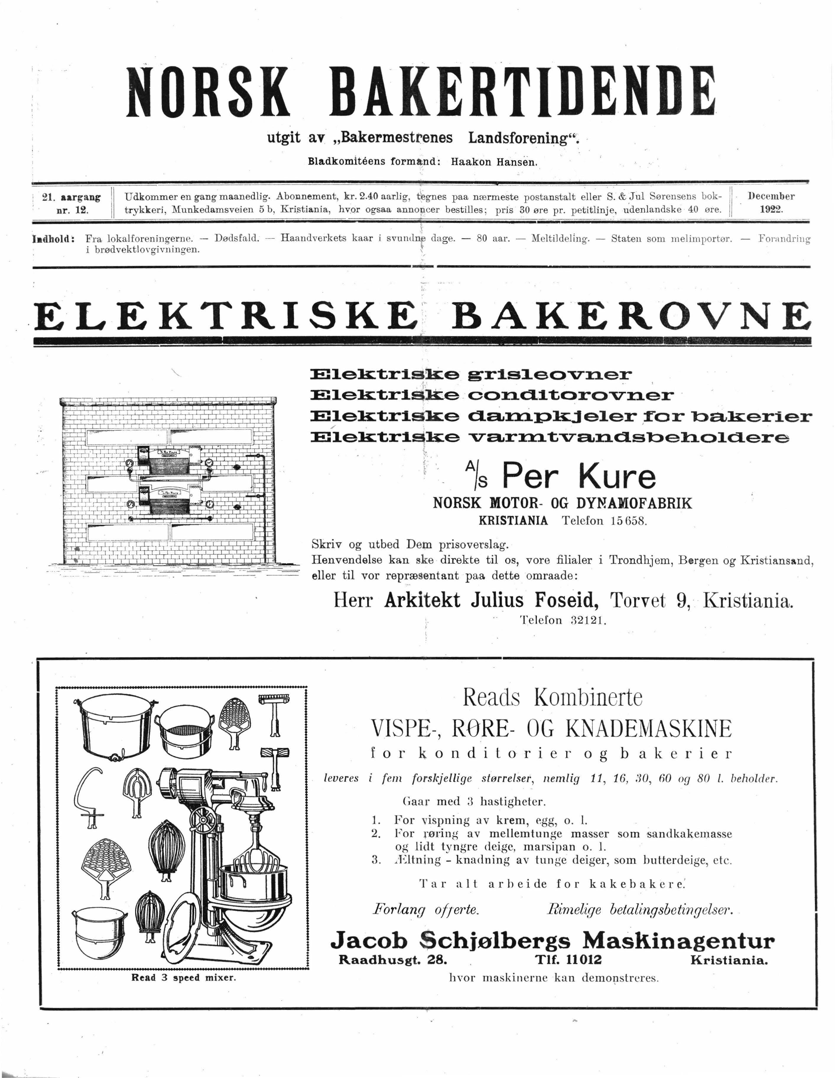 Avbrækkermaskiner, Automatiske avbrækkermaskiner og opslagsmaskiner for stort og smaat brød. Konditorovner, piskemaskiner og Brødvogner .