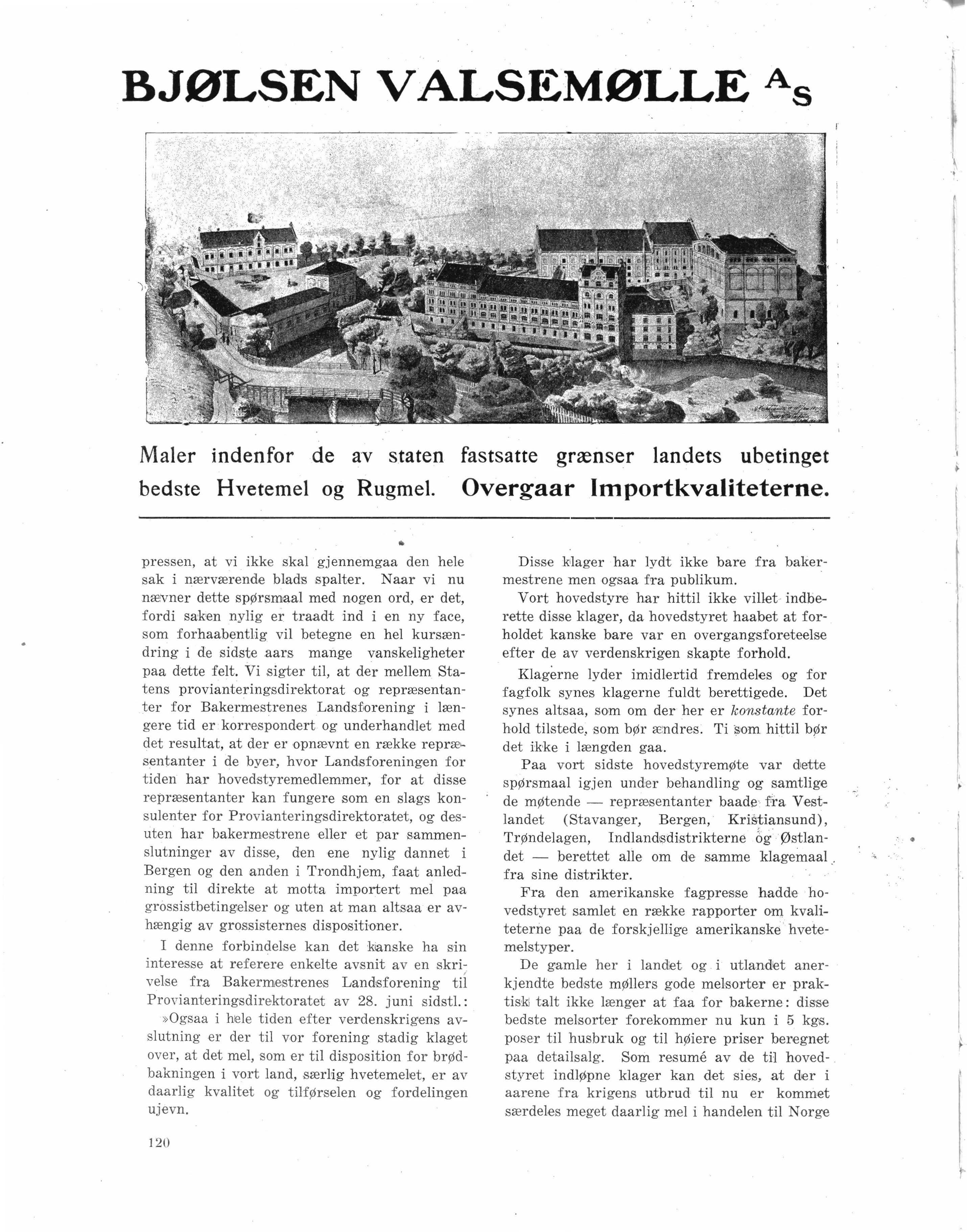 I denne forbindelse kan det :kianske ha sin interesse at referere enkelte avsnit av en skri, velse fr:a Bakermestrenes Landsforening til Provianteringsdir ektoratet av 28. juni sidstl.: >> Ogsaa i hele tiden efter verdenskrigens avslutning er der til vor forening stadig klaget over, at det mel, som er til disposition for brødbakningen i vort land, særlig hveteme1'et, er av daarlig kvalitet og tilførselen og fordelingen ujevn.