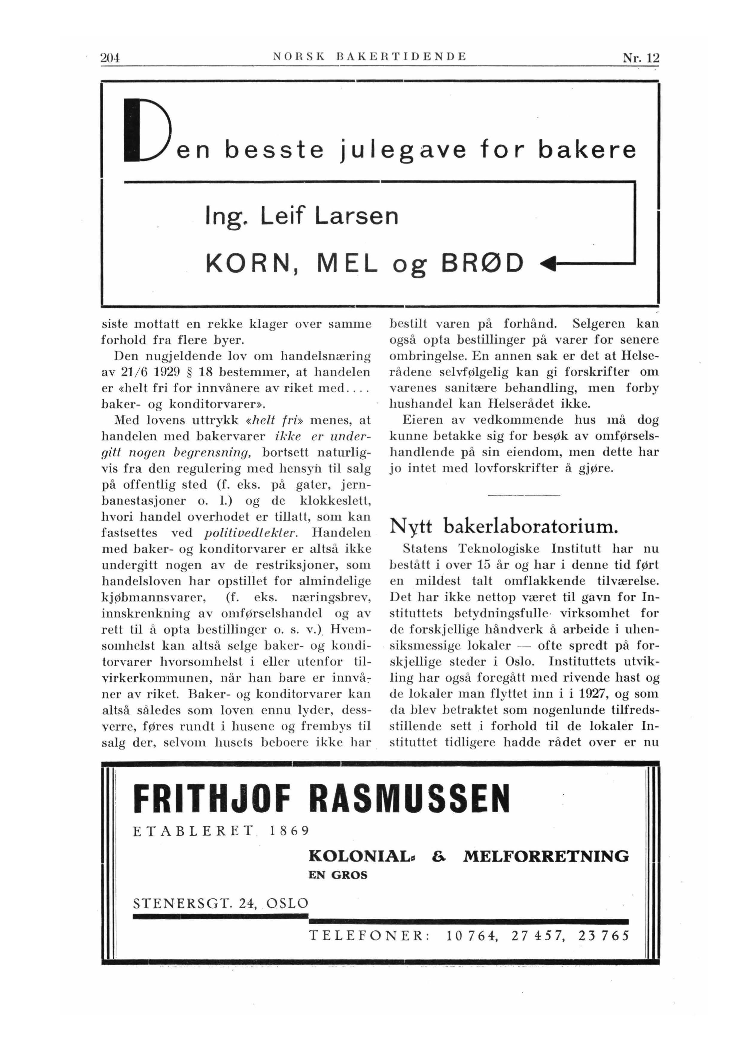 ing . Larsen nu har utgitt om Korn , Mel og Brød . Vi har lenge her i Norge savnet en håndbok for bakere, og det var m e d glede jeg hørt e at ing. Lars e n var if e rd m e d å skrive en slik bok, især fordi jeg visste at nettop han satt inn e m e d d e b est e forutsetninger for å kunne gi oss bok e n vi hadde bruk for og nytte av.