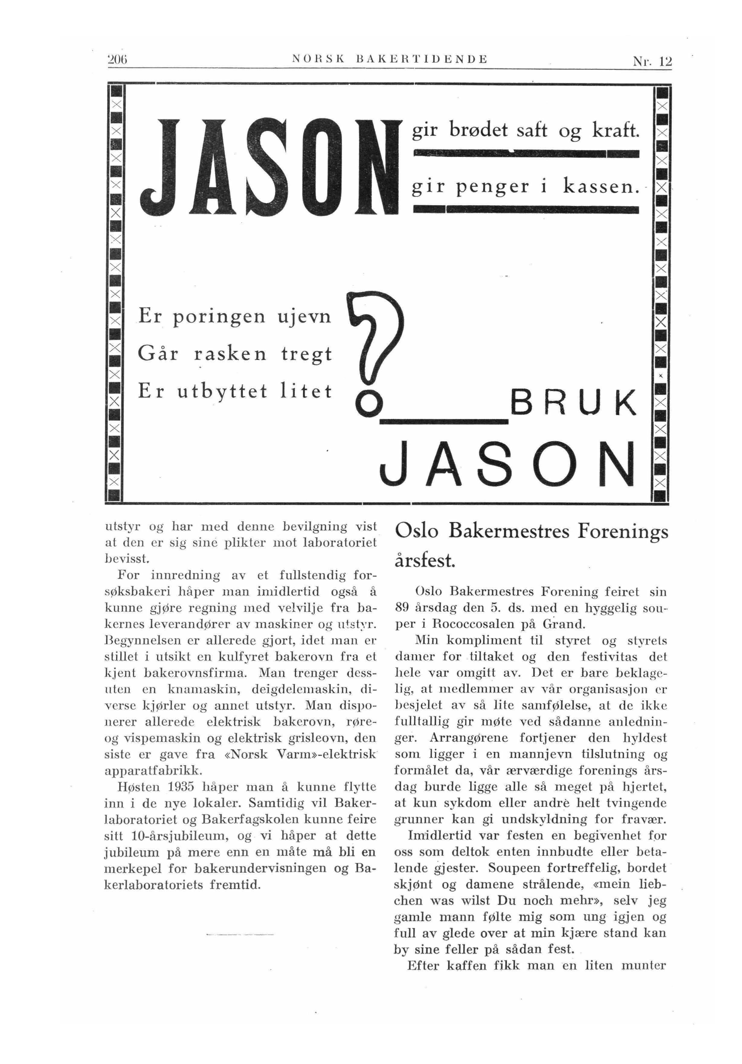 bevis for hvorledes reklamen virkelig femmår å suggerere et helt publikum når den bare anlegges på riktig måte. Flattbrødog knekkebrødproduksjonen blomstrer og havr egryn og havrenøtter har stor suksess. Hvilk et er disse produkter vel undt. Men det er bare denne ene hake ved tingen. Det skal ikke skje ved å nedsette brødets verdi i publikums Øine. Disse andre produk ter består av samme råstoffer som brødet og virker på samme måte i organism en som brødet.Nasjonal samling også på ernæringens område har i de aller siste år dessuten lagt sin store sten til bakernes byrde. Ved to leiligh eter har man f. eks. oplevet at en kjent mann og politiker har stått frem og offentlig erk l ært at man måtte se å komme bort fra brØdspisningen fordi brødet er laget av utenlandsk korn. Istedet skulde man spise ost, drikke melk og bruke andre landmannsprodukter. Senest fikk vi høre dette under m,e}kemessen i Oslo og det gikk glatt ned i alle de hundreder som hørte på og de tusener som senere leste referatene i avisene. Men er det da ikke