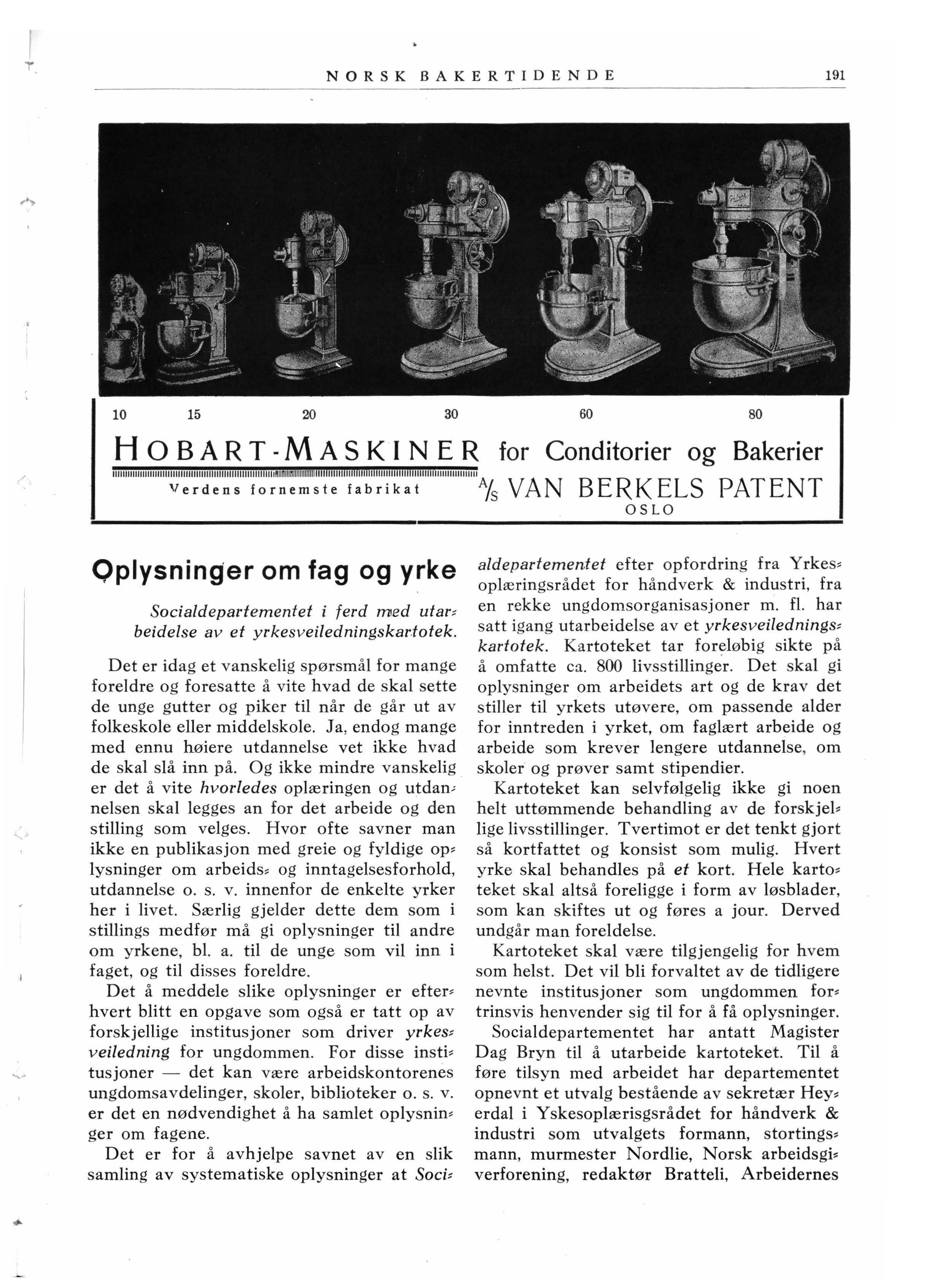 Som man vil forstå er dette et tiltak som også i høieste grad har interesse for vårt fags vedkommende . Vi vil derfor henstille til våre medlemmer å vise all mulig imøtekommenhet når de får skriftlig eller muntlig henvendelse om å gi oplysninger om faget. Bare gjennem et intimt samarbeide med de forskjellige fags egne folk kan kartoteket bli det det skal være: en mest mulig korrekt, uttømmende og bruk~ bar samling av oplysninger om yrkene i Norge idag.