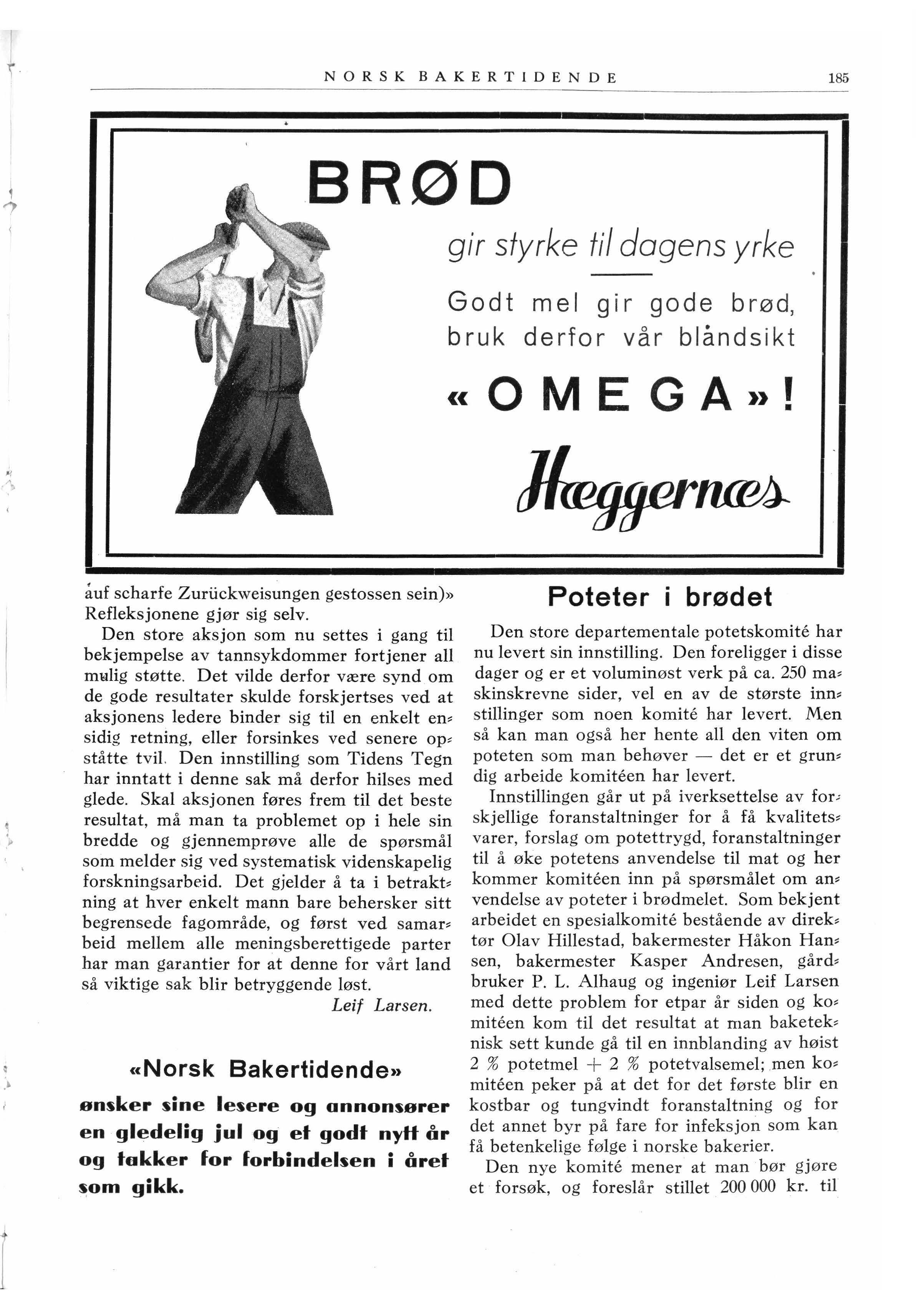 Innstillingen går ut på iverksettelse av for, skjellige foranstaltninger for å få kvalitets• varer, forslag om potettrygd, foranstaltninger til å øke potetens anvendelse til mat og her kommer komiteen inn på spørsmålet om an• vendelse av poteter i brødmelet. Som bekjent arbeidet en spesialkomite bestående av direk• tør Olav Hillestad, bakermester Håkon Han• sen, bakermester Kasper Andresen, gård• bruker P. L. Alhaug og ingeniør Leif Larsen med dette problem for etpar år siden og ko• miteen kom til det resultat at man baketek, nisk sett kunde gå til en innblanding av høist 2 % potetmel + 2 % potetvalsemel; .men ko• miteen peker på at det for det første blir en kostbar og tungvindt foranstaltning og for det annet byr på fare for infeksjon som kan få betenkelige følge i norske bakerier.