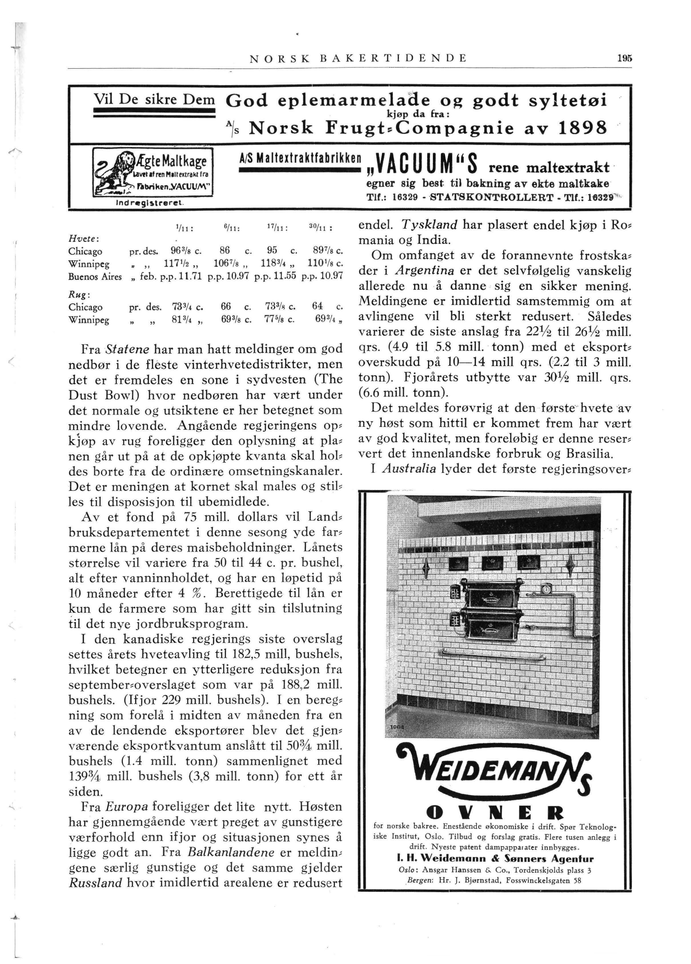 Fra S.t at ene har man hatt meldinger om god nedbør i de fleste vinterhvetedistrikter, men det er fremdeles en sone i sydvesten (The Dust Bowl) hvor nedbøren har vært under det normale og utsiktene er her betegnet som mindre lovende. Angående regjeringens op, kJøp av rug foreligger den oplysning at pla, nen går ut på at de opkjøpte kvanta skal hol, des borte fra de ordinære omsetningskanaler . Det er meningen at kornet s kal males og stil , les til disposisjon til ubemidlede .