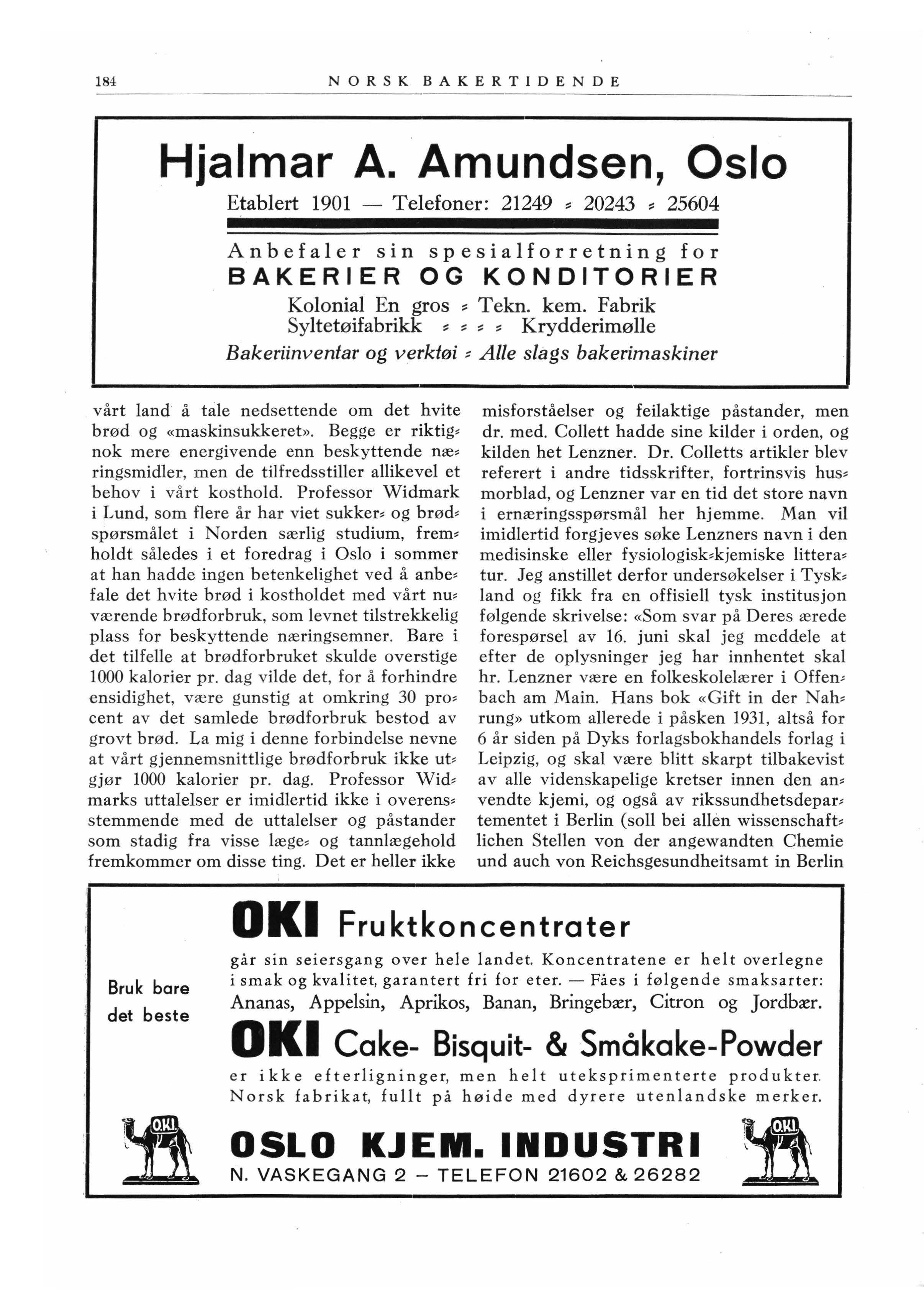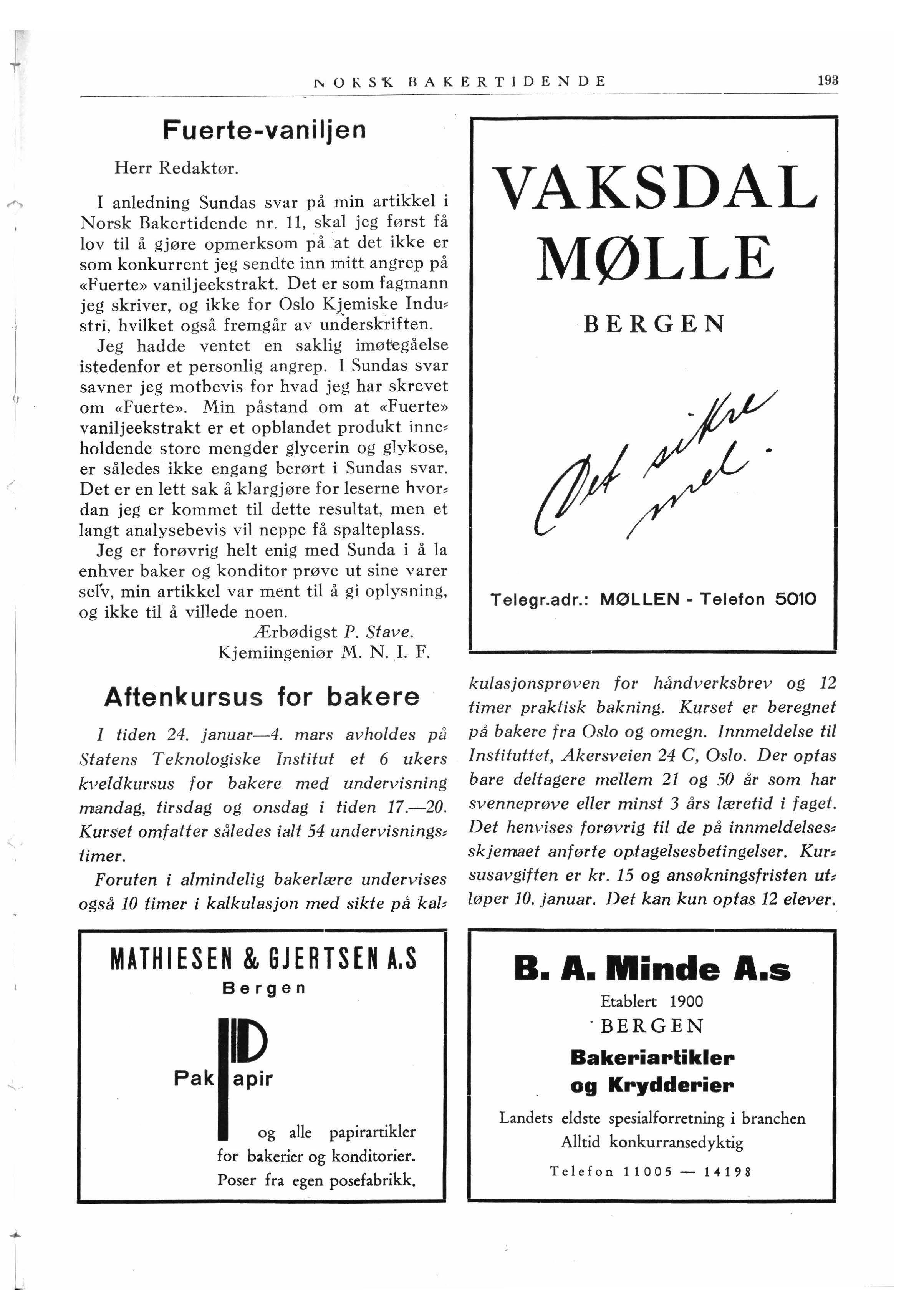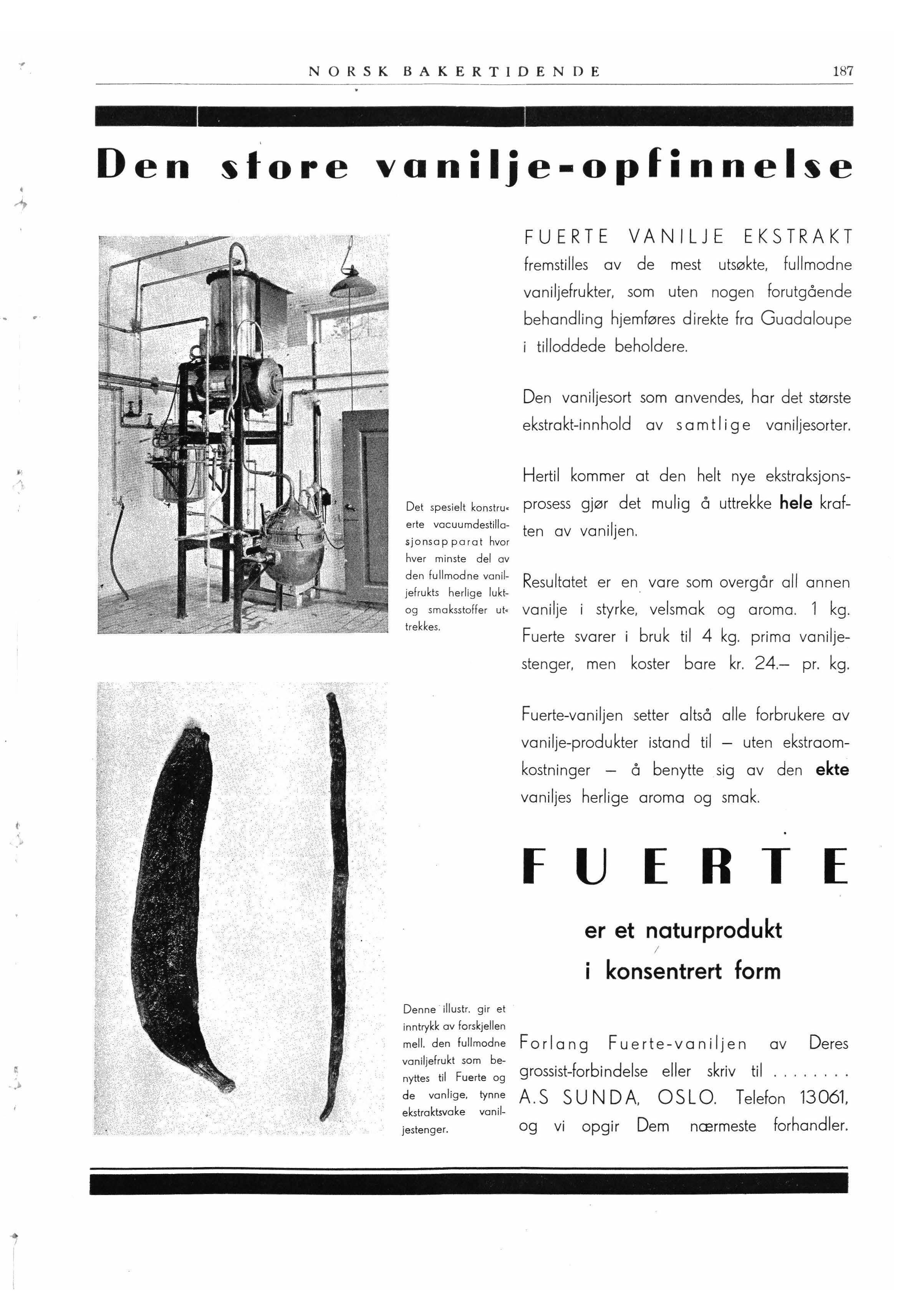 I anledning Sundas svar på min artikkel i Norsk Bakertidende nr. 11, skal jeg først få lov til å gjøre opmerksom på at det ikke er som konkurrent jeg sendte inn mitt angrep på «Fuerte» vaniljeekstrakt. Det er som fagmann jeg skriver, og ikke for Oslo Kjemiske Indu, stri, hvilket også fremgår av underskriften.