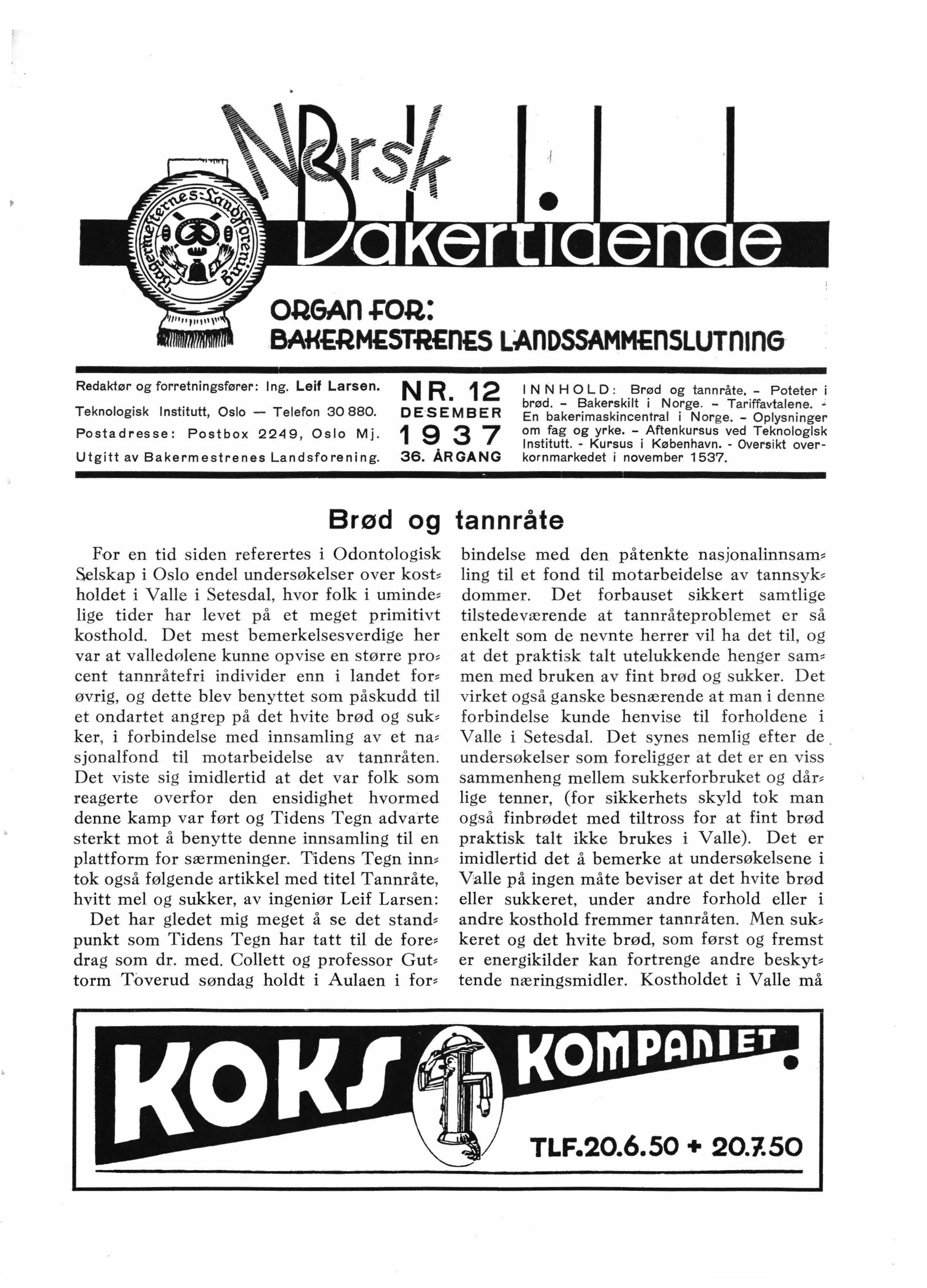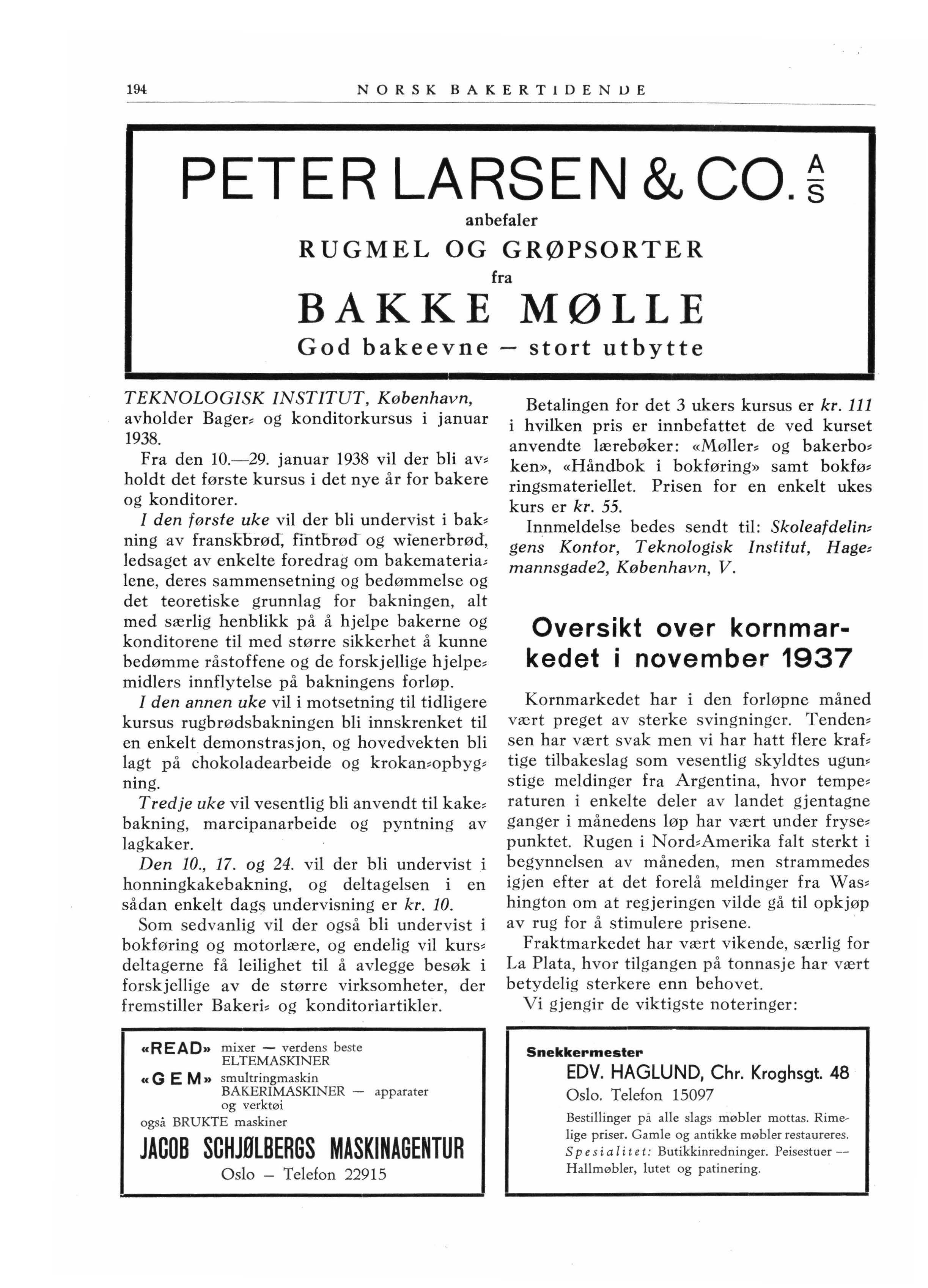 I N N H OLD : Brød og tannråte. - Poteter i brød - Bakerskilt i Norge - Tariffavtalene ..: Teknologisk Institutt, Oslo - Telefon 30 880. D E ·S EM BER En bakerimaskincentral i Norge - Oplysn i nger om fag og yrke. - Aftenkursus ved Teknologlsk Institutt - Kursus i København. - Oversikt overkornmarkedet i november 1537.