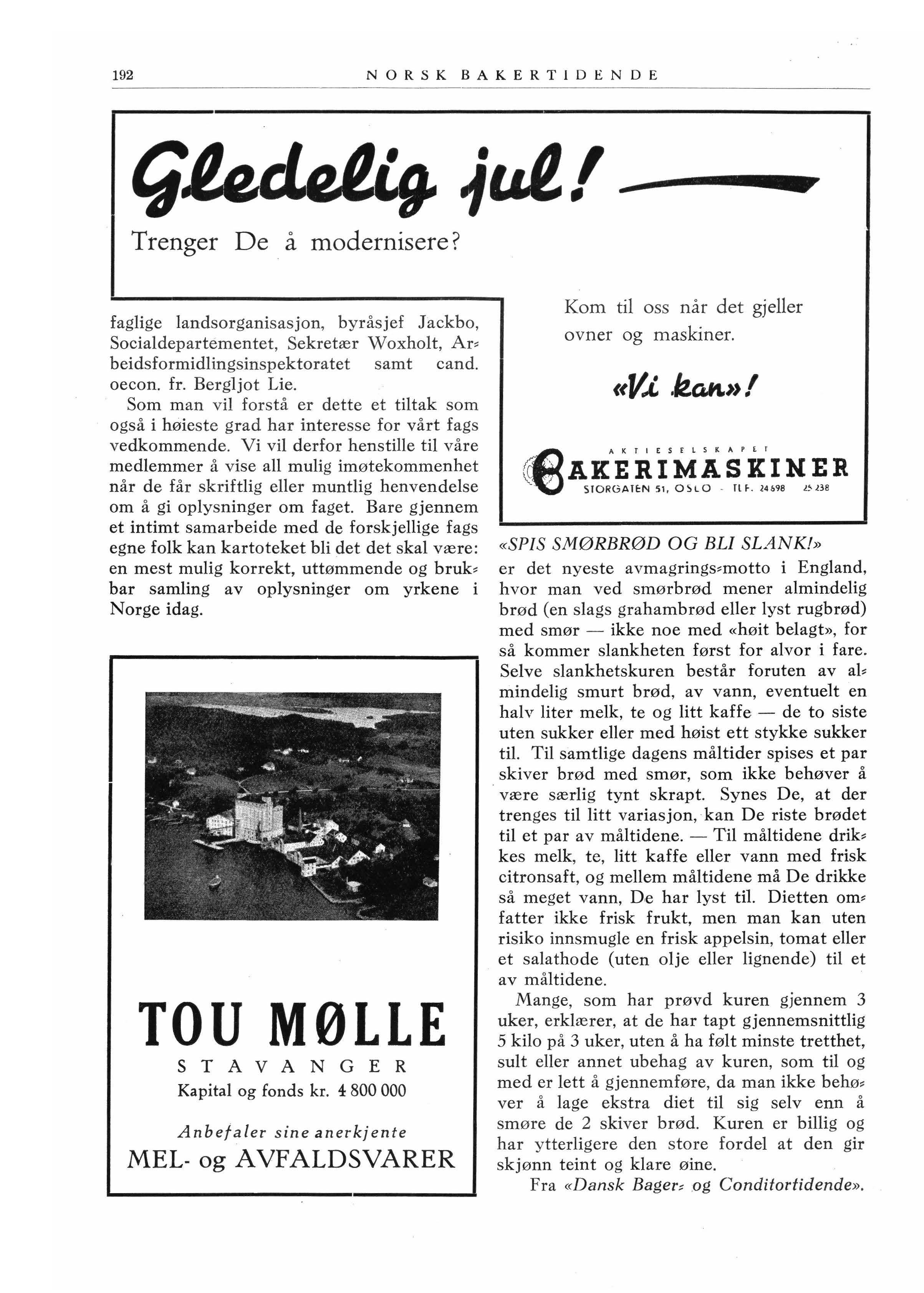 «SPIS SMØRBRØD OG BLI SLANK!» er det nyeste avmagrings~motto i England, hvor man ved smørbrød mener almindelig brød (en slags grahambrød eller lyst rugbrød) med smør - ikke noe med «høit belagt», for så kommer slankheten først for alvor i fare. Selve slankhetskuren består foruten av ab mindelig smurt brød, av vann, eventuelt en halv liter melk, te og litt kaffe - de to siste uten sukker eller med høist ett stykke sukker til. Til samtlige dagens måltider spises et par skiver brød med smør, som ikke behøver å være særlig tynt skrapt. Synes De, at der trenges til litt variasjon, kan De riste brødet til et par av måltidene. - Til måltidene drib kes melk, te, litt kaffe eller vann med frisk citronsaft, og mellem måltidene må De drikke så meget vann, De har lyst til. Dietten om~ fatter ikke frisk frukt, men man kan uten risiko innsmugle en frisk appelsin, tomat eller et salathode (uten olje eller lignende) til et av måltidene.