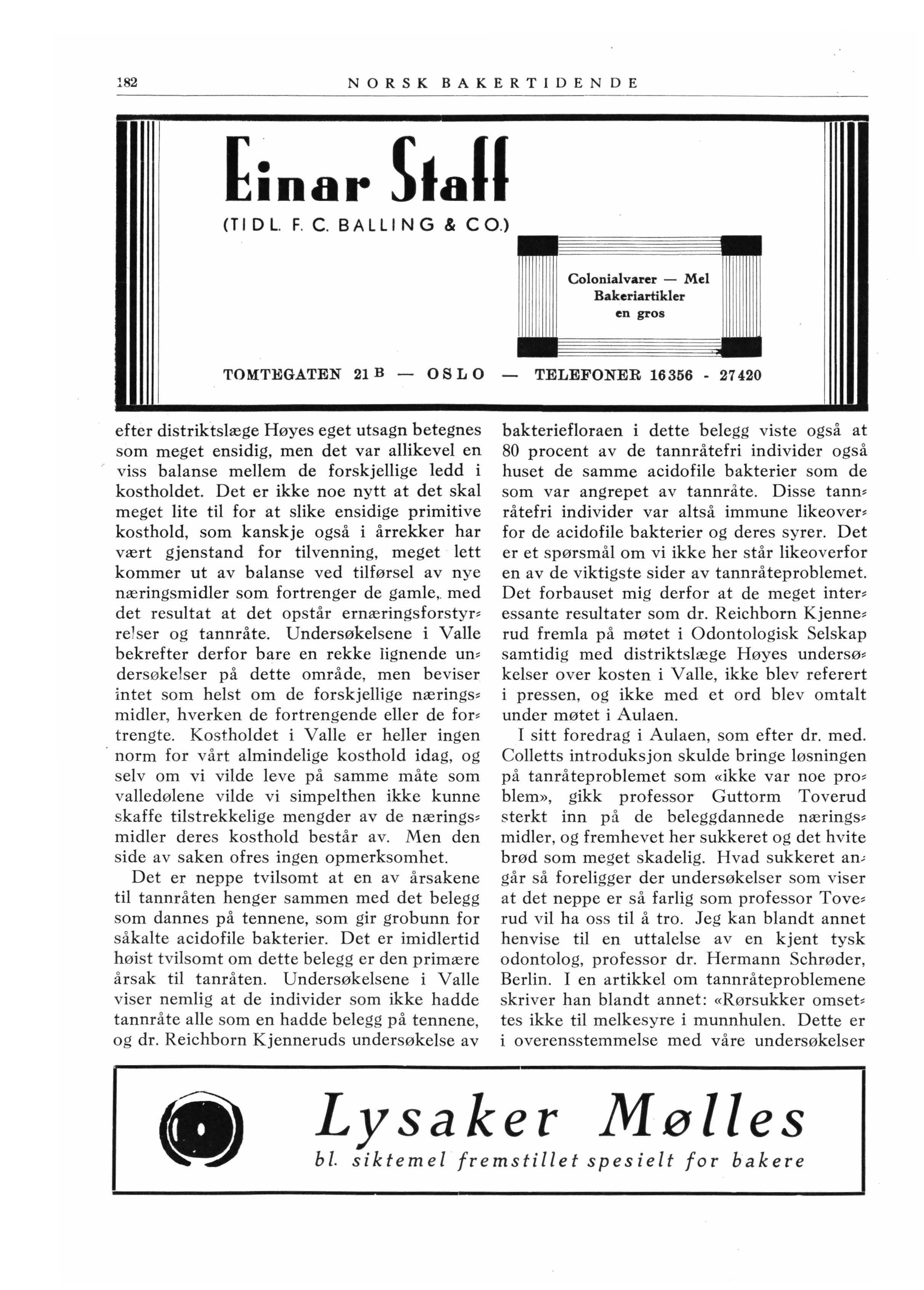For en tid siden referertes i Odontologisk Selskap i O s lo endel undersøkel se r over kost, holdet i Valle i Setesdal, hvor folk i uminde , lige tider har levet på et me get primitivt kosthold Det mest bemerkelsesverdige her var at valledølene kunne opvise en større pro, cent tannråtefri individer enn i landet for• øv rig, og dette blev benyttet som påskudd til et ondartet a ngrep på det hvite brød og s ub ker , i forbindelse med innsamling av et na• s jonalfond til motarbeidelse av tannråten . Det viste sig imidlertid at det va r folk som reagerte overfor den ensidighet hvormed denne kamp var ført og Tidens Tegn advarte sterkt mot å benytte denne innsamling til en plattform for særmeninger Tidens Tegn inn, tok også følgende artikkel med titel Tannråte , hvitt mel og sukker, av ingeniør Leif Larsen: Det har gledet mig meget å se det stand• punkt som Tidens Tegn har tatt til de fore • drag som dr. med. Collett og professor Gut • torm Toverud søndag holdt i Aulaen i for •
