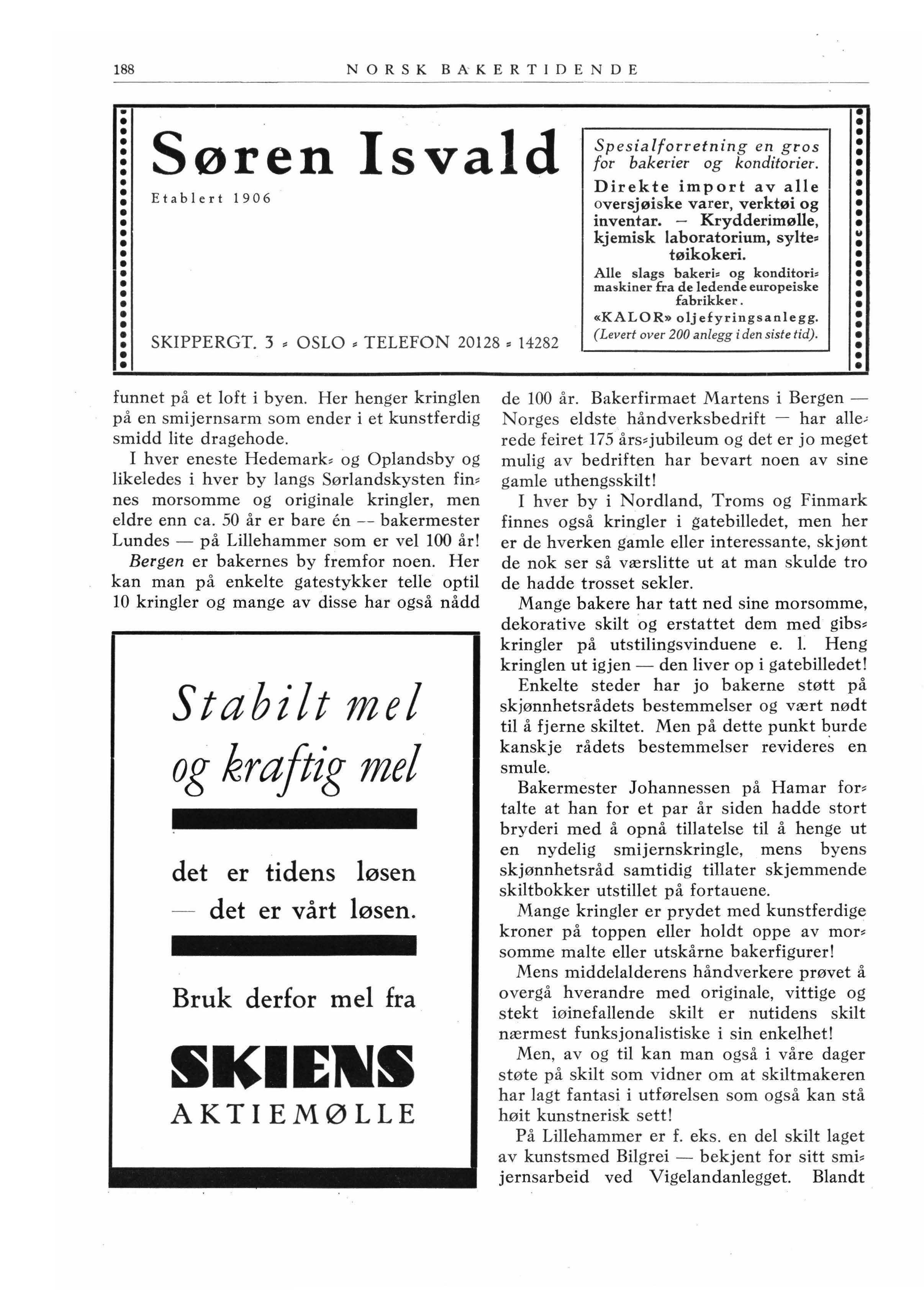 Byens og sannsynligvis landets eldste kringle eies av bakerfirmaet H. A Brun i Bokstadveien 28 . Men denne kringle som bæres av den nydeligste smijernsarm er ikke norsk. Arkitekt Eide som har forestått om• innredningen av herr Bruns forretning hjem• førte den for 25 år siden fra Kjøbenhavn . Kringlen er laget omkring 1810 og det er jo ingen alder for et håndverkerskilt fra Kjø• benhavri. hvor mange skilt har hengt i op til 400 år