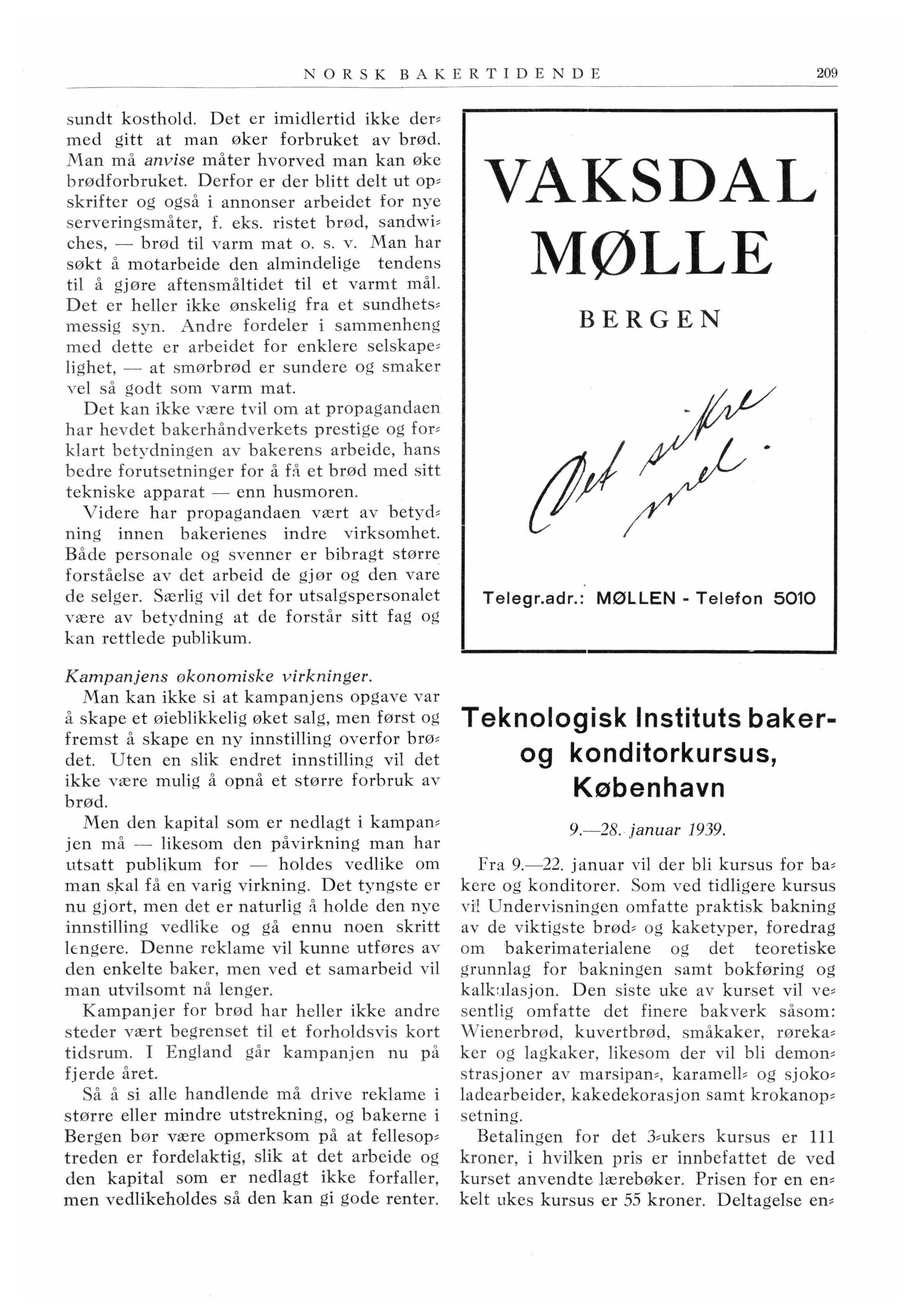 Eftermidda gs kursus for bak e r e i Os'lo og omegn avholdes i tiden 30. januar til 10. mar s 1939. Undervisningen f,inner s ted i Institut , tets lokaler , Akersveien 24 C, O s lo Det un , dervi ses 3 g an ger om uken fr a kl. 17 til 20. Ialt omfatter kurset 54 undervi s ningstimer Kurse t omfatter såvel teoreti s k so m prak tis k undervi snin g . Innmeld e l se til kur,set .s kjer på et spes ielt innm eldel sess kjema som sa mmen m e d plan f åes ve d hen ve ndelse t,il Statens Te knolo gi, s k e In s titutt. Det opta.s bare deltagere m el, lem 21 og 50 å r so m har sven n eprøve e ller 3 å rs l ære tid i bakerfaget. Det henvises for øvrig til de på anmeldelsesskjemaet anførte op ta gel.sesbet in gelse r Kursusavgiften er kr. 15.00. A n sø knin gsfois t e n utløper 11. januar. D a :lisse kur se r a lltid har vært overtegnet ka.n man ikke regne med at det v il bli tatt hen s ~ J n til ansøkninger som kommer inn efter ansøkning.sfrist,ens utl øp.