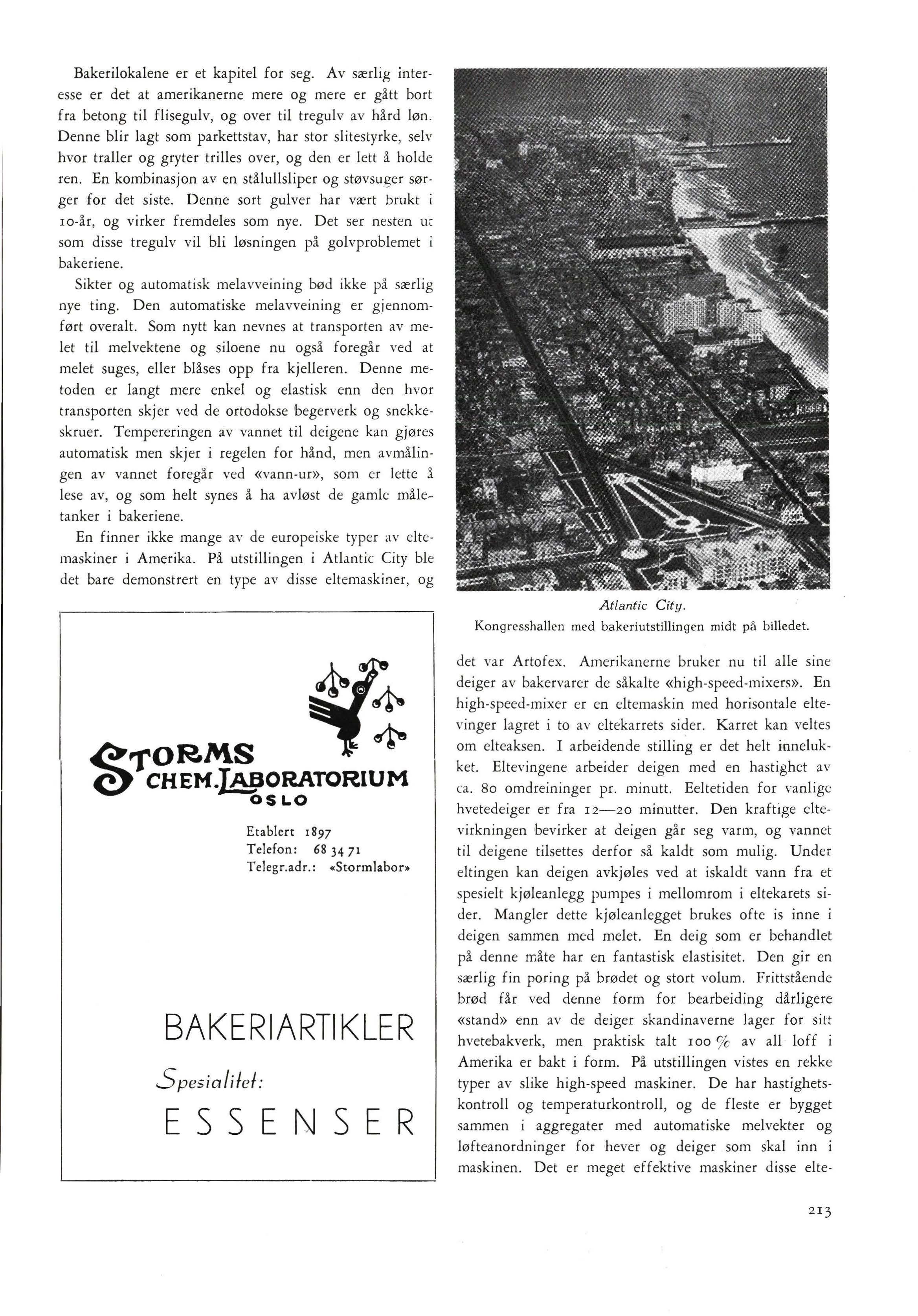 Kongresshallen med bakcriutstilling,m midt på billedet det var Artofex. Amerikanerne bruker nu til alle sine deiger av bakervarer de såkalte «high-speed-mixers». En high -speed -mixer er en eltemaskin med horisontale eltevinger lagre t i to av eltekarrets sider. Karret kan veltes om elteaksen. I arbeidende stilling er det helt innelukket. Eltevingene arbeider deigen med en hastighet av ca. 80 omdreininger pr. minutt. Eeltetiden for vanlige hvetedeiger er fra 12-20 minutter. Deh kraftige eltevirkningen bevirker at deigen går seg varm, og vannet til deigene tilsettes derfor så kaldt som mulig . Under eltingen kan deigen avkjøles ved at iskaldt vann fra et spesielt kjøleanlegg pumpes i mellomrom i eltekarets sider. Mangler dette kjøleanlegget brukes ofte is inne i deigen sammen med melet. En deig som er behandlet på denne måte har en fantastisk elastisitet. Den gir en særlig fin poring på brødet og stort volum. Frittstående brød får ved denne form for bearbeiding dårligere «stand» enn av de deiger skandinaverne lager for sitt hvetebakverk , men praktisk talt roo % av all loff i Amerika er bakt i form På utstillingen vistes en rekke typer av slike high-speed maskiner. De har hastighetskontroll og temperaturkontroll , og de fleste er bygget sammen i aggregater med automatiske melvekter og løfteanordninger for hever og deiger som skal inn i maskinen Det er meget effektive maskiner disse elte-