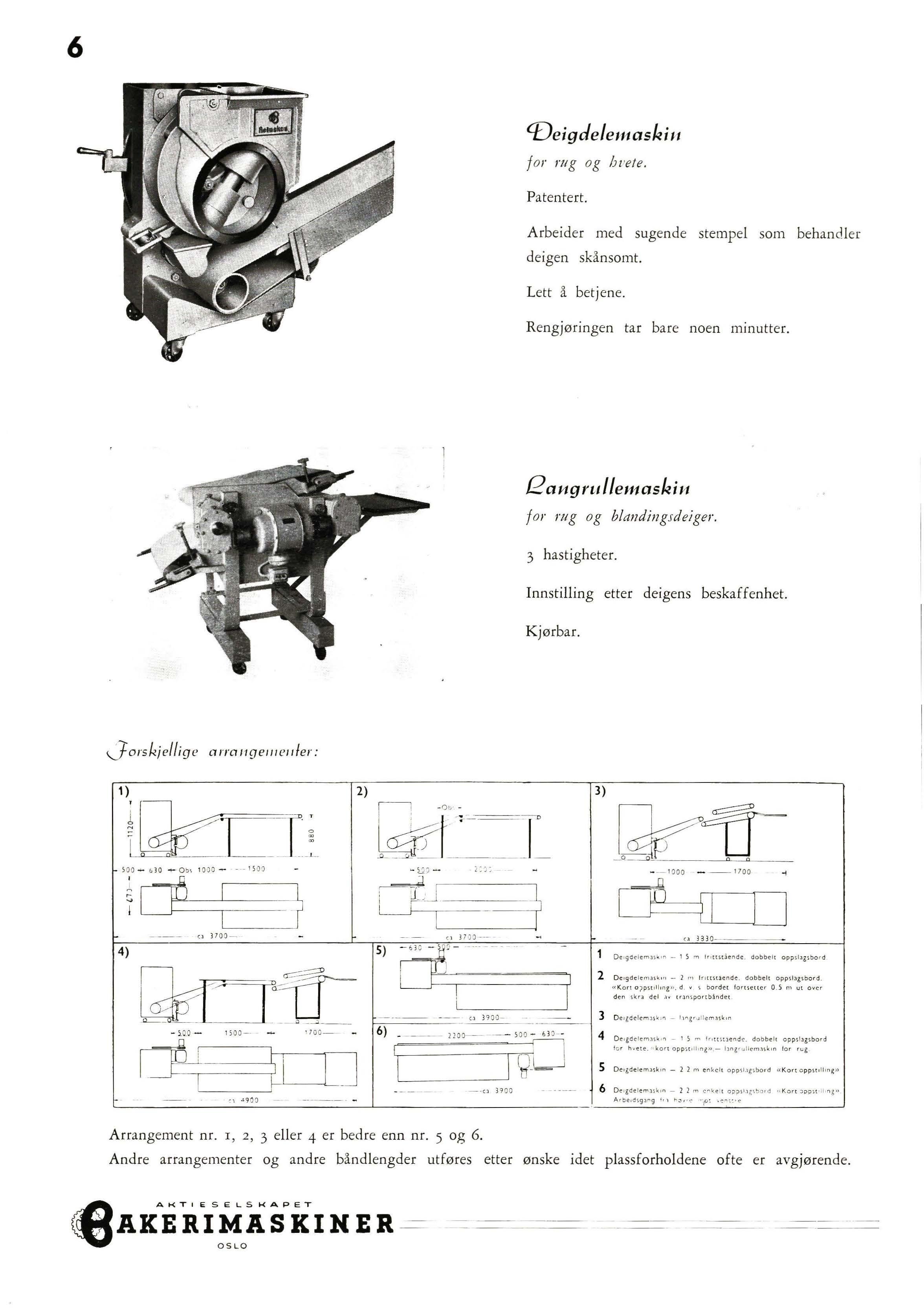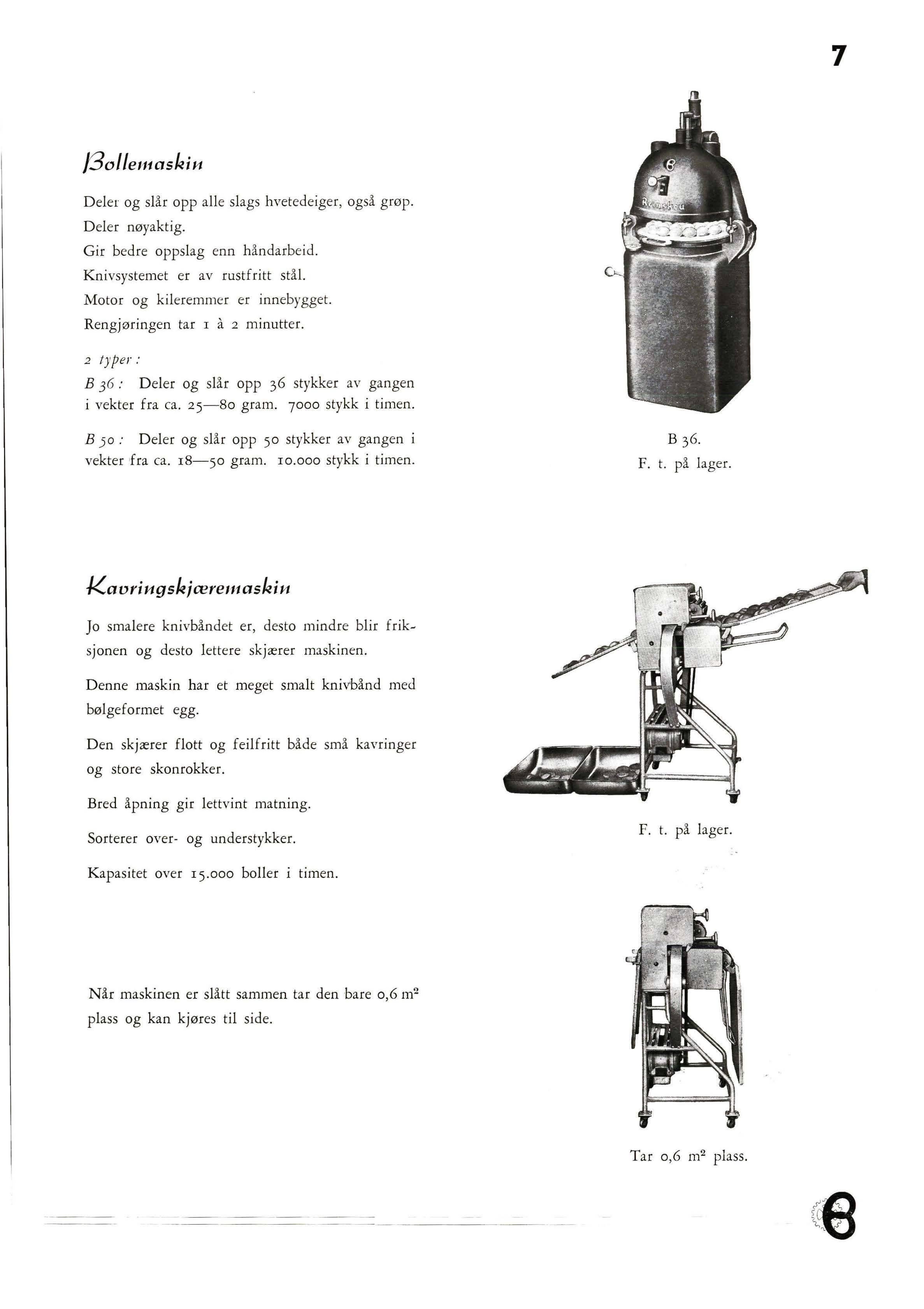 hva den ska l være. Her i g jærrommet er en temperatur på ca. 88 ° F ( ca. 30 ° C) og en fuktighetsgrad på ca. 70 5f det vanlige. Luftkondisjonerin g a nvendes også i raskerommet og i bakerilokalene, og i de siste mnstille s lufttemperatur og fuktigh etsg rad etter arten av arbeidet som utføres i lokalet. I lokalet for wienerbrød (Danish Pastr y) er luften således mere avkjølet enn i loffbakeri et. N å r deigen er ferdig til oppslag går den til oppslagsmaskinene. Her synes det å være skjedd en stabilisering For stort bakverk, og for det meste av det mindre bakverk var delemaskinene av samme type. Det var · den typen som også delvis er i bruk i skandinaviske bakeri_er , med sugekolben , og avstengningen av den ferdige deig ved det frem og tilbakegående spjeld. Avleveringen av den avdelte deig skjedde i 1-6 stykker i maskiner med like mange «lommer». Bare hvor det gjaldt riktig smått bakverk på ca . 100 gr og mindre kan en finne andre former for oppdeling av deigen , for eksempel bollemaskinen hvor deigen fylles i en beholder som lukk es og settes under trykk av inn pumpet luft Avdelingen av den utpressede deig er da meget lett. Ved e n av disse maskiner merket en seg en annen detalj. Istedenfor som va nlig å avlevere de avdelte deigstykkene på et transportbånd anvendtes her et roterende bord, som de ig stykkene kom ut på. Fordelen ved dette er at deigstykkene ikke triller ut over bordets kant, som ofte k a n være tilf e ll e ved anvendelse av transportbånd