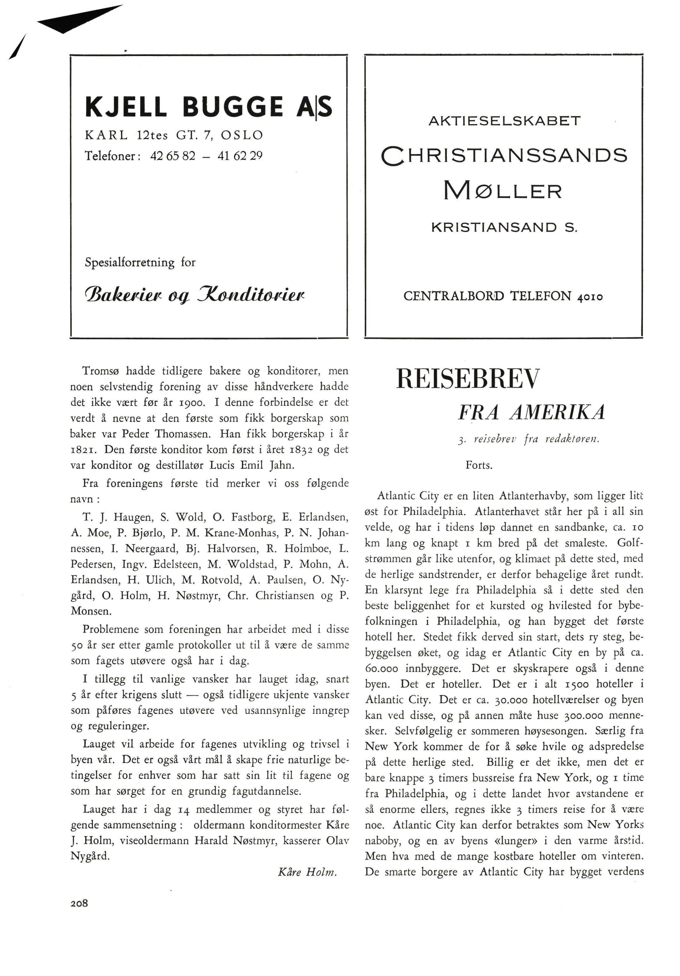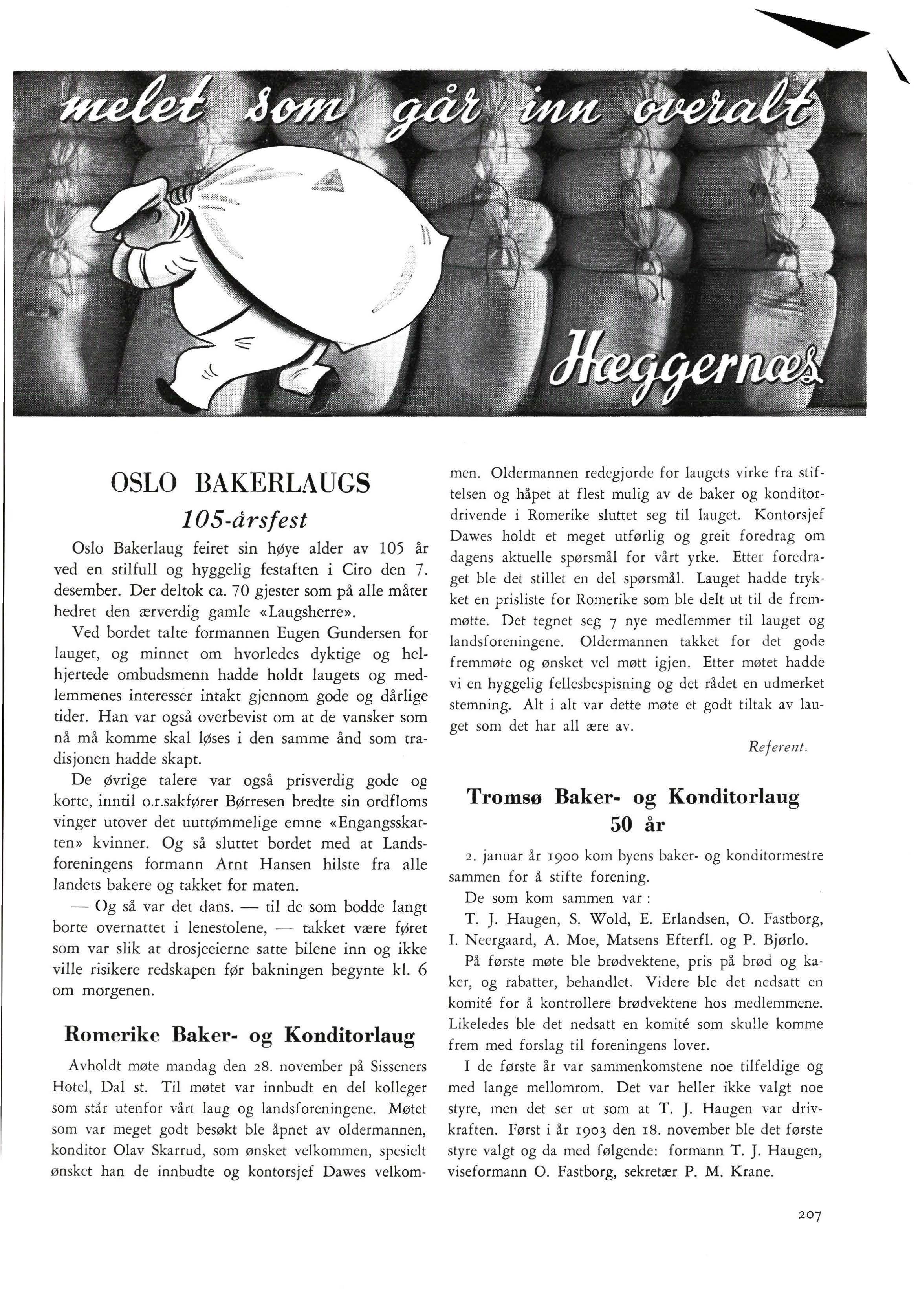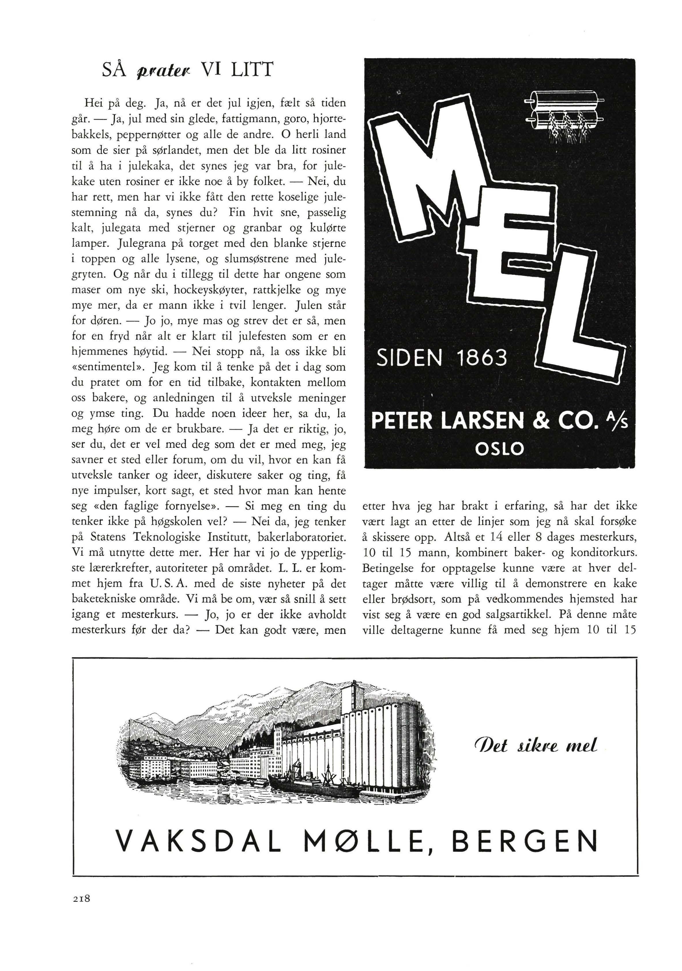Hei på deg. Ja, nå er det jul igjen, fælt så tiden går. - Ja, jul med sin glede, fattigmann, goro, hjortebakkels, peppernØtter og alle de andre 0 herli land som de sier på sørlandet, men det ble da litt rosiner til å ha i julekaka , det synes jeg var bra , for julekake uten rosiner er ikke noe å by folket. - Nei, du har rett , men har vi ikke fått den rette koselige julestemning nå da, synes du? Fin hvit sne, passelig kalt , julegata med stjerner og granbar og kulørte lamper. Julegrana på torget med den blanke stjerne i toppen og alle lysene, og slumsøstrene med julegryten. Og når du i tillegg til dette har angene som maser om nye ski , hockeyskøyter, rattkjelke og mye mye mer, da er mann ikke i tvil lenger. Julen står for døren. - Jo jo, mye mas og strev det er så, men for en fryd når alt er klart til julefesten som er en hjemmenes høytid - Nei stopp nå, la oss ikke bli «sentimentel». Jeg kom til å tenke på det i dag som du pratet om for en tid tilbake, kontakten mellom oss bakere, og anledningen til å utveksle meninger og ymse ting. Du hadde noen ideer her , sa <lu, la meg høre om de er brukbare. - Ja det er riktig, jo, ser du, det er vel med deg som det er med meg, jeg savner et sted eller forum , om du vil, hvor en kan få utveksle tanker og ideer, diskutere saker og ting, få nye impulser, kort sagt , et sted hvor man kan hente seg «den faglige fornyelse». - Si meg en ting du tenker ikke på høgskolen vel? - Nei da, jeg tenker på Statens Teknologiske Institutt, bakerlaboratoriet. Vi må utnytte dette mer. Her har vi jo de ypperligste lærerkrefter, autoriteter på området. L. L. er kommet hjem fra U. S. A. med de siste nyheter på det baketekniske område Vi må be om, vær så snill å sett igang et mesterkurs. - Jo, jo er der ikke avholdt mesterkurs før der da? - Det kan godt være, men
