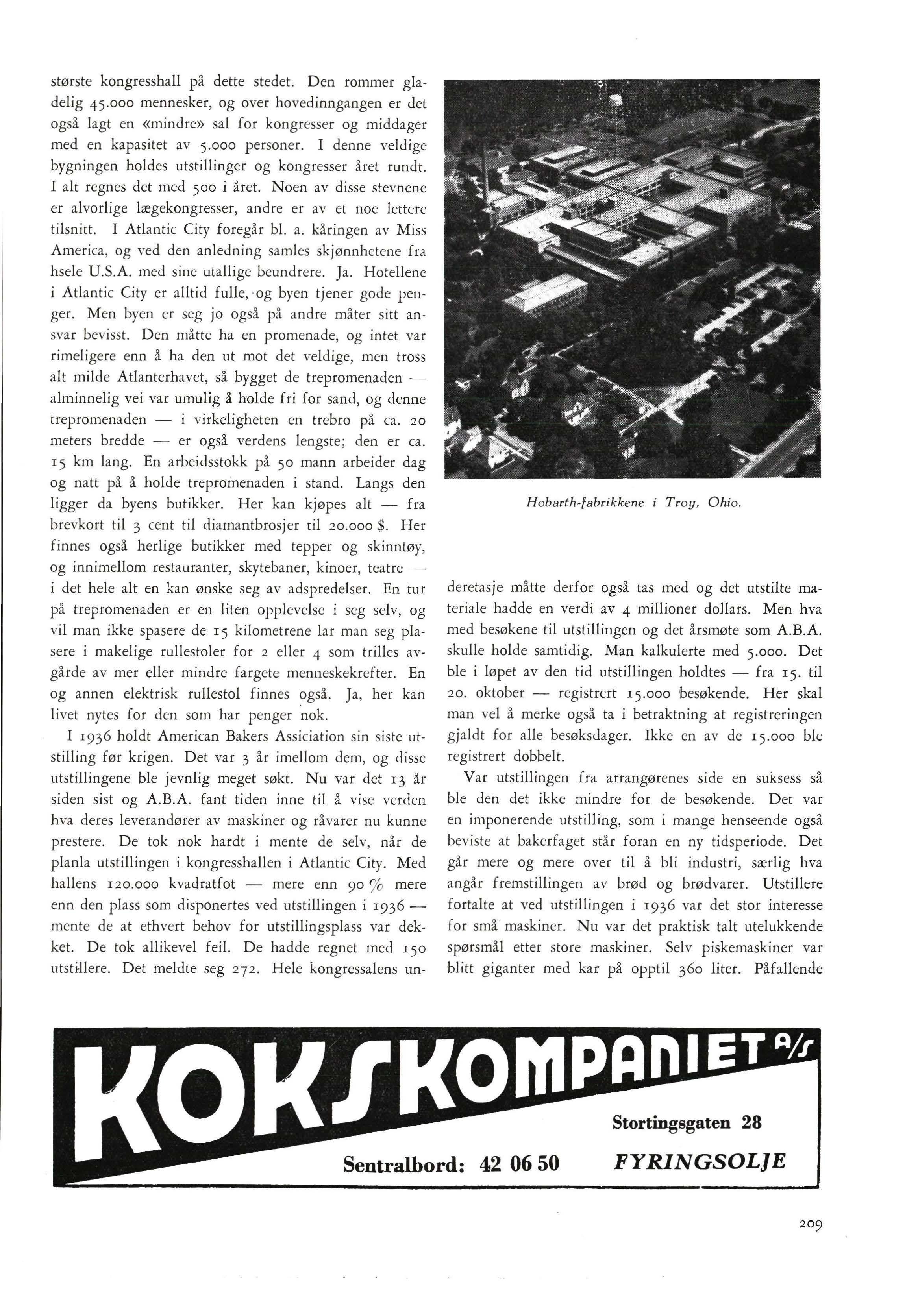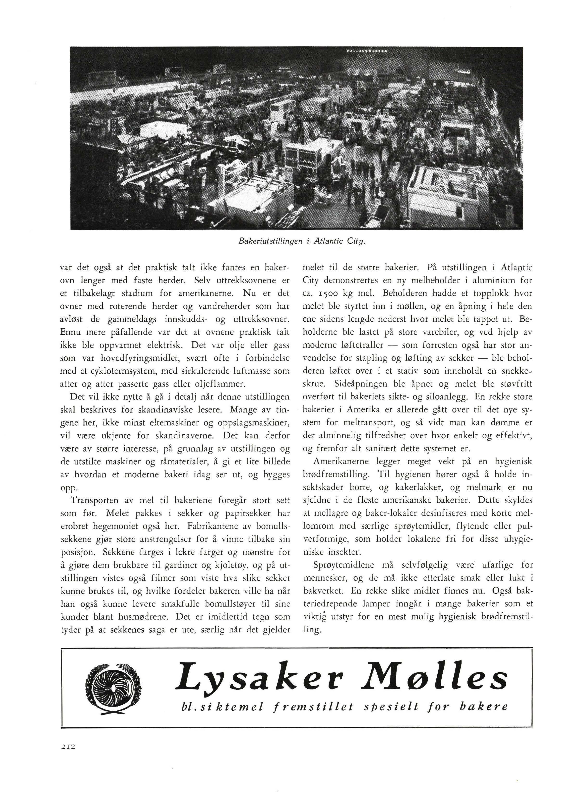 I 1936 holdt American Bakers Assiciation sin siste utstilling før krigen. Det var 3 år imellom dem, og disse utstillingene ble jevnlig meget søkt. Nu var det 13 år siden sist og A.B.A. fant tiden inne til å vise verden hva deres leverandører av maskiner og råvarer nu kunne prestere De tok nok hardt i mente de selv, når de planla utstillingen i kongresshallen i Atlantic City. Med hallens 120.000 kvadratfot - mere enn 90 % mere enn den plass som disponertes ved utstillingen i 1936mente de at ethvert behov for utstillingsplass var dekket. De tok allikevel feil. De hadde regnet med 150 utst~llere Det meldte seg 272. Hele kongressalens un-