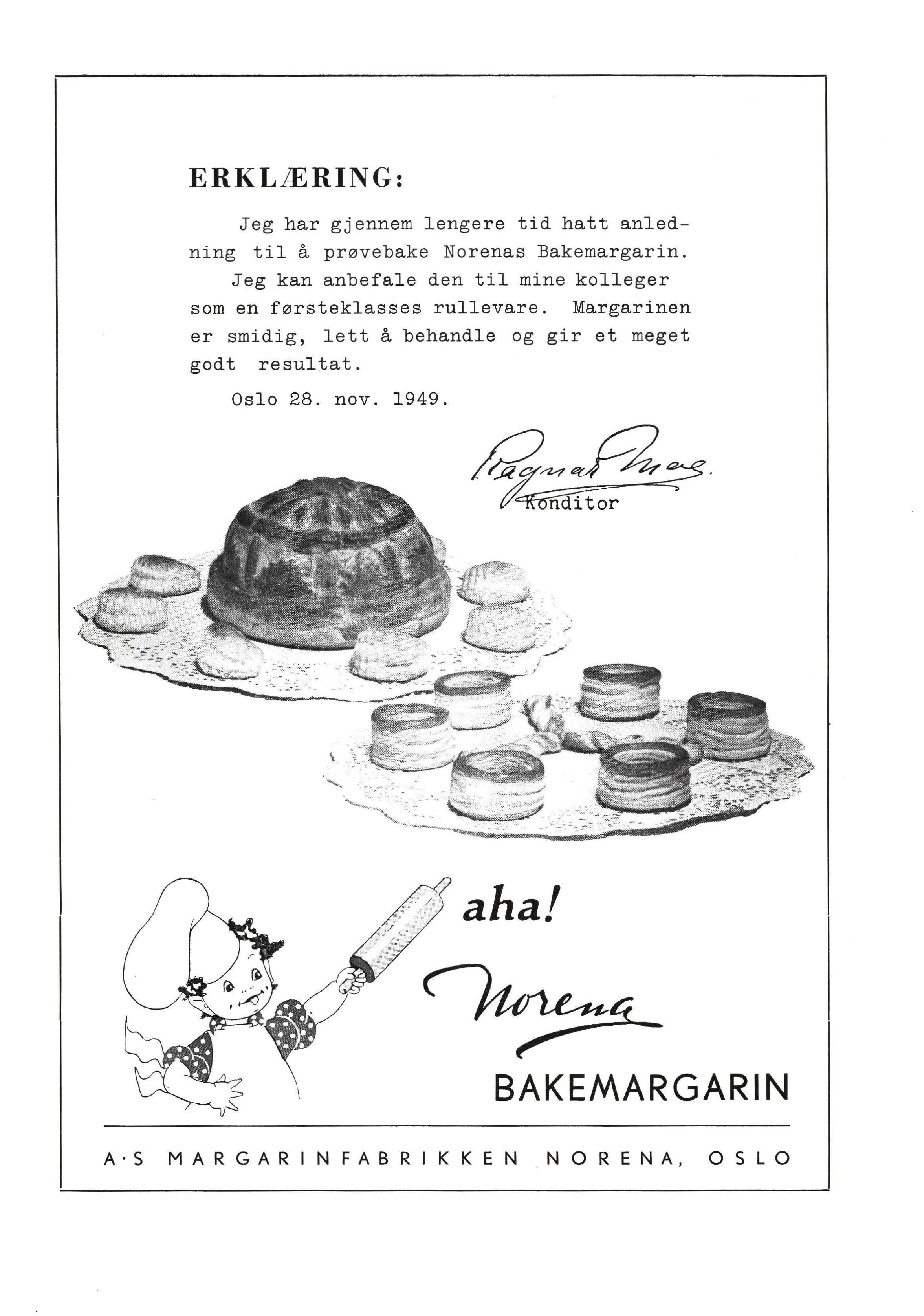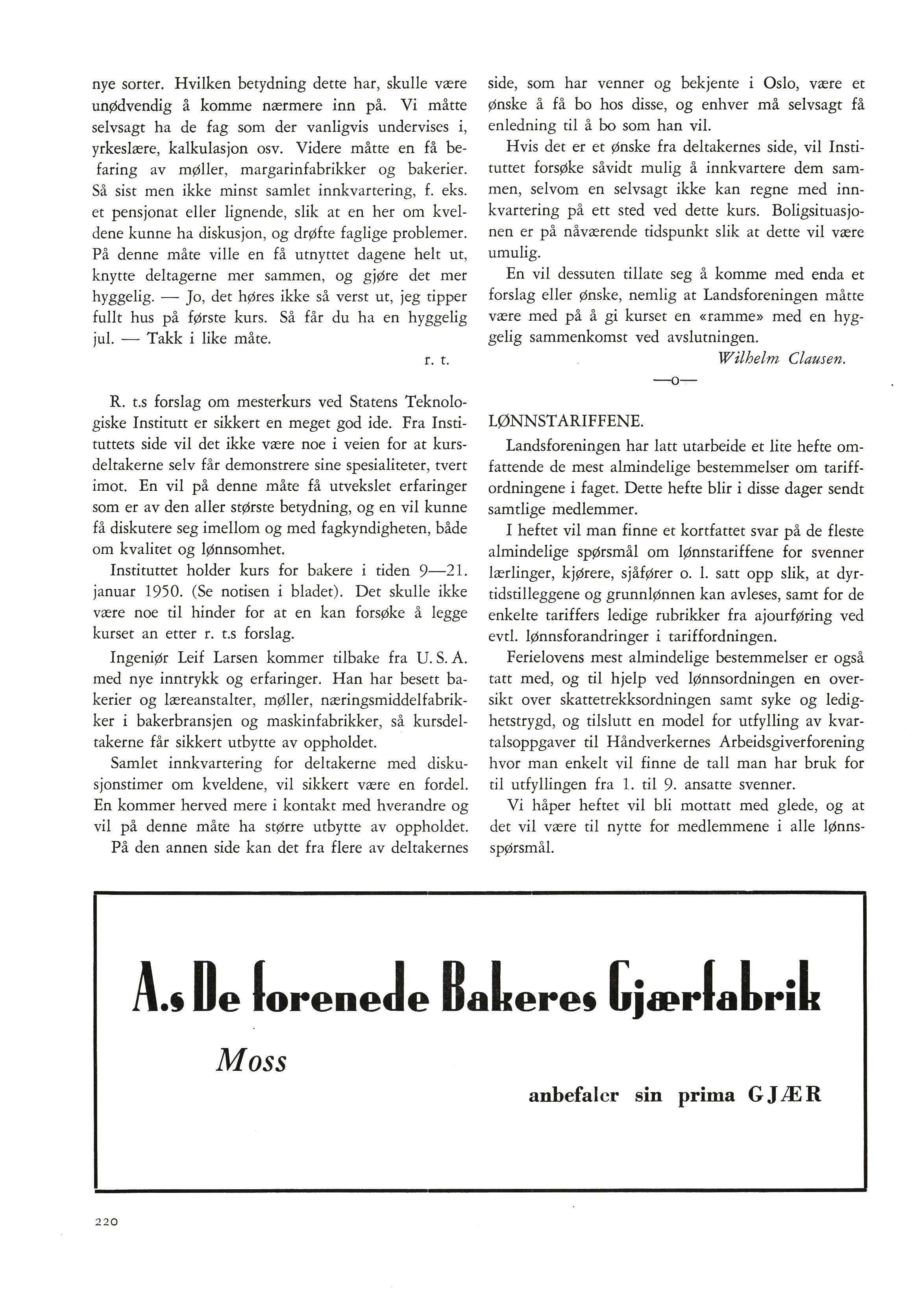 nye sorter. Hvilken betydning dette har, skulle være unødvendig å komme nærmere inn på. Vi måtte selvsagt ha de fag som der va nligvis undervises i , yrkeslære, kalkulasjon osv. Videre måtte en få befaring av møller, margarinfabrikker og bakerier. Så sist men ikke minst samlet innkvartering, f. eks et pensjonat eller lignende , slik at en her om kveldene kunne ha diskusjon , og drøfte faglige problemer. På denne måte ville en få utnyttet dagene helt ut , knytte deltagerne mer sammen, og gjøre det mer hyggelig . - Jo, det høres ikke så verst ut , jeg tipper fullt hus på første kurs. Så få r du ha en hyggelig jul. - Takk i like måte.