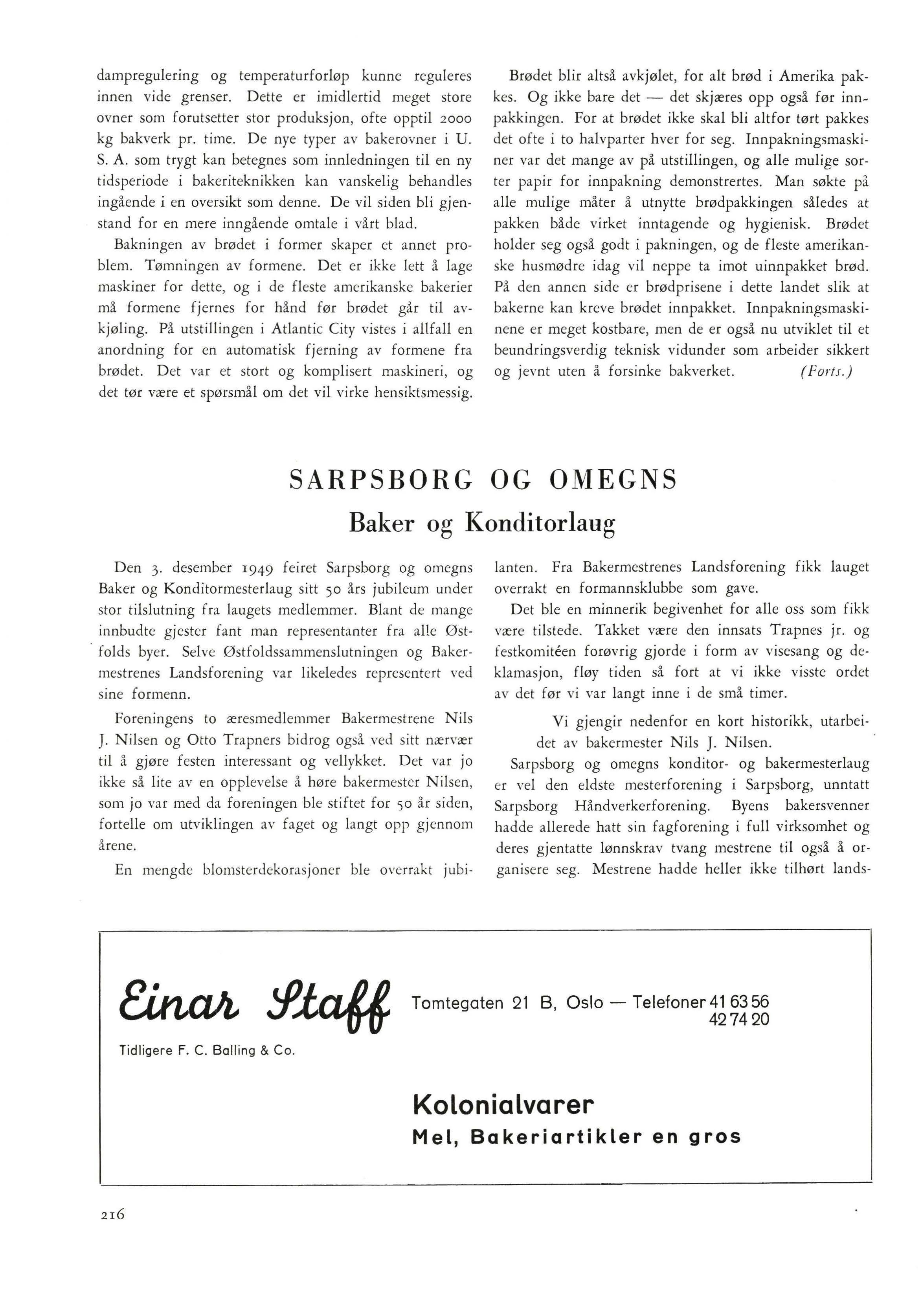 Den 3. desember 1949 feiret Sarpsborg og omegns Baker og Konditormesterlaug sitt 50 års jubileum under stor tilslutning fra laugets medlemmer. Blant de mange innbudte gjester fant man representanter fra alle Østfolds byer. Selve Østfoldssammenslutningen og Bakermestrenes Landsforening var likeledes representert ved sine formenn