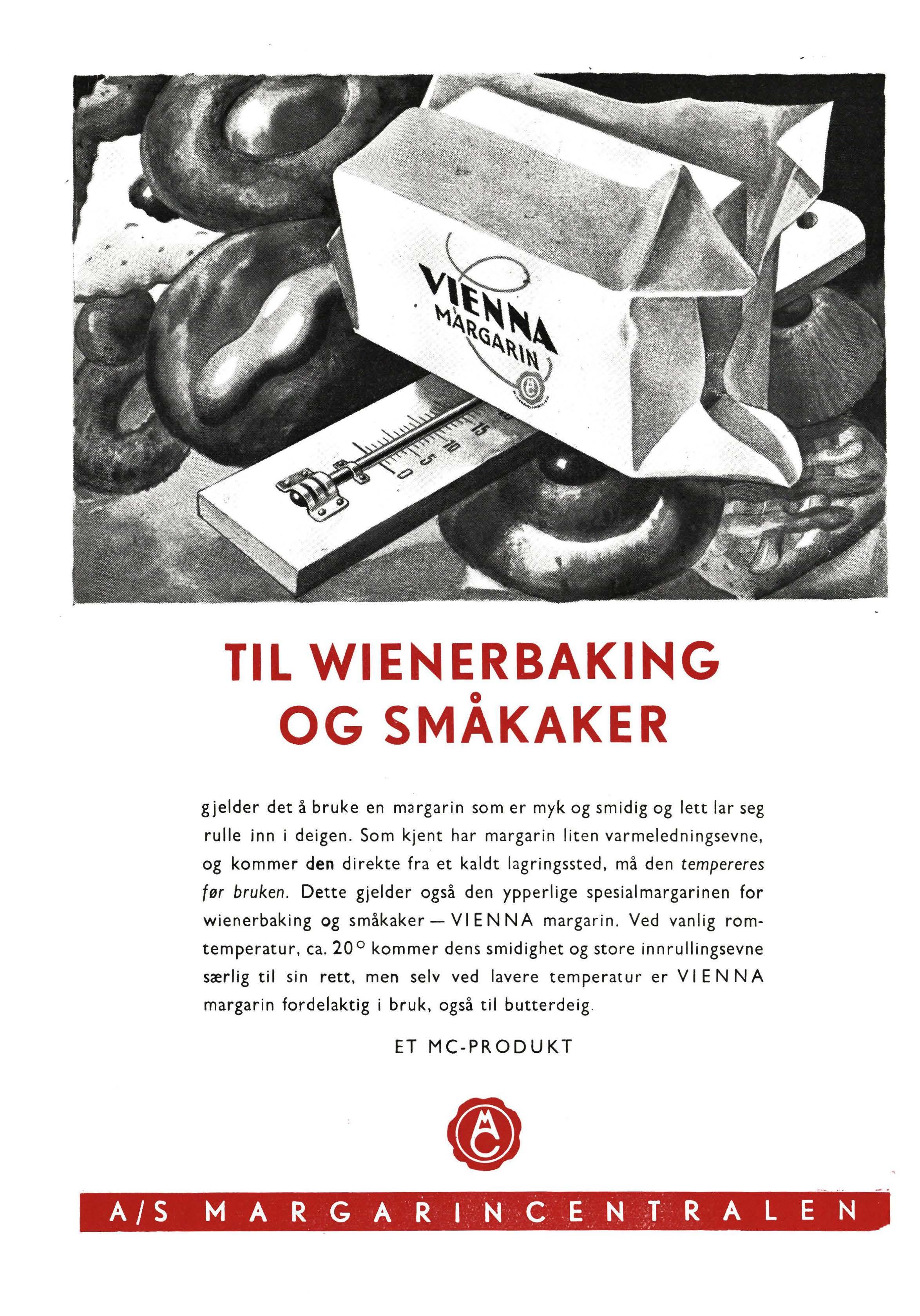 gjelder det å bruke en margarin som er myk og smidig og lett lar seg rulle inn i deigen. Som kjent har margarin liten varmeledningsevne , og kommer den direkte fra et kaldt lagringssted, må den tempereres før bruken Dette gjelder også den ypperlige spesialmargarinen for wienerbaking og småkaker - V I ENN A margarin Ved vanlig romtemperatur, ca. 20 ° kommer dens smidighet og store innrullingsevne særlig til sin rett, men selv ved lavere temperatur er V I ENN A margarin fordelaktig i bruk, også til butterdeig . ET MC-PRODUKT