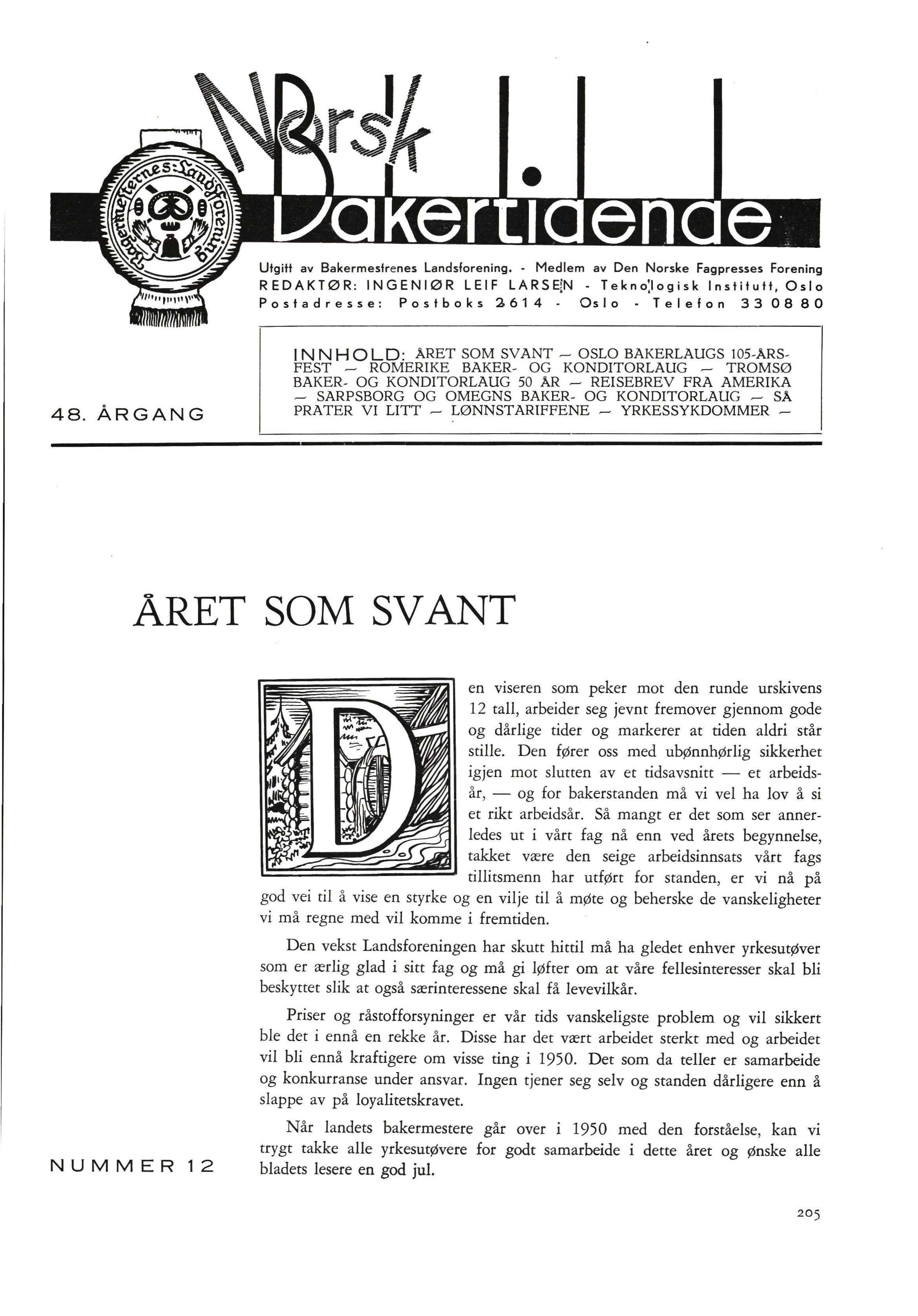 en viseren som peker mot den runde urskivens 12 tall, arbeider seg jevnt fremover gjennom gode og dårlige tider og markerer at tiden aldri står stille. Den fører oss med ubønnhørlig sikkerhet igjen mot slutten av et tidsavsnitt - et arbeidsår, - og for bakerstanden må vi vel ha lov å si et rikt arbeidsår Så mangt er det som ser annerledes ut i vårt fag nå enn ved årets begynnelse, takket være den seige arbeidsinnsats vårt fags tillitsmenn har utført for standen, er vi nå på god vei til å vise en styrke og en vilje til å møte og beherske de vanskeligheter vi må regne med vil komme i fremtiden.