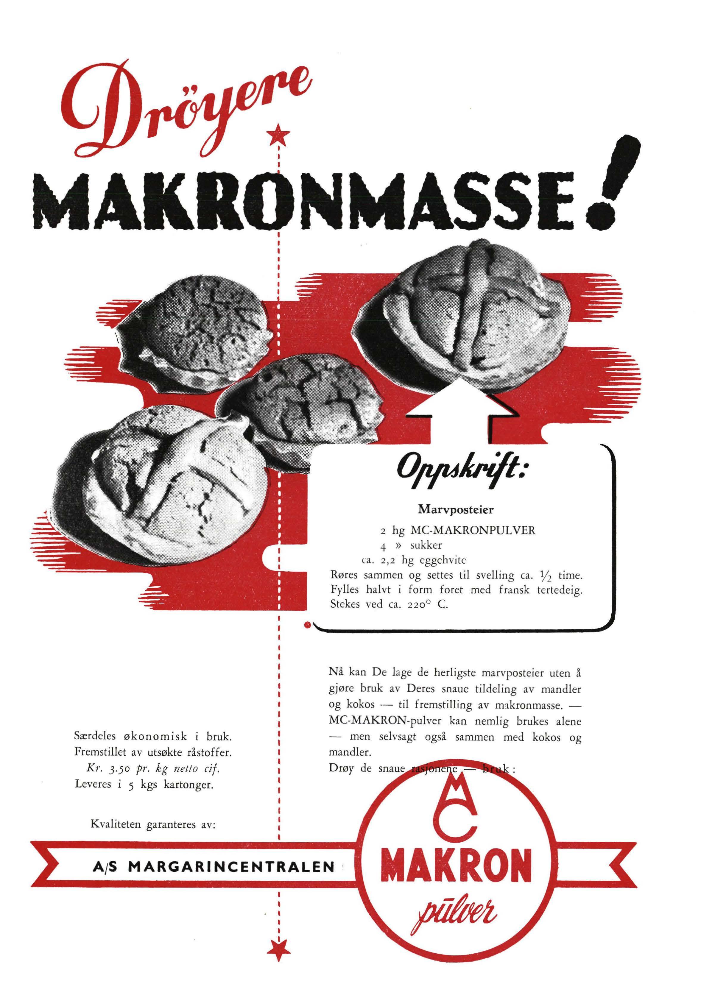 Nå kan De lage de herligste marvposteier uten å gjøre bruk av Deres snaue tildeling av mandler og kokos - til fremstilling av mikronmasse.MC-MAKRON-pulver kan nemlig brukes alene - men selvsagt også sammen med kokos og mandler.