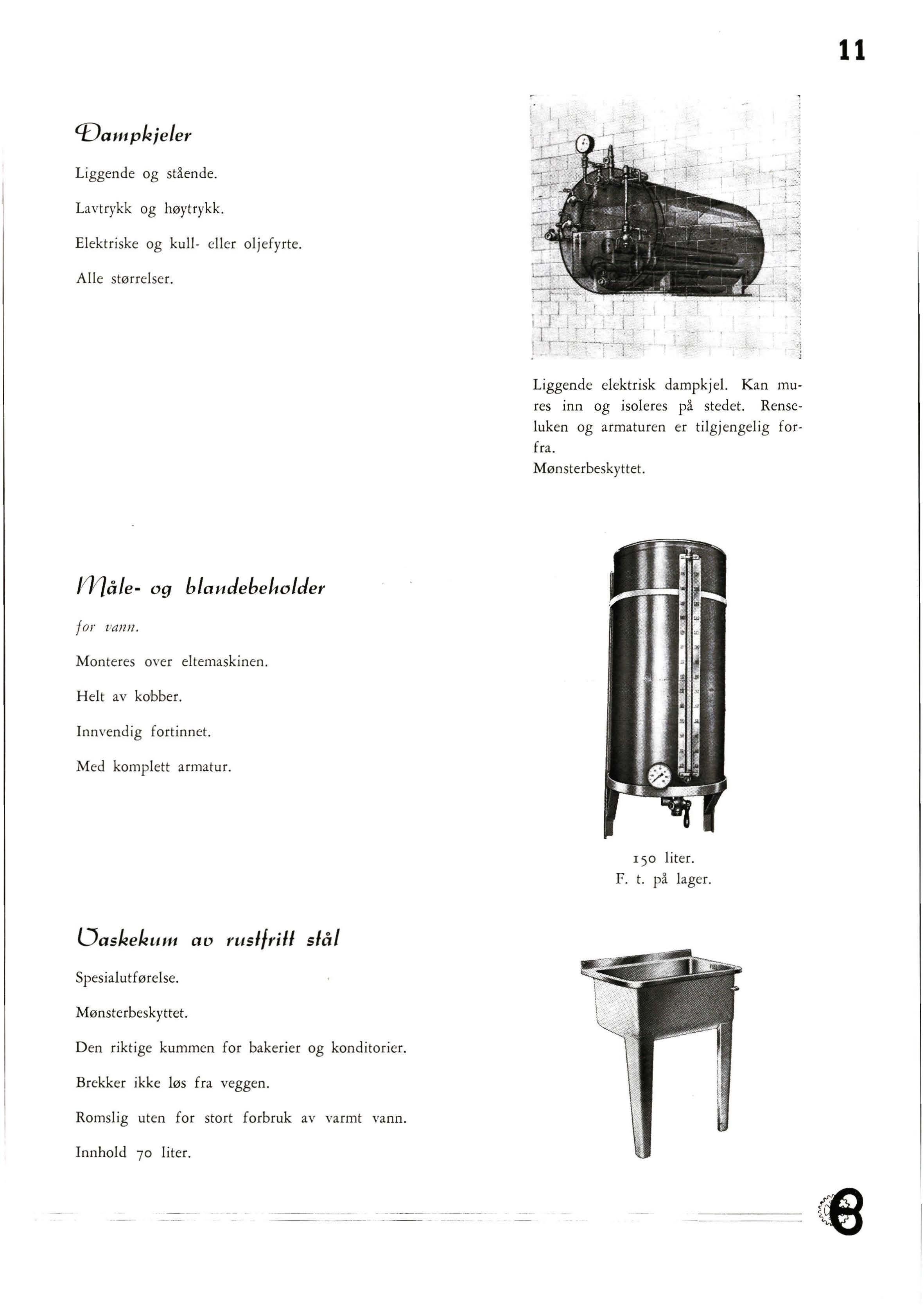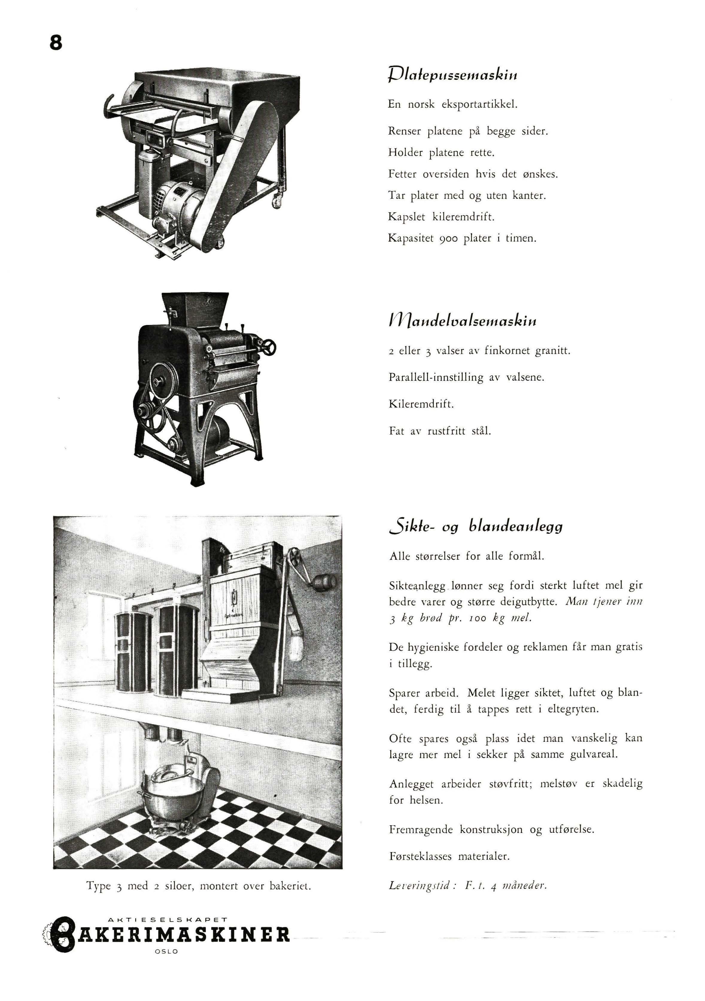 Bakerilokalene er et kapitel for seg. Av særlig interesse er det at amerikanerne mere og mere er gått bort fra betong til flisegulv, og over til tregulv av hård løn Denne blir lagt som parkettstav, har stor slitestyrke, selv hvor traller og gryter trilles over, og den er lett å holde ren. En kombinasjon av en stålullsliper og støvsuger sørger for det siste. Denne sort gulver har vært brukt i ro-år , og virker fremdeles som nye Det ser nesten u t som disse tregulv vil bli løsningen på golvproblemet i bakeriene.
