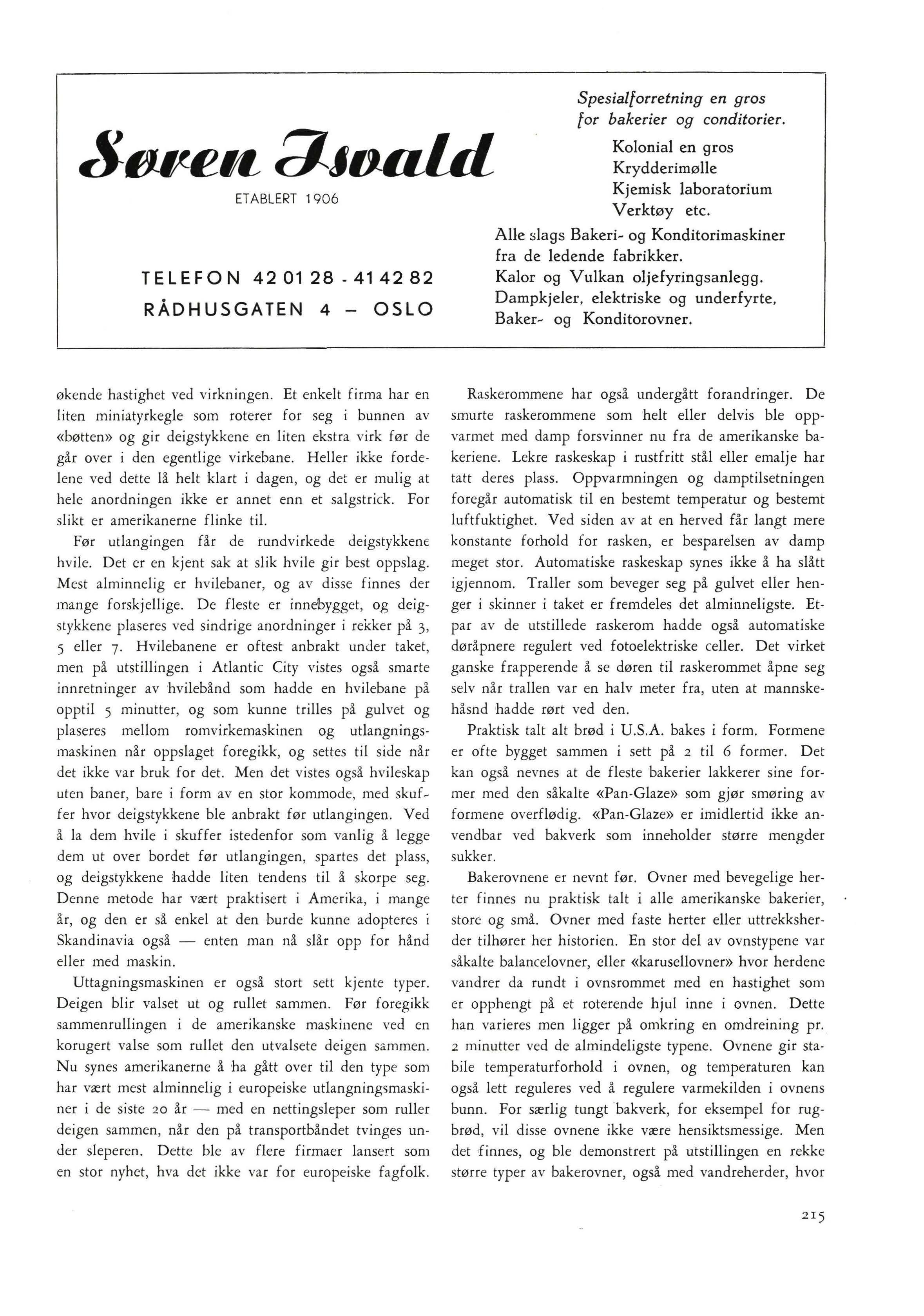Brødet blir altså avkjølet, for alt brød i Amerika pakkes. Og ikke bare det - det skjæres opp også før innpakkingen. For at brødet ikke skal bli altfor tørt pakkes det ofte i to halvparter hver for seg. Innpakningsmaskiner var det mange av på utstillingen, og alle mulige sorter papir for innpakning demonstrertes Man søkte på alle mulige måter å utnytte brødpakkingen således at pakken både virket inntagende og hygienisk. Brødet holder seg også godt i pakningen, og de fleste amerikanske husmødre idag vi l neppe ta imot uinnpakket brød. P å den annen side er brødprisene i dette landet slik at bakerne kan kreve brødet innpakket. Innpakningsmaskinene er meget kostbare , men de er også nu utviklet til et beundringsverdig teknisk vidunder som arbeider sikkert og jevnt uten å forsinke bakverket. (Forts.)