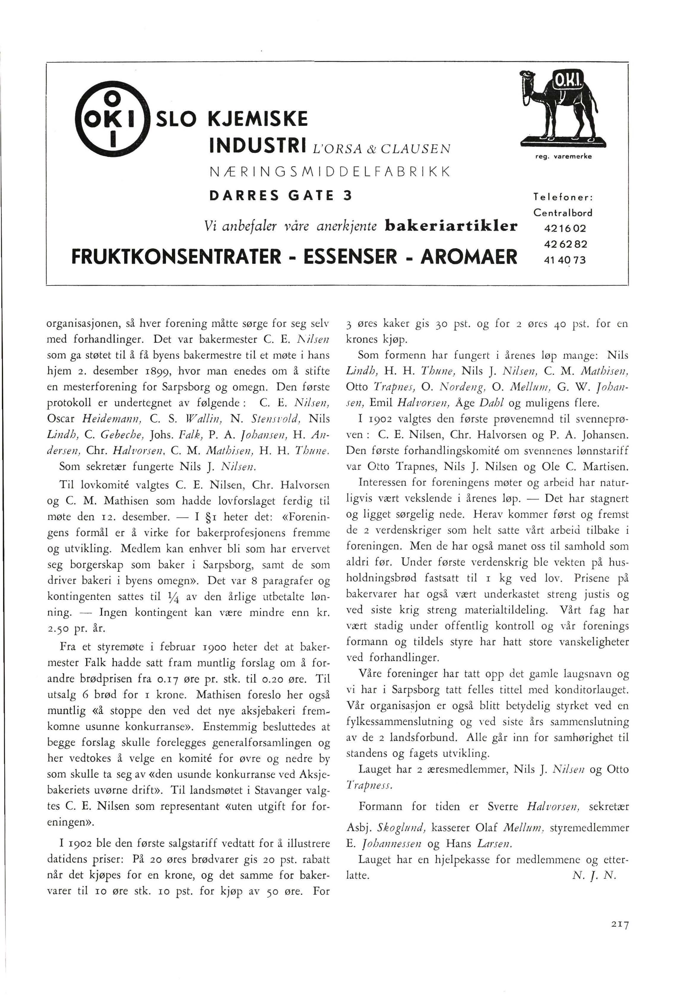Som formenn har fungert i årenes løp mange: Nils Lindh , H. H. Th1111e, Nils J. Nilsen , C. M. Mathise11 , Otto Trapnes, 0 . No rde11 g, 0. Mel/11111 , G. W . f ohansen, Emil Halvorsen , Age Dahl og muligens flere I 1902 valgtes den første prøvenemnd til svenneprøven : C. E. Nilsen, Chr. Halvorsen og P. A. Johansen. Den første forhandlingskomite om svennenes lønnstariff var Otto Trapnes , Nils J. Nilsen og Ole C. Martisen. Int e ressen for foreningens møter og arbeid har naturligvis vært vekslende i årenes løp. - Det har stagnert og ligget sørgelig nede. Herav kommer først og fremst de 2 verdenskriger som helt satte vå rt arbeid tilbake i foreningen. Men de har også manet oss til samhold som aldri før. Under første verdenskrig ble vekten på husholdningsbrød fastsatt til 1 kg ved lov. Prisene på bakervarer har også vært underkastet streng justis og ved siste krig streng materialtildeling. Vårt fag har vært stadig under offentlig kontroll og vår forenings formann og tildels styre har hatt store vanskeligheter ved forhandlinger.