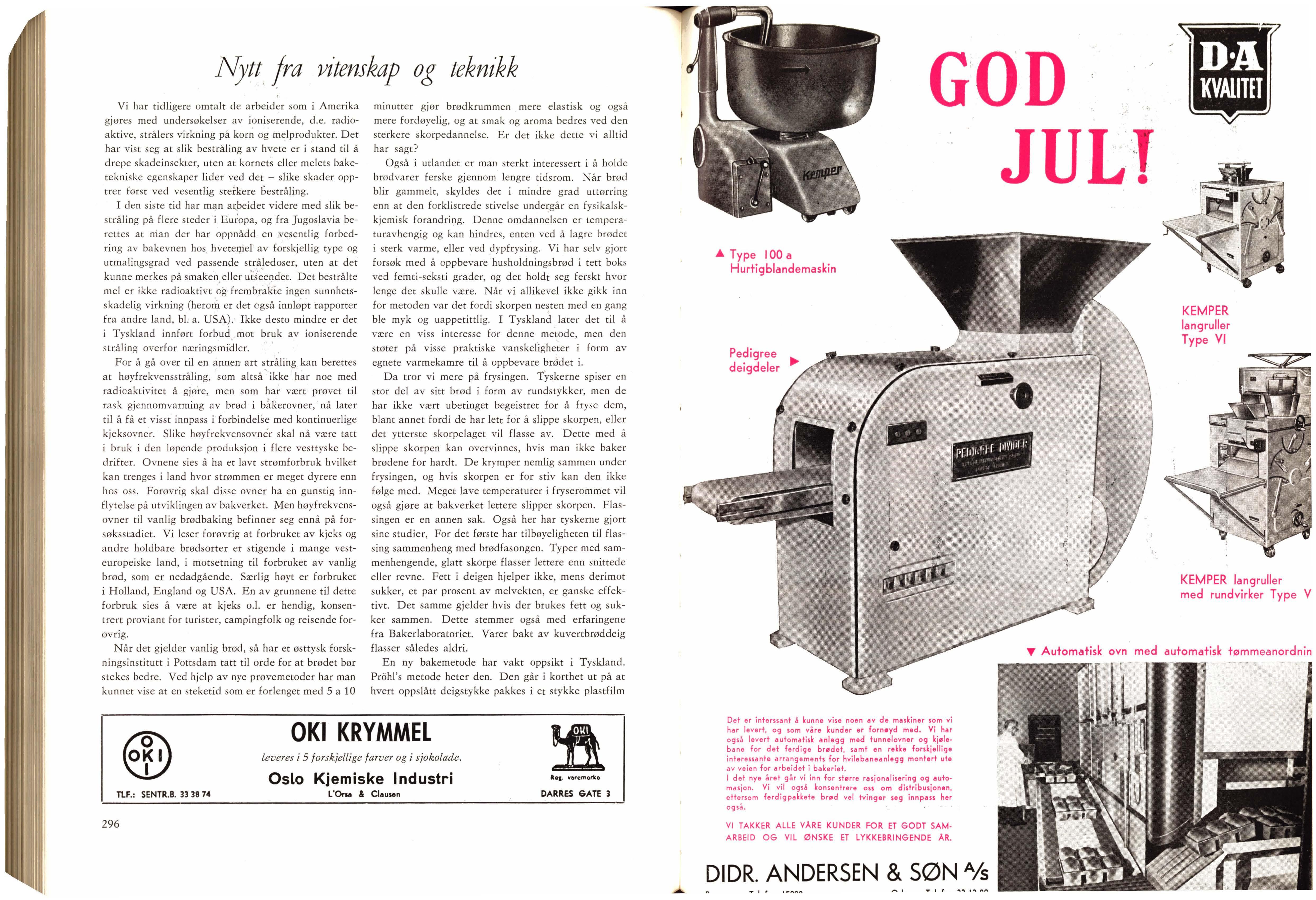 Også i utlandet er man sterkt interessert i å holde brødvarer ferske gjennom lengre tidsrom. Når brød blir gammelt, skyldes det i mindre grad uttørring enn at den forklistrede stivelse undergår en fysikalskstråling på flere steder i Europa, og fra Jugoslavia be- kjemisk forandring. Denne omdannelsen er temperarettes at man der har oppnådd en :vesentlig forbed- turavhengig og kan hindres, enten ved å lagre brødet ring av bakevnen hos hveteqiel av forskjellig type og utmalingsgrad ved passende stråledoser, uten at det kunne merkes på smaken , eller uti;~endet. Det bestrålte mel er ikke radioaktivt og frembrakte ingen sunnhetsskadelig virkning (herom er det også innløpt rapporter fra andre land, bl: a. USA). Ikke desto mindre er det i Tyskland innført forbud _ mot bruk av ioniserende stråling overfor næringsmidler. For å gå over til en annen art stråling kan berettes at høyfrekvensstråling, som altså · ikke ),ar noe med radioaktivitet å gjøre, men som har vært prøvet til rask gjennomvarming av brød i b~kerovner, nå later til å få et visst innpass i forbindelse med kontinuerlige kjeksovner. Slike høyfrekvensovner skal nå være tatt i bruk i den løpende produksjon i flere vesttyske bedrifter. Ovnene sies å ha et lavt strømforbruk hvilket kan trenges i land hvor strømmen er meget dyrere enn hos oss. Forøvrig skal disse ovner ha en gunstig innflytelse på utviklingen av bakverket Men høyfrekvensovner til vanlig brødbaking befinner seg ennå på forsøksstadiet. Vi leser forøvrig at forbruket av kjeks og andre holdbare brødsorter er stigende i mange vesteuropeiske land, i motsetning til forbruket av vanlig brød, som er nedadgående. Særlig høyt er forbruket i Holland, England og USA. En av grunnene til dette forbruk sies å være at kjeks o.l. er hendig, konsentrert proviant for turister, campingfolk og reisende forøvrig.