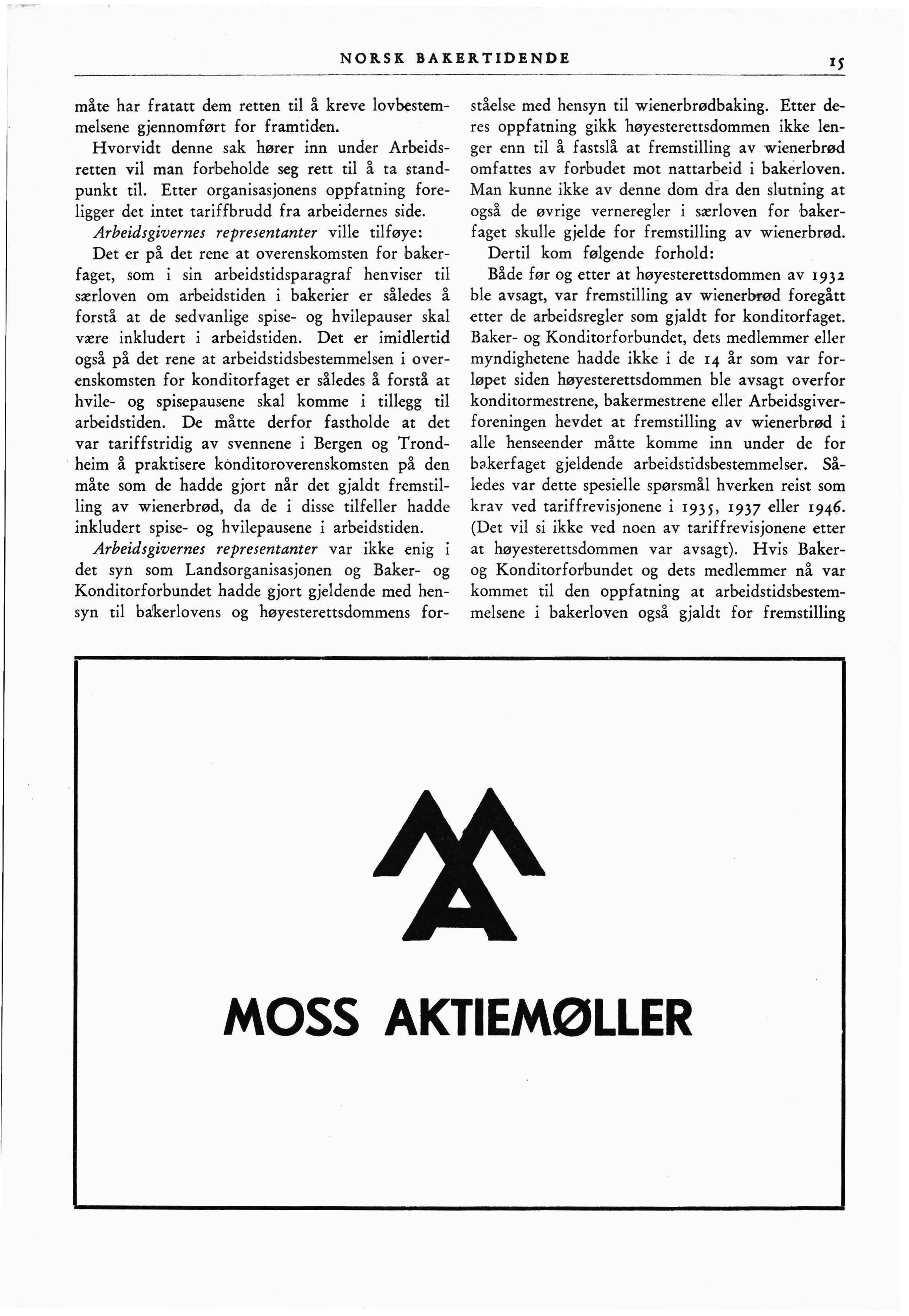 av wienerbrød, måtte de etter arbeidsgivernes oppfatning ha tariffplikt til først å få fastslått at denne oppfatning av loven var den riktige; De · hadde ikke tariff rett til uten videre å gå over til en annen aribeidstidspraksis enn den som faktisk hadde vært gjeloende i flere å~tier, deriblant også tiden etter at høyesterettsdommen ble avsagt. Også dette var etter arbeidsgivernes oppfatning en tariff stridig fremgangsmåte. De måtte derfor fastholde kravet, og de forbeholdt seg å innbringe for Arbeidsretten spørsmålet om hvorvidt ikke Baker- og Konditorforbundet, dets avdelinger og medlemmer hadde gjort seg skyldig i tariffstridig opptreden ved den fremgangsmåte som var valgt i dette tilfelle. De tok også forbehold om under arbeidsrettssaken å reise krav om erstatning for det tap bedriftene hadde lidt ved at svennene hadde tillatt seg en arbe idstid som etter arbeidsgivernes oppfatning v ar kortere enn den de pliktet etter overenskomsten for konditorfaget.