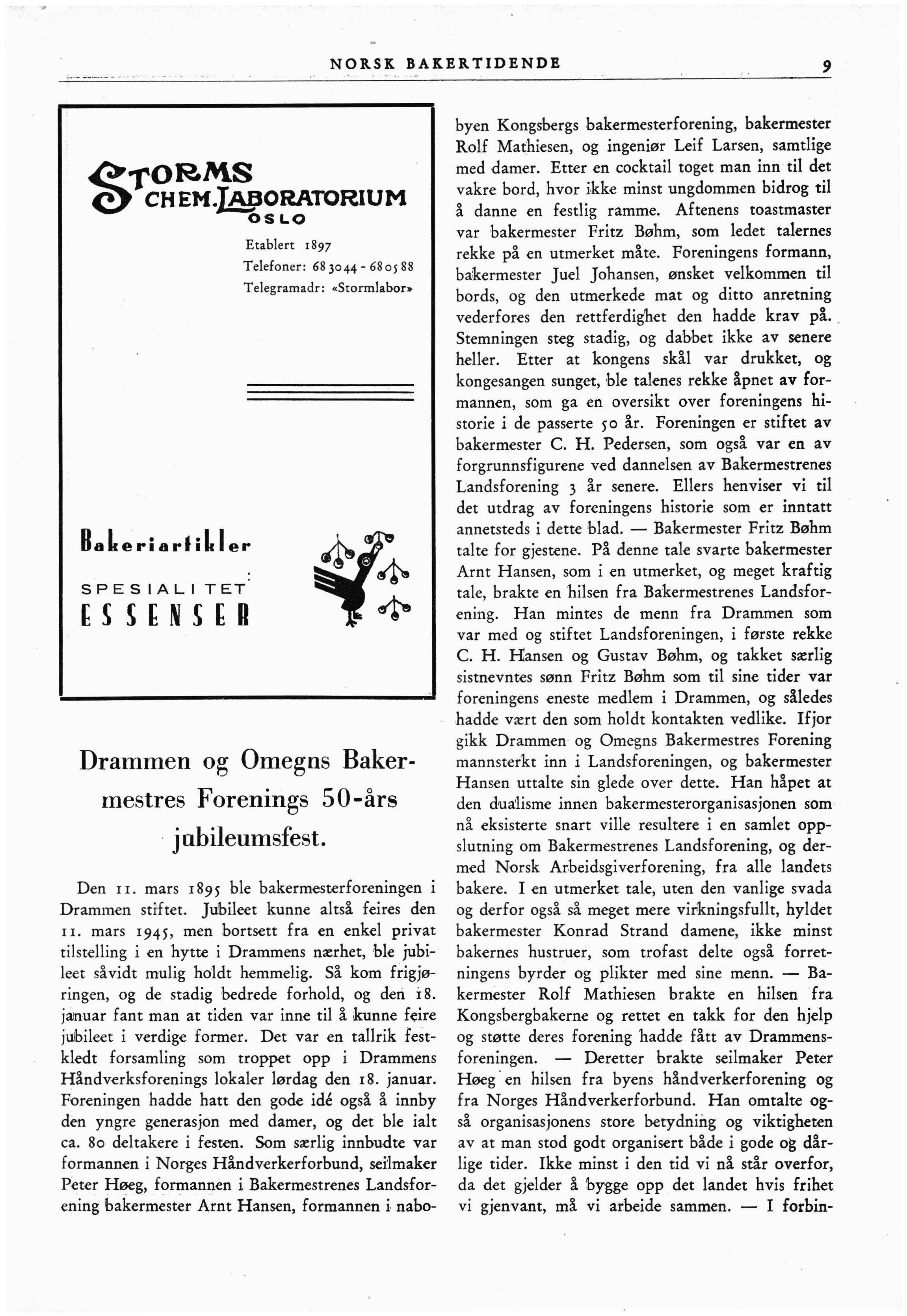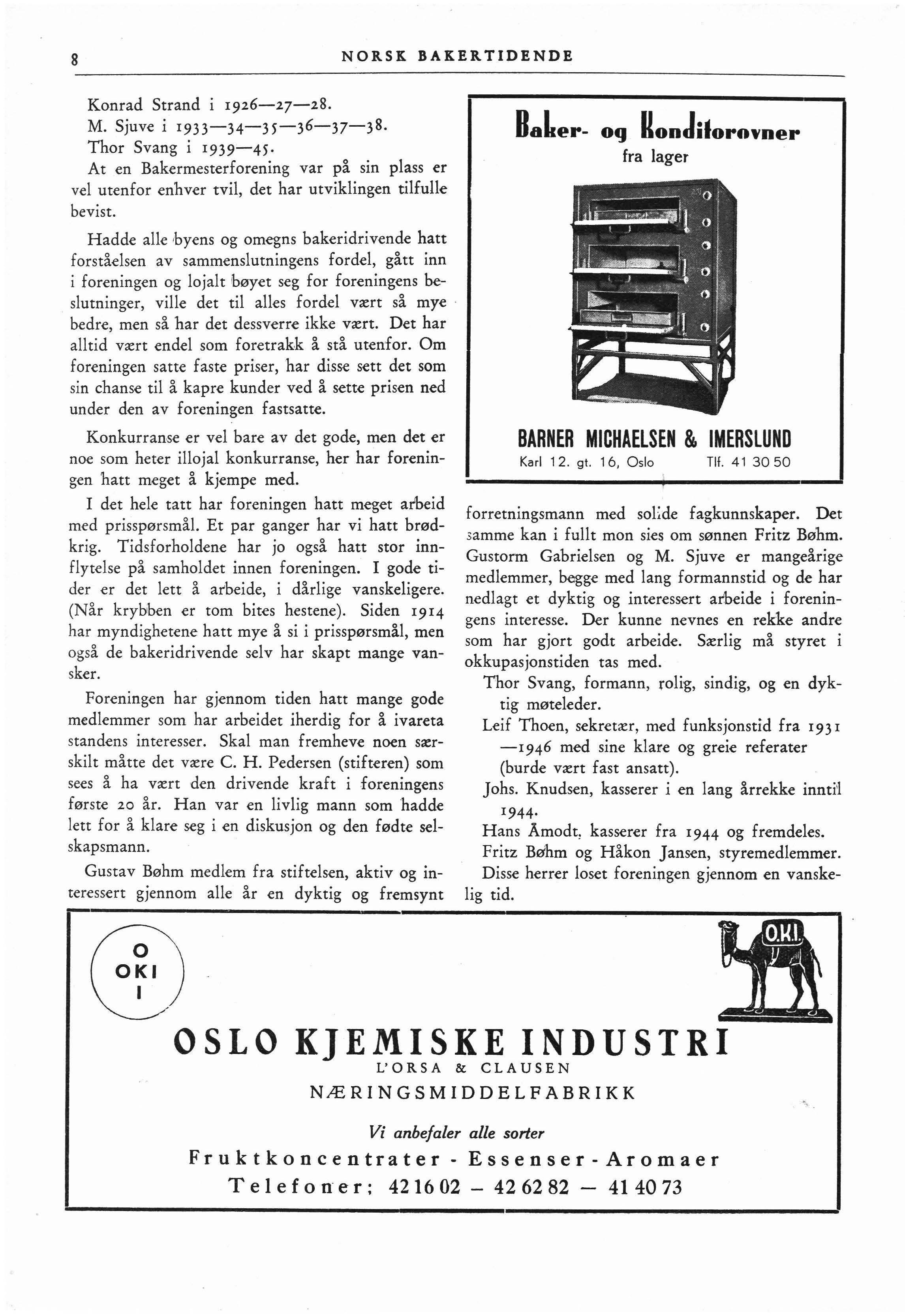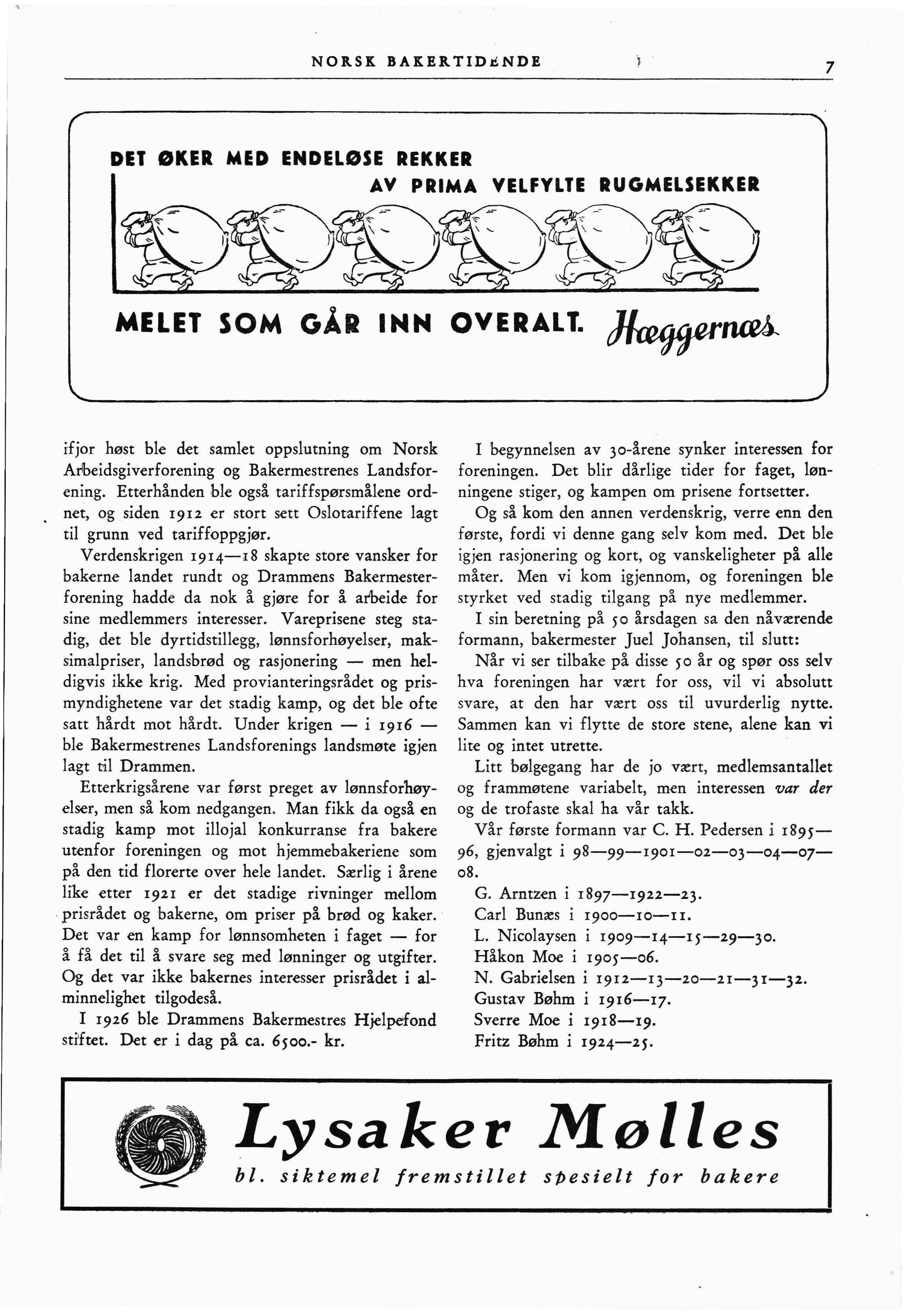 den enkelte, men for den samlede baker s tand. Det er derfor i tider som disse av stor betydning at bakerne står samlet om sine inte resser. Det er jo også et faktum at det er i slike tilfeller yrkesutøverne ser fordelen i å stå sammen, det viser blandt annet den stigend e tilslutningen til bakermesterorganisasjonen, både de lokale og Landsforeningen. Men ennå står mange utenom - mange som ved å ta den lille utgiften som medlemsskap i en fagorganisasjon koster ikke bare vil gavne seg selv, men i høy grad ogs!l bakeryrket som sådant. En samlet oppslutnin; 0111 bakermesterorganisasjonene gir s tvrke ved forhandlingene om bedrede forhold. Derfor håper ,·i at 1947 må vise en videre oppsl utning 0111 Landsforeningen så den med desto større styrke kan hevde bakernes interesser, og bidra til å skape levelige vilkår for dette eldgamle fag også i de tider vi nå går imøte. Heri ligger vårt ønske on, et godt nvtt år for bakeryrket ,årt land.