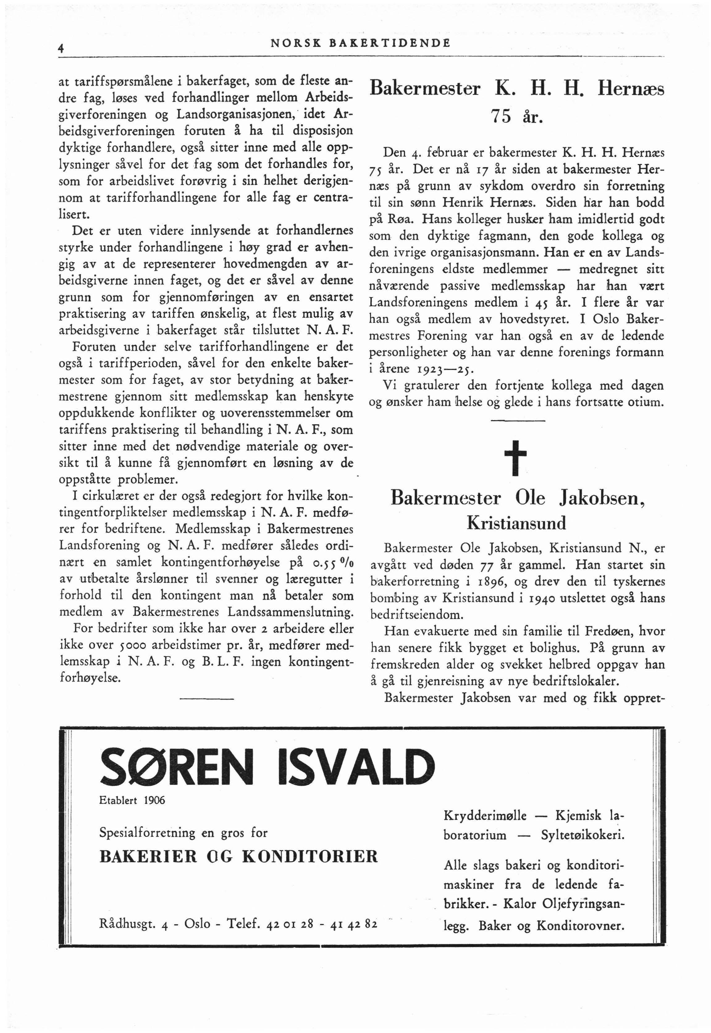 Den 4. februar er bakermester K. H. H. Hernæs 7 5 år. Det er nå 17 år siden at bakermester Hernæs på grunn av sykdom overdro sin forretning til sin sønn Henrik Hernæs. Siden har han bodd på Røa. Hans kolleger husker ham imidlertid godt som den dyktige fagmann, den gode kollega og den ivrige organisasjonsmann. Han er en av Landsforeningens eldste medlemmer - medregnet sitt nåværende passive medlemsskap har han vært Landsforeningens medlem i 45 år. I flere år var han også medlem av hovedstyret. I Oslo Bakermestres Forening var han også en av de ledende personligheter og han var denne forenings formann i årene 1923-25.