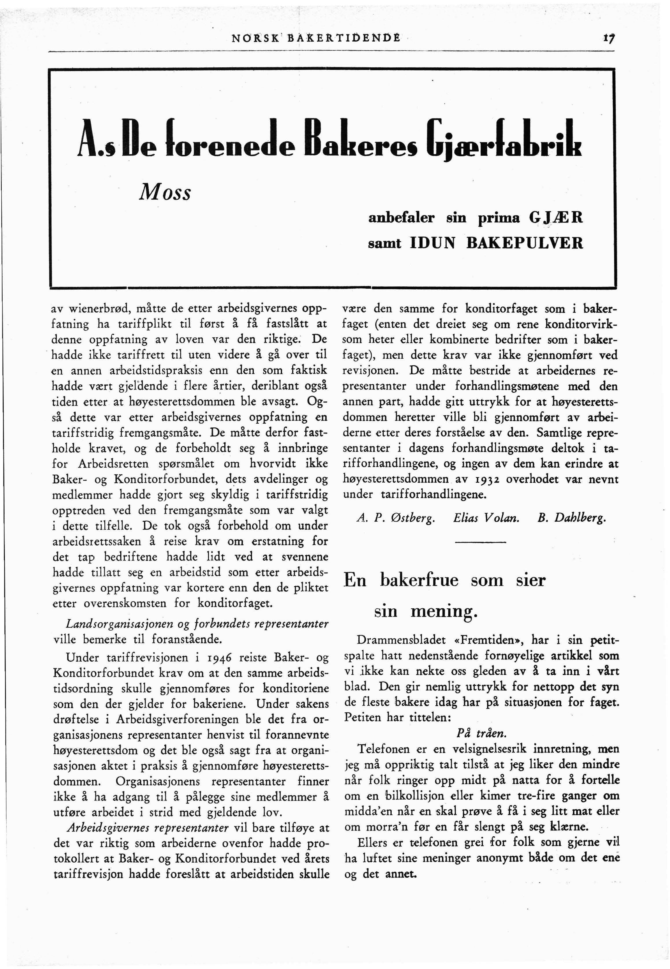 Under tariffrevisjonen i 1946 reiste Baker- og Konditorforbundet krav om at den samme arbeidstidsordning skulle gjennomføres for konditoriene som den der gjelder for bakeriene. Under sakens drøftelse i Arbeidsgiverforeningen ble det fra organisasjonens representanter henvist til forannevnte høyesterettsdom og det ble også sagt fra at organisasjonen aktet i praksis å gjennomføre høyesterettsdommen. Organisasjonens representanter finner ikke å ha adgang til å pålegge sine medlemmer å utføre arbeidet i strid med gjeldende lov.