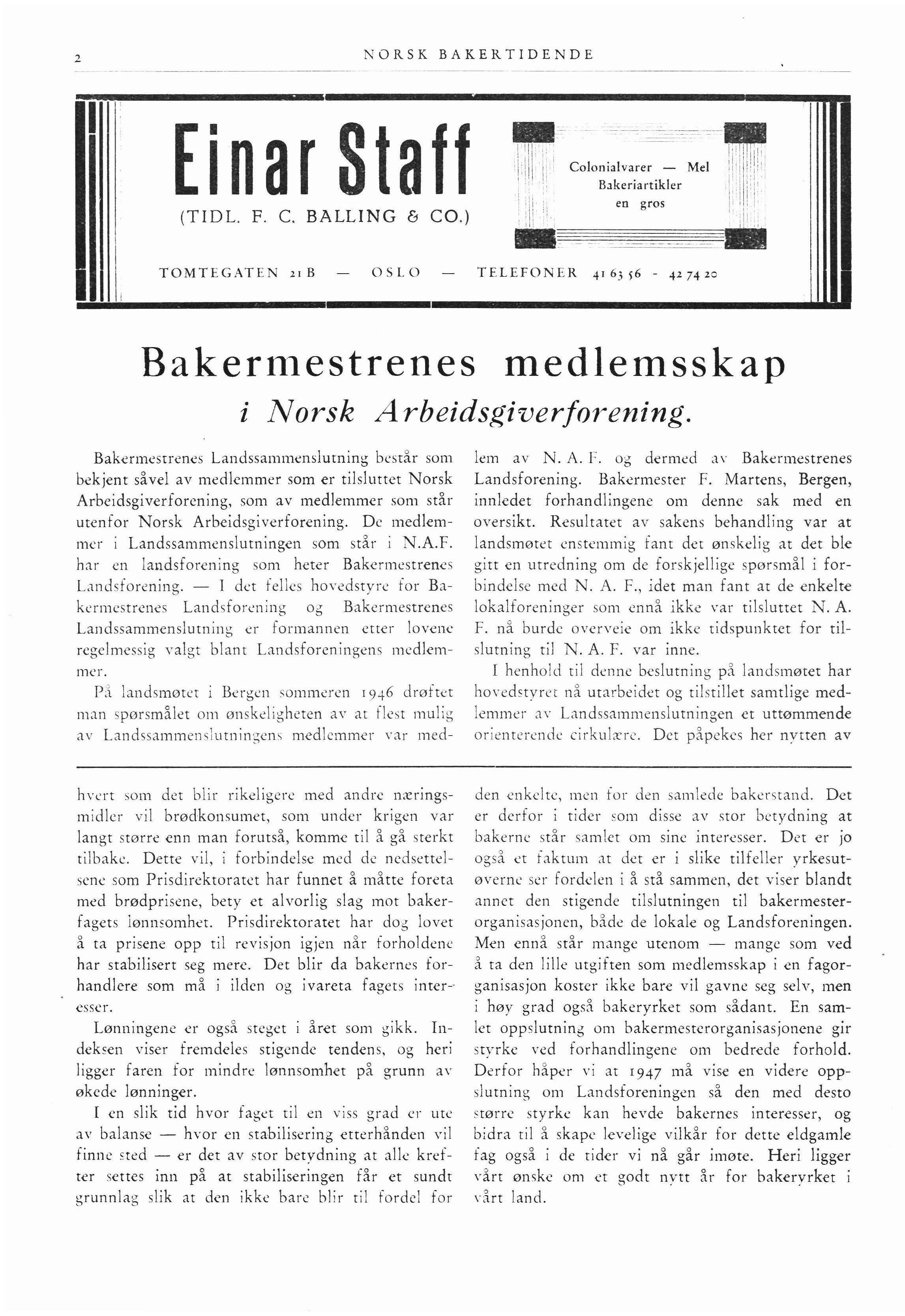 Det er uten videre innlysende at forhandlernes styrke under forhandlingene i høy grad er avhengig av at de representerer hovedmengden av arbeidsgiverne innen faget, og det er såvel av denne grunn som for gjennomføringen av en ensartet praktisering av tariffen ønskelig, at flest mulig av arbeidsgiverne i bakerfaget står tilsluttet N. A. F.