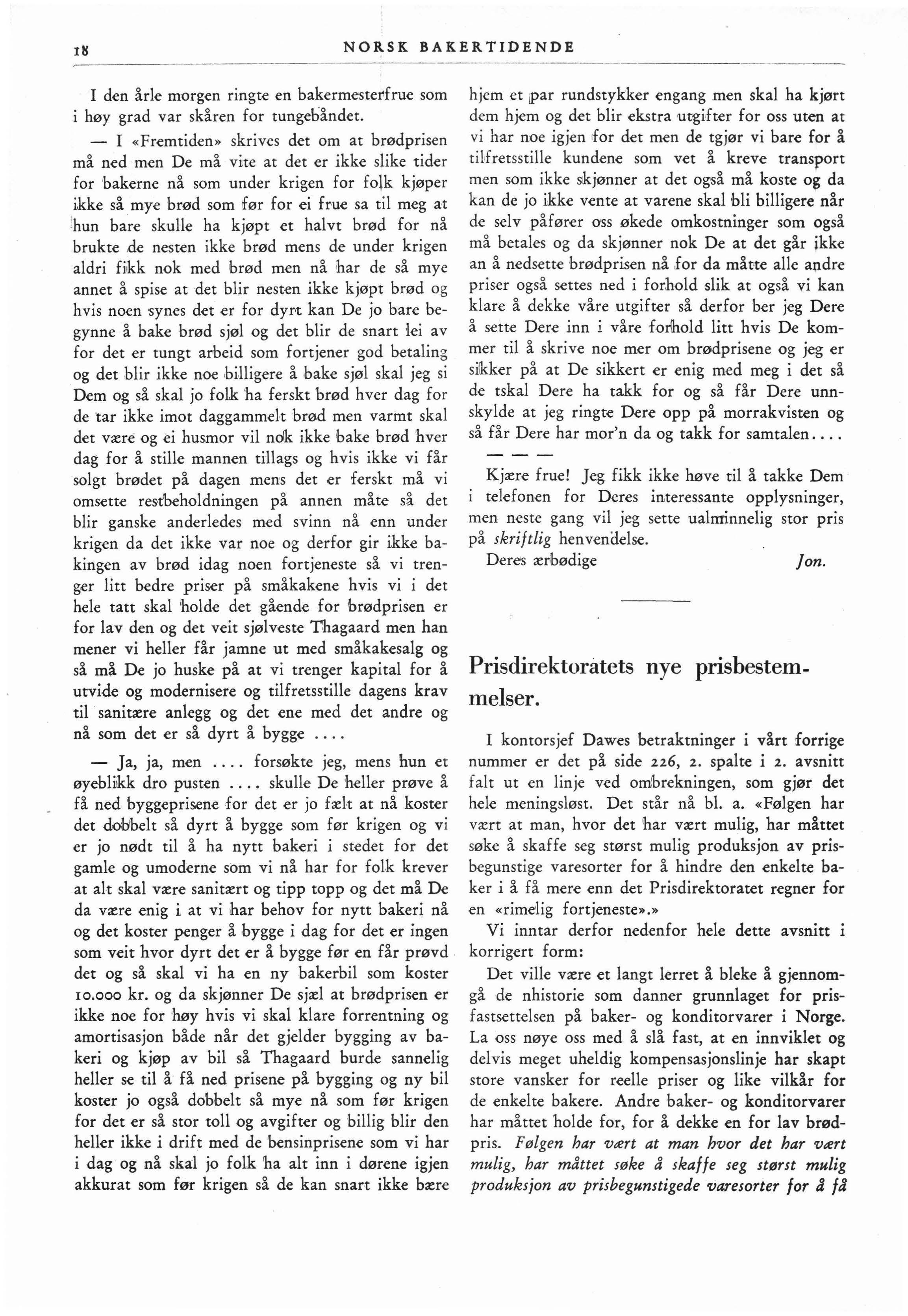 Det ville være et langt lerret å bleke å gjennomgå de nhistorie som danner grunnlaget for prisfastsettelsen på baker- og konditorvarer i Norge. La oss nøye oss med å slå fast, at en innviklet og delvis meget uheldig kompensasjonslinje har skapt store vansker for reelle priser og like vilkår for de enkelte bakere. Andre baker- og konditorvarer har måttet holde for, for å dekke en for lav brødpris. Følgen har vært at man hvor det har vært mulig, har mJttet søke J skaffe seg størst mulig produksjon av pris begunstigede varesorter for å få