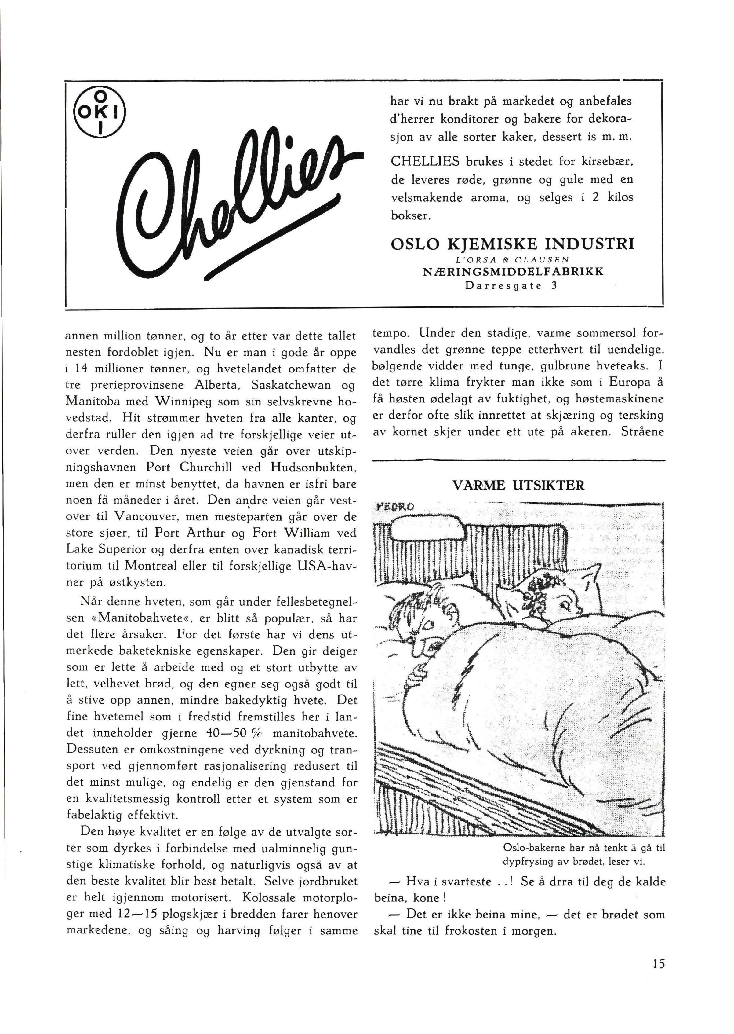 Når denne hveten , som går under fellesbetegnelse n « Manitobahvete «, er blitt så populær, så har det flere årsaker. For det første har vi dens utmerkede baketekniske egenskaper Den gir deiger s om er lette å arbeide med og et stort utbytte av lett, velhevet brød, og den egner seg også godt til å stive opp annen , mindre bakedyktig hvete Det fine hvetemel som i fredstid fremstilles her i landet inneholder gjerne 40-50 % manitobahvete. Dessuten er omkostningene ved dyrkning og trans port ved gjennomført rasjonalisering redusert til det minst mulige, og endelig er den gjenstand for en kvalitetsmessig kontroll etter et system som er fabelaktig effektivt.
