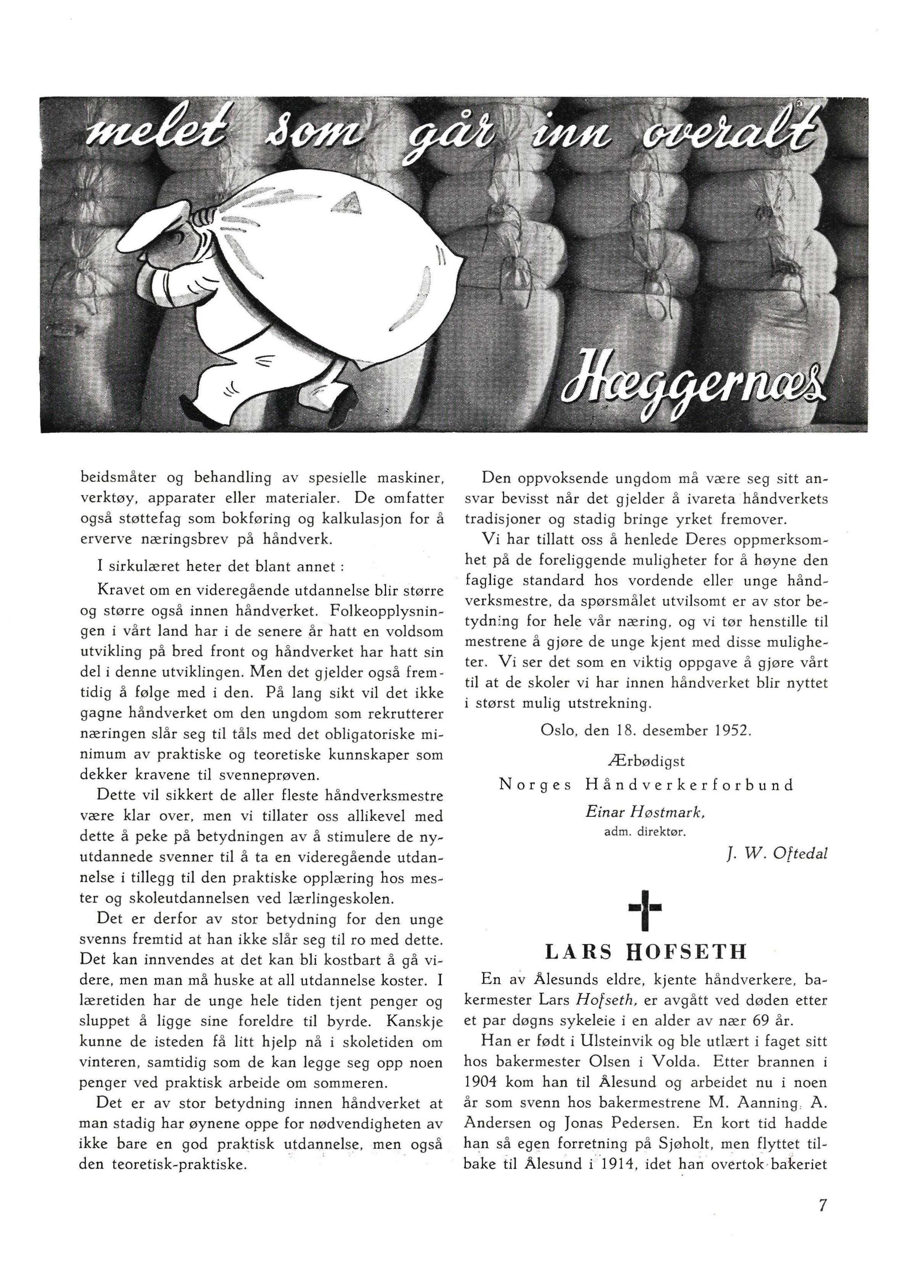 Skal jeg bringe et ønske for bakerne i det nye år måtte det være at det må lykkes for vårt energiske styre å bedre dette forhold og først og fremst at det må komme et resultat av styrets arbeide for å oppnå en bedring i prisen på wienerbrød hvor misforholdet såvidt jeg kan skjønne i dag er størst.