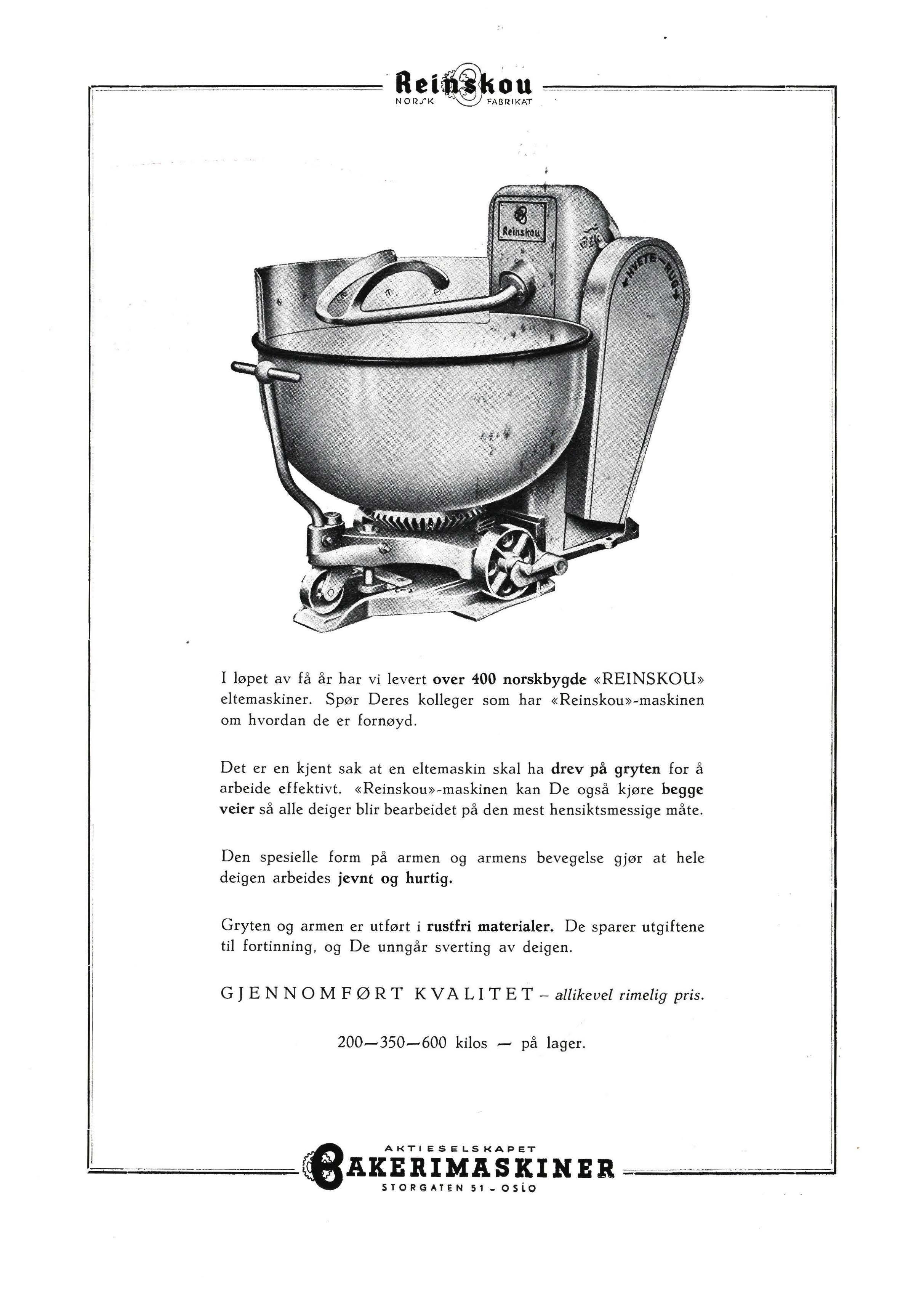 Jeg har søkt å vurdere hvor stor bakningsgodtgjørelse vi har på det alminnelige wienerbrød sammenlignet med i september 1940. Med «bakningsgodtgjørelse» mener jeg i dette tilfelle : utsalgspris fratrukket omsetningsavgift og råstoffer. Jeg kommer da til at vi i vår bedrift i dag kun har 20 a 25 <;c høyere bakningsgodtgjørelse enn i september 1940. At dette er meget for litet i forhold til utgiftsøkningene siden den tid skulle ikke trenge nærmere påvisning. Men jeg skal allikevel nevne noen omkostningsarter - og stigningen.
