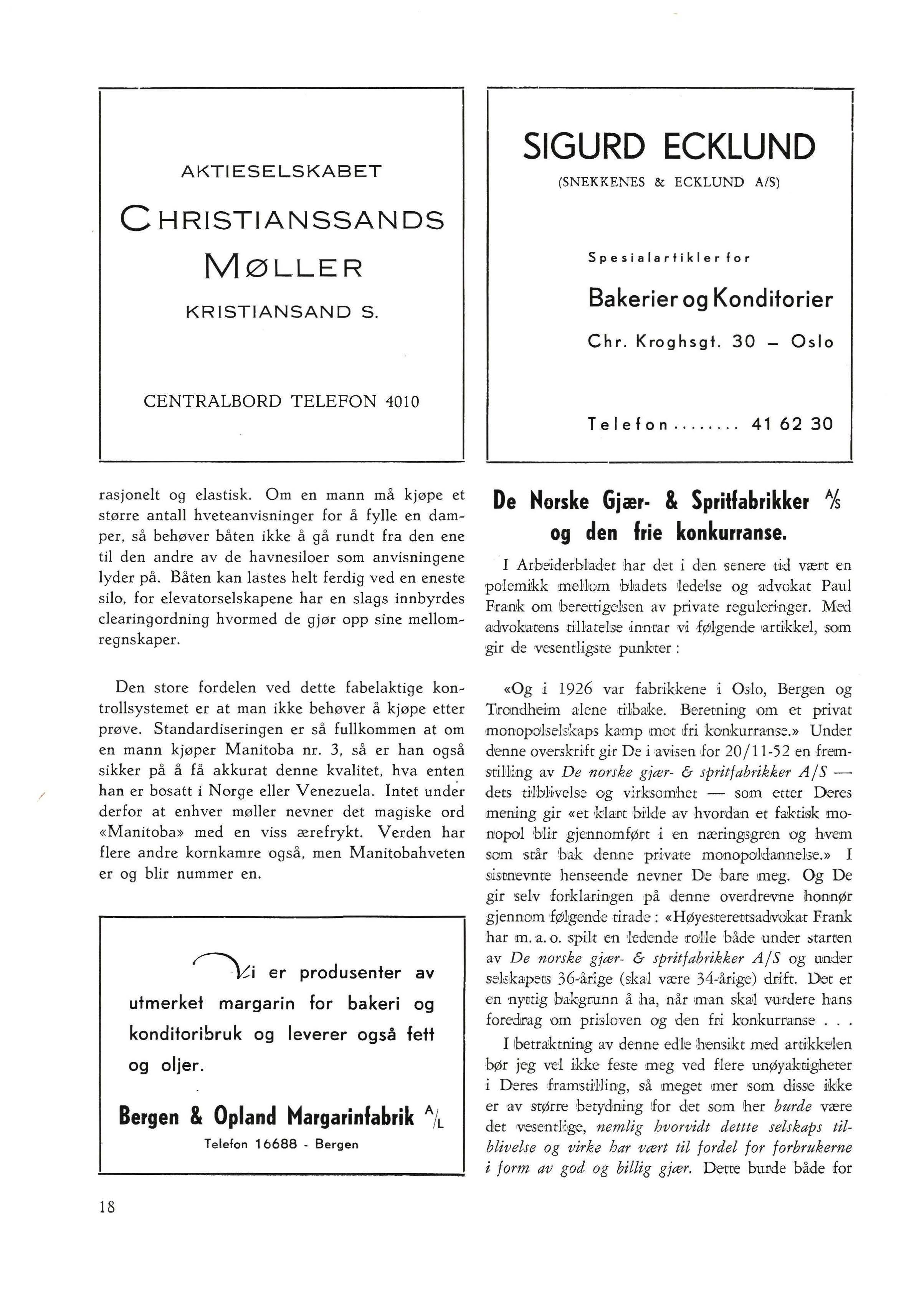«Og i 1926 var fabrikkene i Osfo, Bergm og Tirondheiim a-lene tilbake. B ere tning o m et privat monopohd:; ikaps kamp imot fri konkurran:se.» Under denne overskri,ft gir De i avisen for 20 / 11-5 2 en .fretmS'tilEn,g av De norske gjær- & spritfabrikker A/Sdets ,ci,Ib,livdse og vi,rksomhet - som etter Deres men'iing gir «et tkla11t rbiMe av hvord'æn et fak,til9k monopol bili,r gjennomført i en næring,s,gren og hvem som står 1bak denn e pr,ivac-e m o nopo1dai1mds1e.» I siis,cll'evme henseende nevner De baæ meg. Og De gir 1sdv forklaringen på denne overdrevne honnør gjenncim ,føligende tiræde: «Høyes:terentsadvokat Frank 'har m. a. o. :s:pi:1t en '1edenide 1ro11il,e håde under starten av De norske gjær- & spritfabrikker A/S og und,er selsbpevs 36-årige (skal være 34-år:ige) drift. Det er en nyttig bakgrunn å ha, når man skæl vurdere hans foredtmg om prislnven og den fri konkurra:ns1e