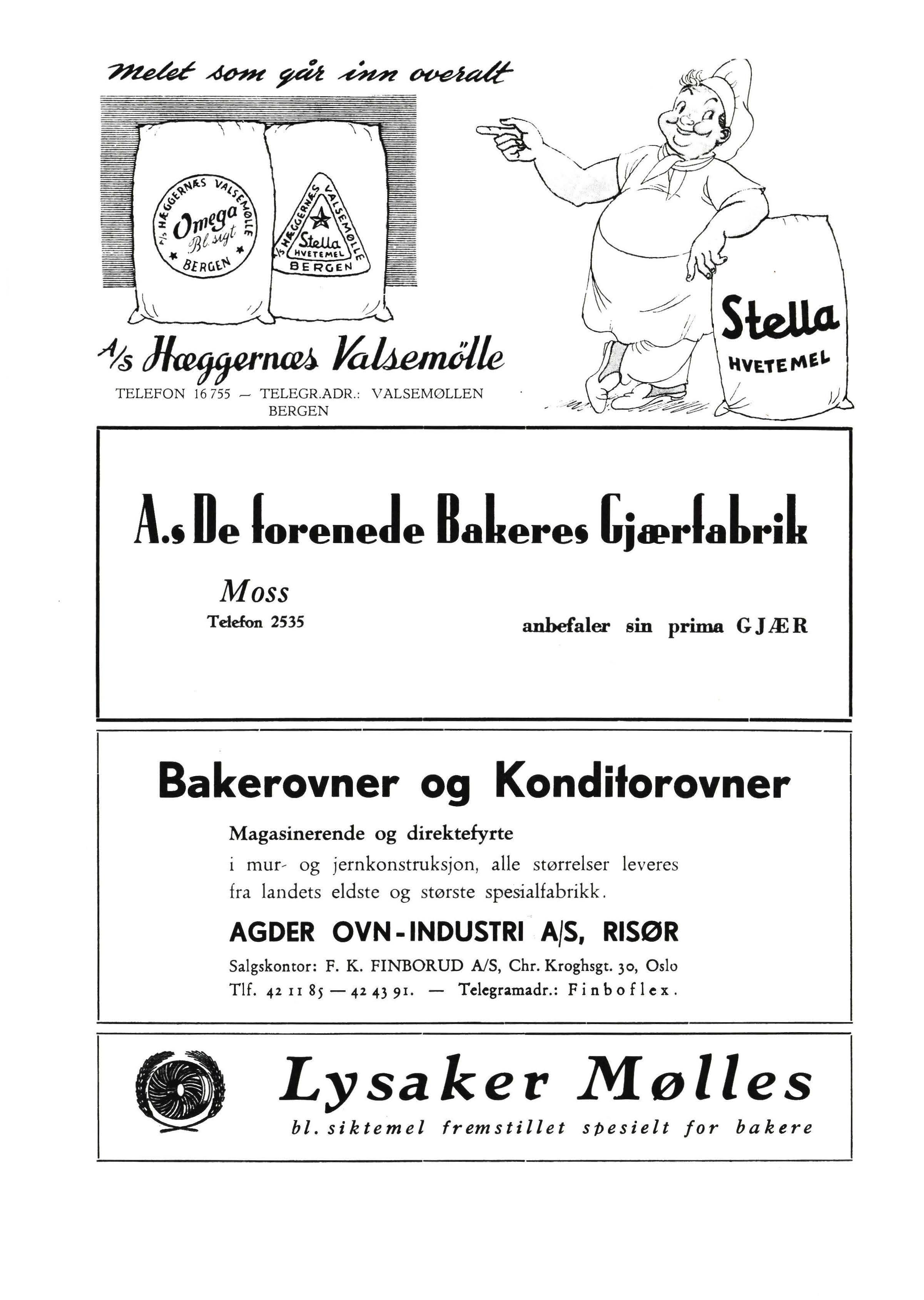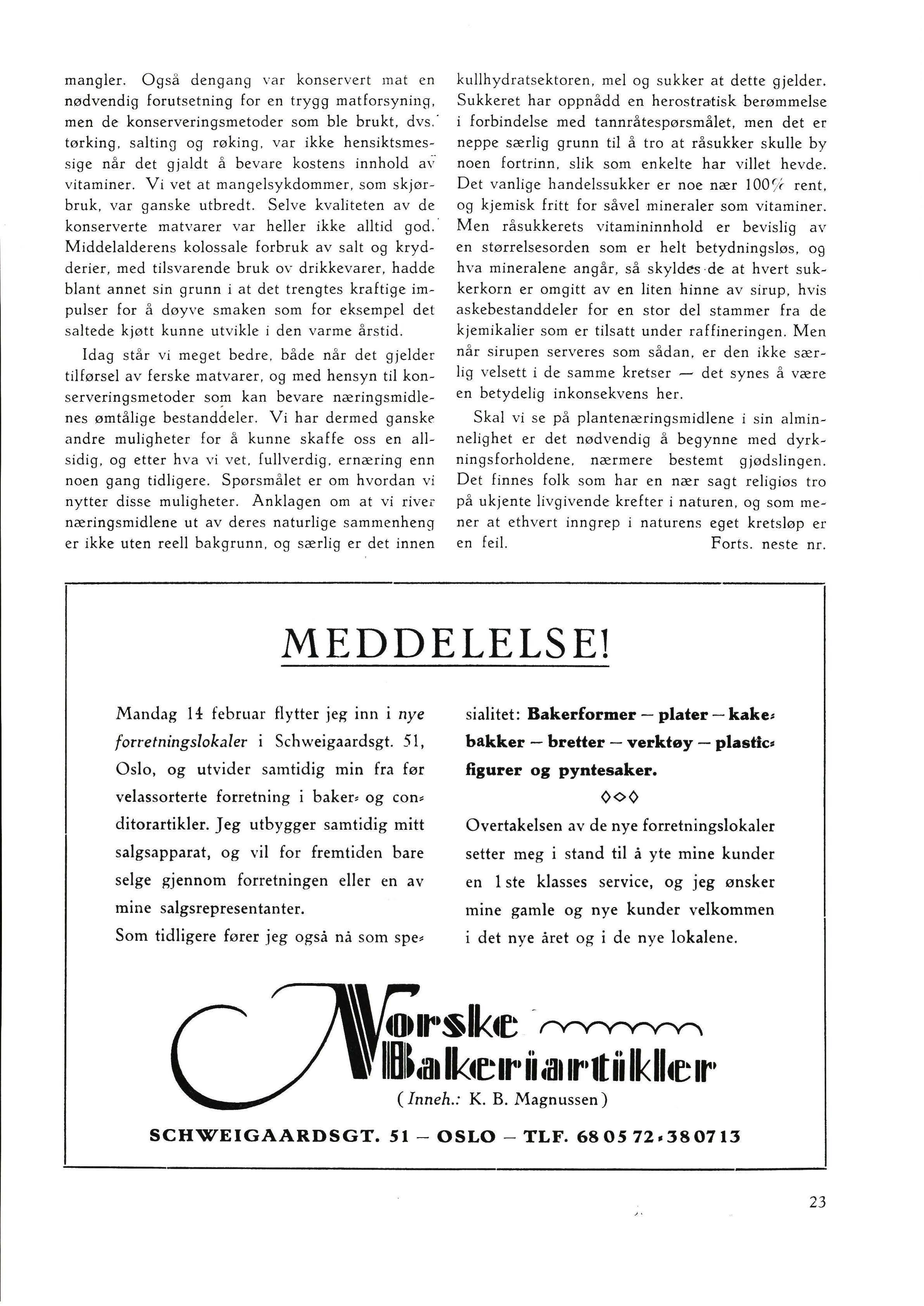 Mandag 14 februar flytter jeg inn i nye forretningslokaler Schweigaardsgt. 51, Oslo, og utvider samtidig min fra før velassorterte forretning i baker, og con• ditorartikler. Jeg utbygger samtidig mitt salgsapparat, og vil for fremtiden bare selge gjennom forretningen eller en av mme salgsrepresentanter. Som tidligere fører jeg også nå som spe•