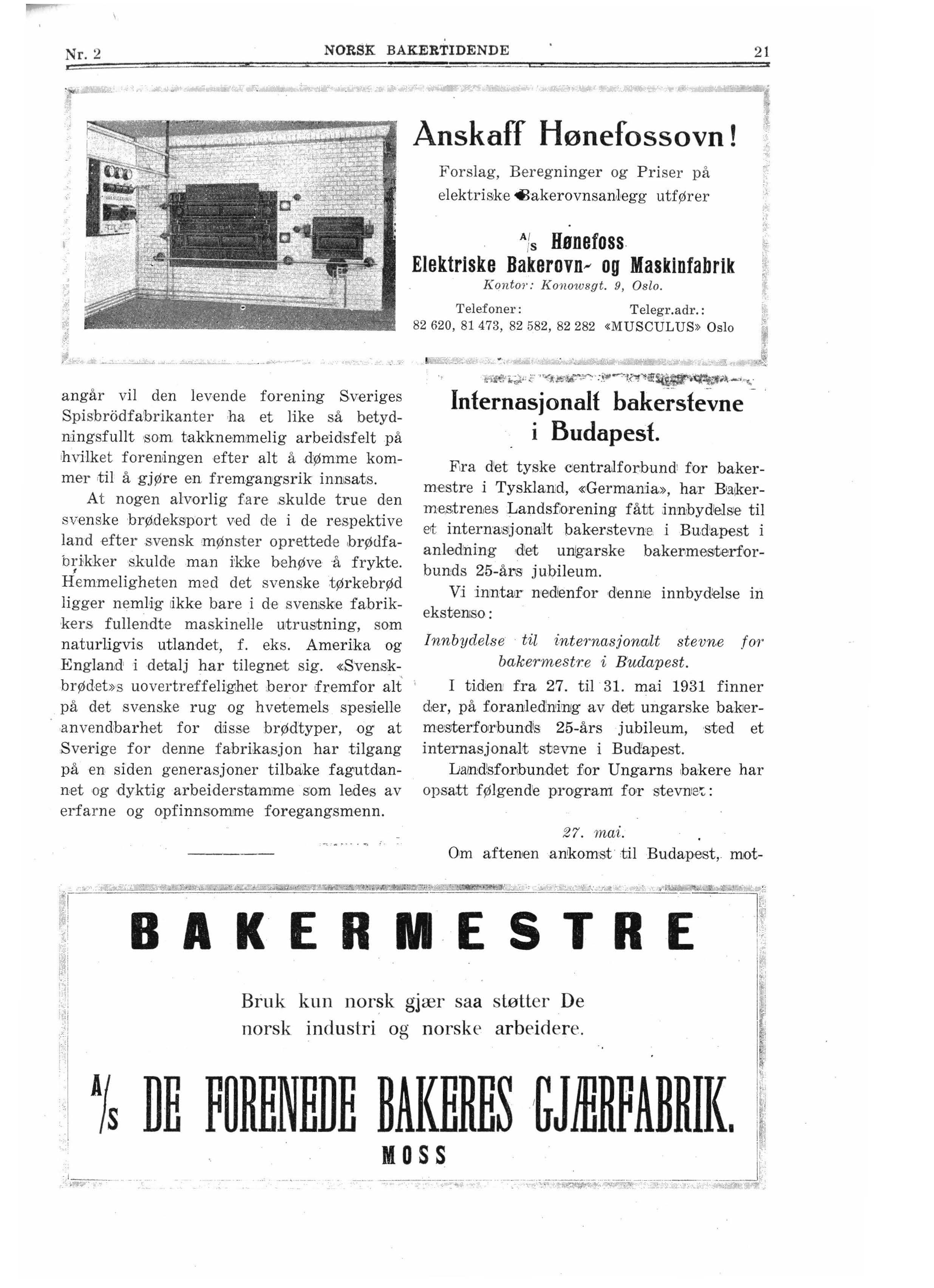 I nnhold: Bak e rmester Martin Oanæ s t - - Bakerm es ter Th. G. Siver tsen t. - -Den ·sve nsk e brØdproduksjcns egenarter. - In ternas jon a l t bakentevne i Budapest - Oslo Bak er me stres For ening - H ovedstyre møte - Mark ed sovers ikt - Råstoffspalte.