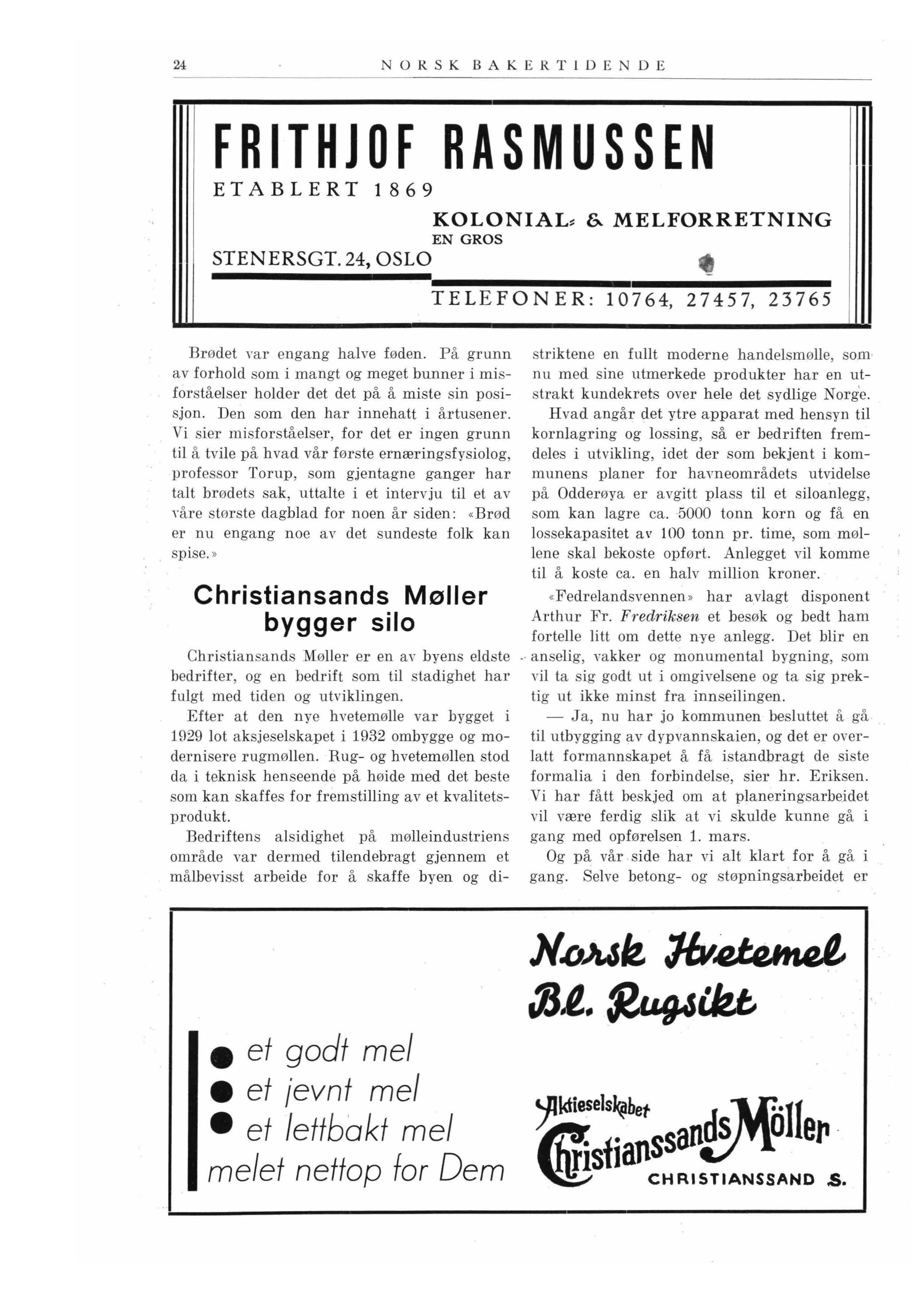 Vi sender kun ut mel som er anal y sert o g prø v ebakt v ed Bakerlaboratoriet , Statens Teknolog. Institutt. Adr. STENERSGT . 10 - Tlf. 16293, 15281 , 14474