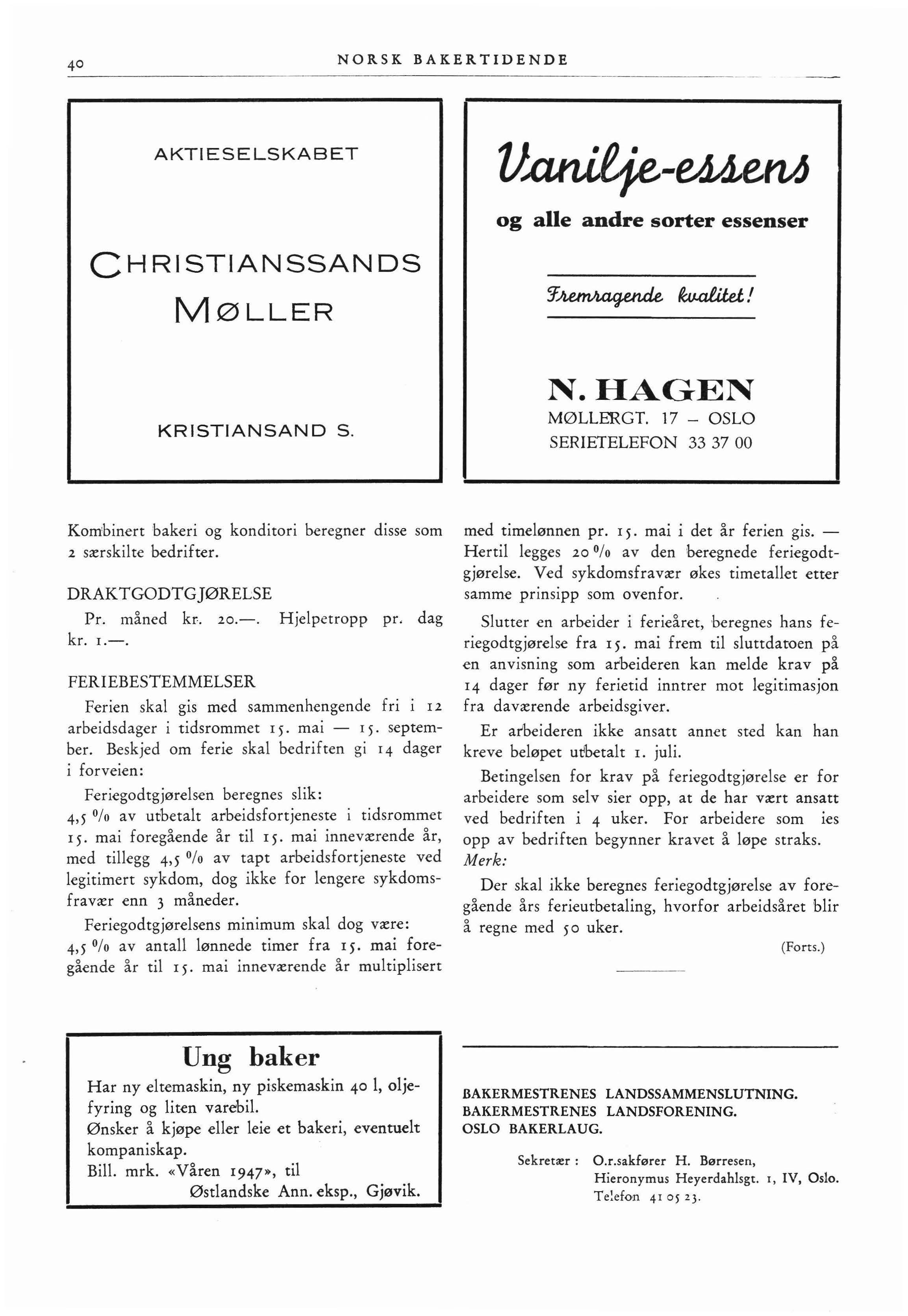 Oslo Bakerlaugs energiske formann, Eugen Gundersen, har tatt initiativet til utgivelsen av et lite hefte for Oslo Bakerlaugs medlemmer med lønnstariffer og bestemmelser angående arbeidsforhold som gjelder for Oslo. Heftet, som - vi hadde nær sagt selvfølgelig - er utarbeidet av kontorsjef A. Dawes, utfyller et lenge følt savn, og den greie oversiktlige form det har fått skyldes ikke minst kontorsjef Dawes' store innsikt og inngående kjennskap til hvor skoen trykker, når det gjelder disse ting. I heftet finner en rubrikker for lønninger, med plass for tariffrevisjoner, rubrikker for svenner med personlige tillegg med utregnet dyrtidstillegg, lønninger for kjørere, visergutter kontorfunksjonærer og andre funksjonærer - alt greit og oversiktlig ordnet. Foruten de vanlige lønnstariffer finnes imidlertid en hel rekke bestemmelser, som det ofte kan være vanskelig å ha full oversikt over. I heftet er disse tatt med, og i løpet av et øyeblikk vil man, med heftet i hånden, ha de opplysninger som er nødvendige, i praktisk talt enhver forekommende situasjon.