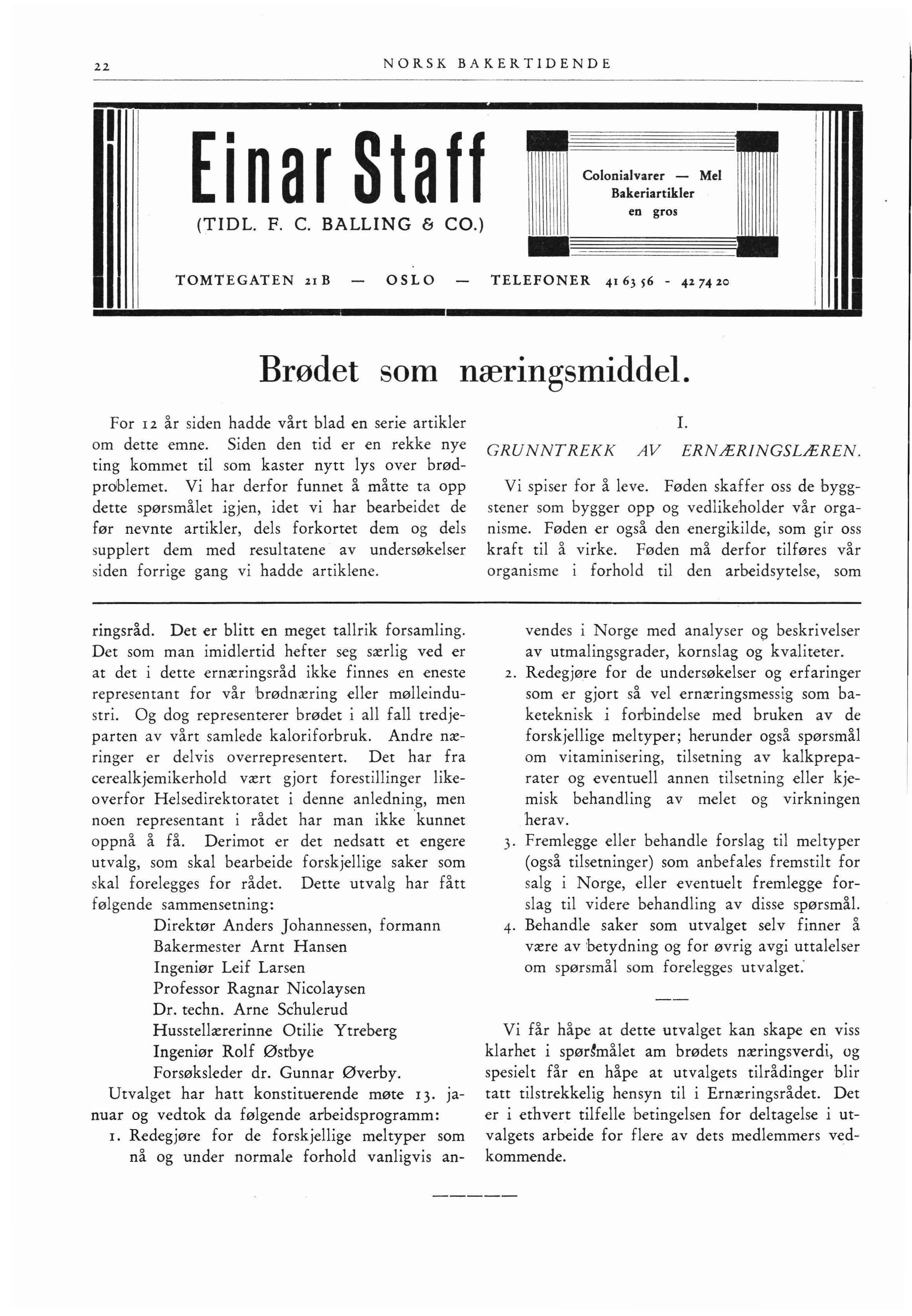 Vi får håpe at dette utvalget kan skape en viss klarhet i spødmålet am brødets næringsverdi, og spesielt får en håpe at utvalgets tilrådinger blir tatt tilstrekkelig hensyn til i Ernæringsrådet. Det er i ethvert tilfelle betingelsen for deltagelse i utvalgets arbeide for flere av dets medlemmers vedkommende.