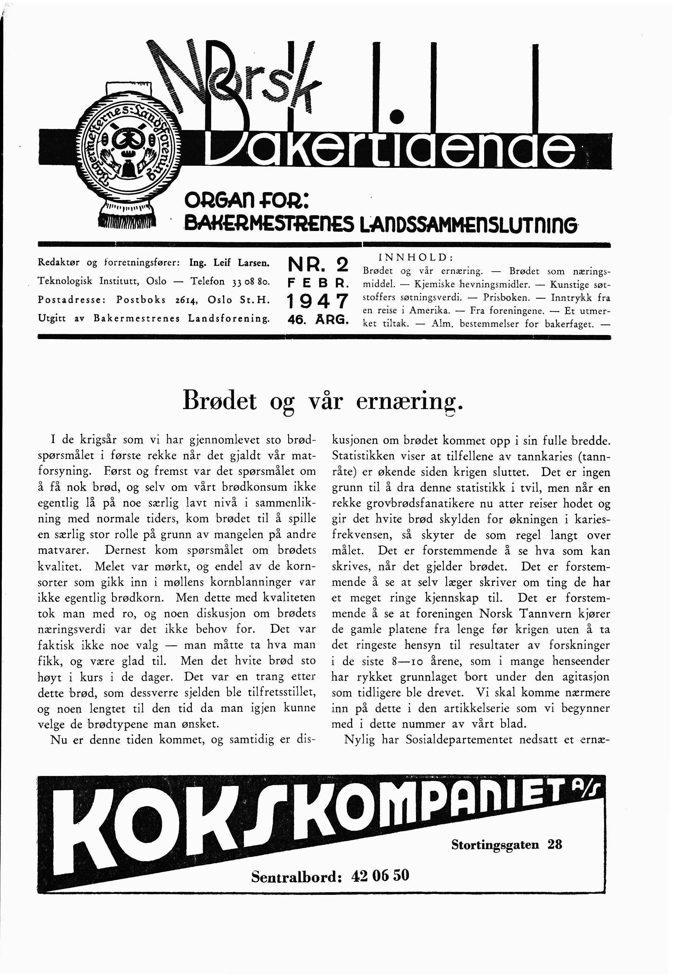 kusjonen om brødet kommet opp i sin fulle bredde. Statistikken viser at tilfellene av tannkaries (tannråte) er økende siden krigen sluttet. Det er ingen grunn til å dra denne statistikk i tvil, men når en rekke grovbrødsfanatikere nu atter reiser hodet og gir det hvite brød skylden for økningen i kariesfrekvensen, så skyter de som regel langt over målet. Det er forstemmende å se hva som kan skrives, når det gjelder brødet. Det er forstemmende å se at selv læger skriver om ting de har et meget ringe kjennskap til. Det er forstemmende å se at foreningen Norsk Tannvern kjører de gamle platene fra lenge før krigen uten å ta det ringeste hensyn til resultater av forskninger i de siste 8-ro årene, som i mange henseender har rykket grunnlaget bort under den agitasjon som tidligere ble drevet. Vi skal komme nærmere inn på dette i den artikkelserie som vi begynner med i dette nummer av vårt blad.