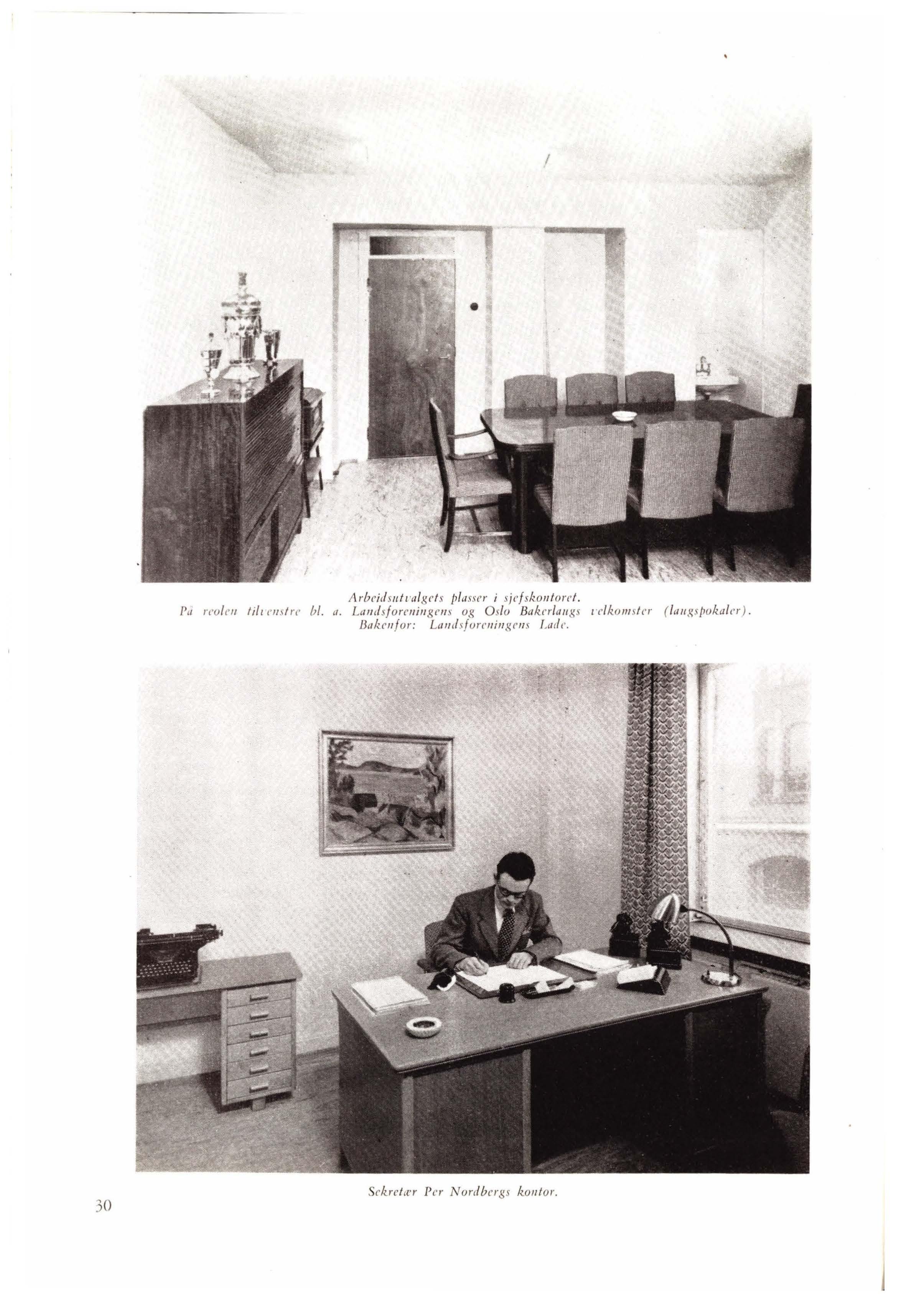 Vi bringe r i dag e n bill ed r eportasje fra La nd sfo rening e ns ny e kontorer. Som kontordame er midlertidig ansatt frk. To ve J ahren som samme n med kontorets leder og sekretær har bendene fulle med å ordne a rkiv er og fø re kartotek At interessen for kontor e r også er sto r fra medlemmenes side viser bes øken e · fr a bakermestre la n det rundt , og i neet er mer e n a turli g enn a t bakere utenfor O slo stikker oppom kontorer n år de e r på besøk i h ove ds taden . Kontoren e er let t å finne , m en fo r sikkerhets skyld skal vi g i følgende a nvi sning: