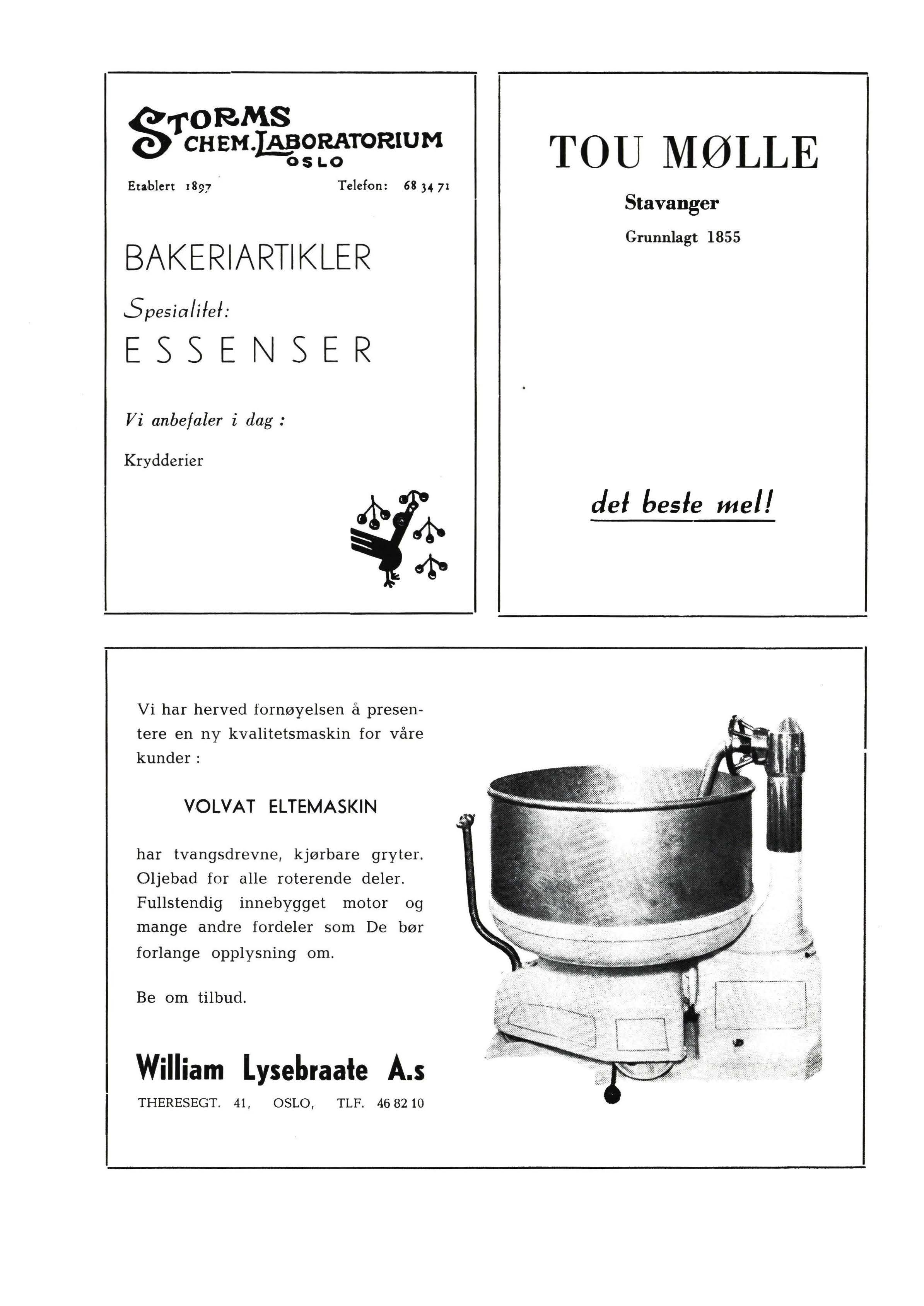 finner sted i tiden 27 / 5-5/6, og vil etter alt å dømme by på alt som man overhodet kan tenke seg av interesse for faget. Prospektene omtaler alle slags råstoffer, fett, hevemidler, essenser og krydderier, marmelader og syltetøy, melkeprodukter, sukkertøy og sjokolade m. m. Særlig fyldig blir utstillingen av bakerimaskiner og ovner, som legger beslag på henholdsvis 31 og 10,50/o av utstillingsantallet. Der vises også kjøle- og fryseanlegg, iskremmaskineri, videre kafe- og butikkinteriører og utstyr til forretninger, emballasje, transportmidler, reklamemateriell og meget annet.