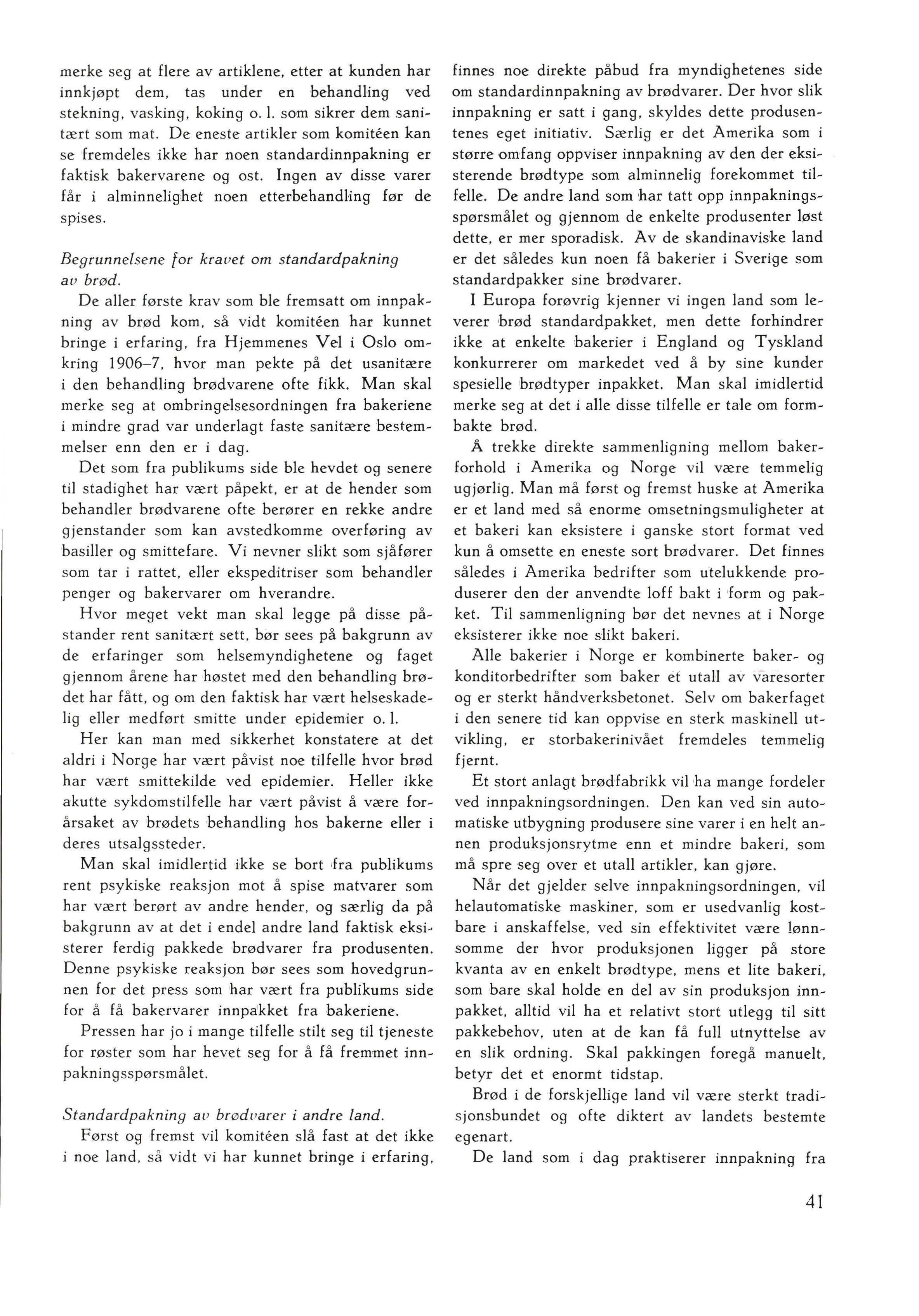 Fra den i sin tid oppnevnte komite, bestående av bakermester Reidar F. Christensen, Gresvik, dr. techn. Arne Schulerud og direktør Dawes, forelå utredningen «Om innpakning av brødvarer fra produsent ». Utredningen gå en utførlig oversikt over de vitenskapelige, faglige og økonomiske problemer som knytter seg til innpakningsspørsmålet.
